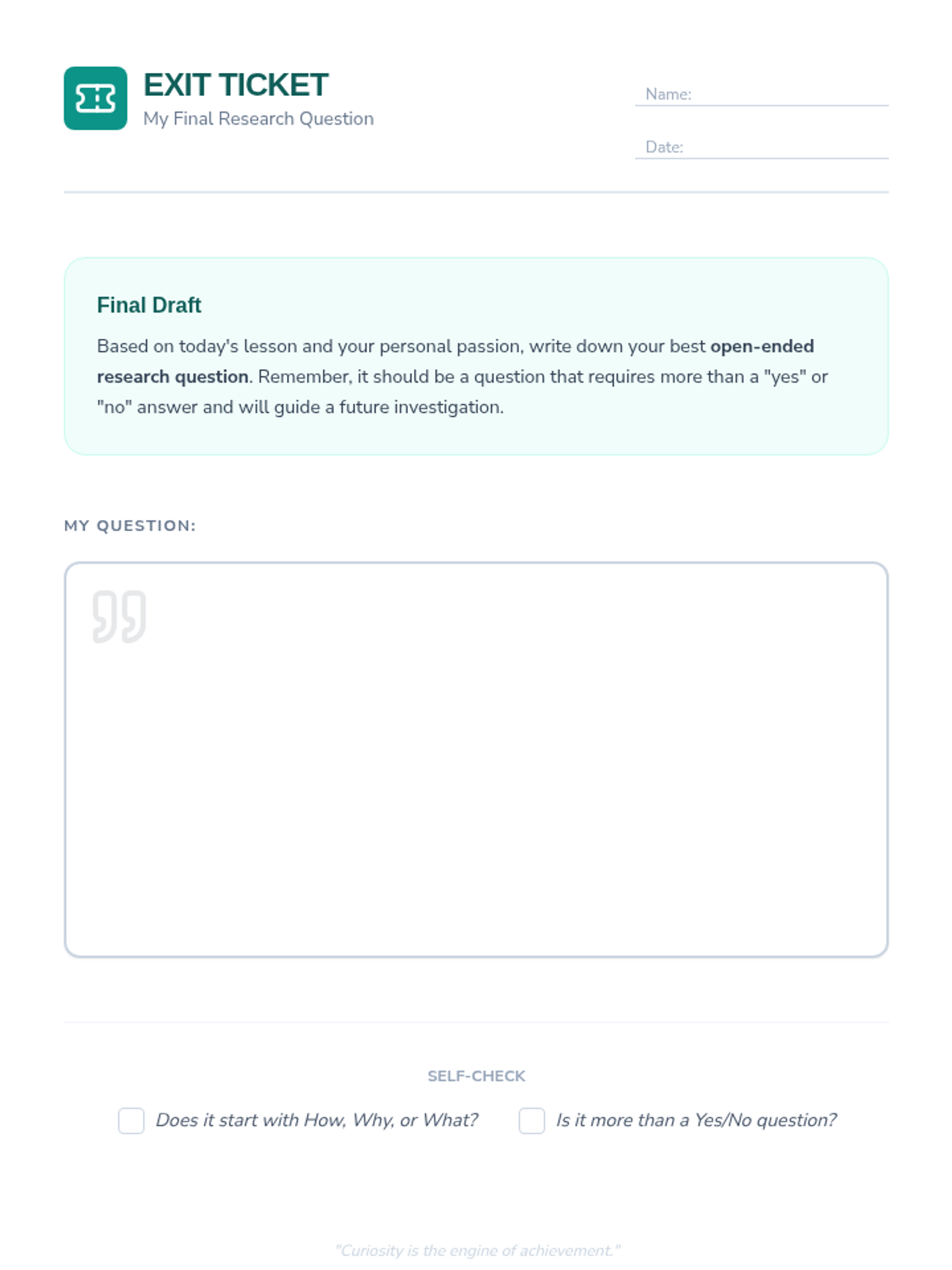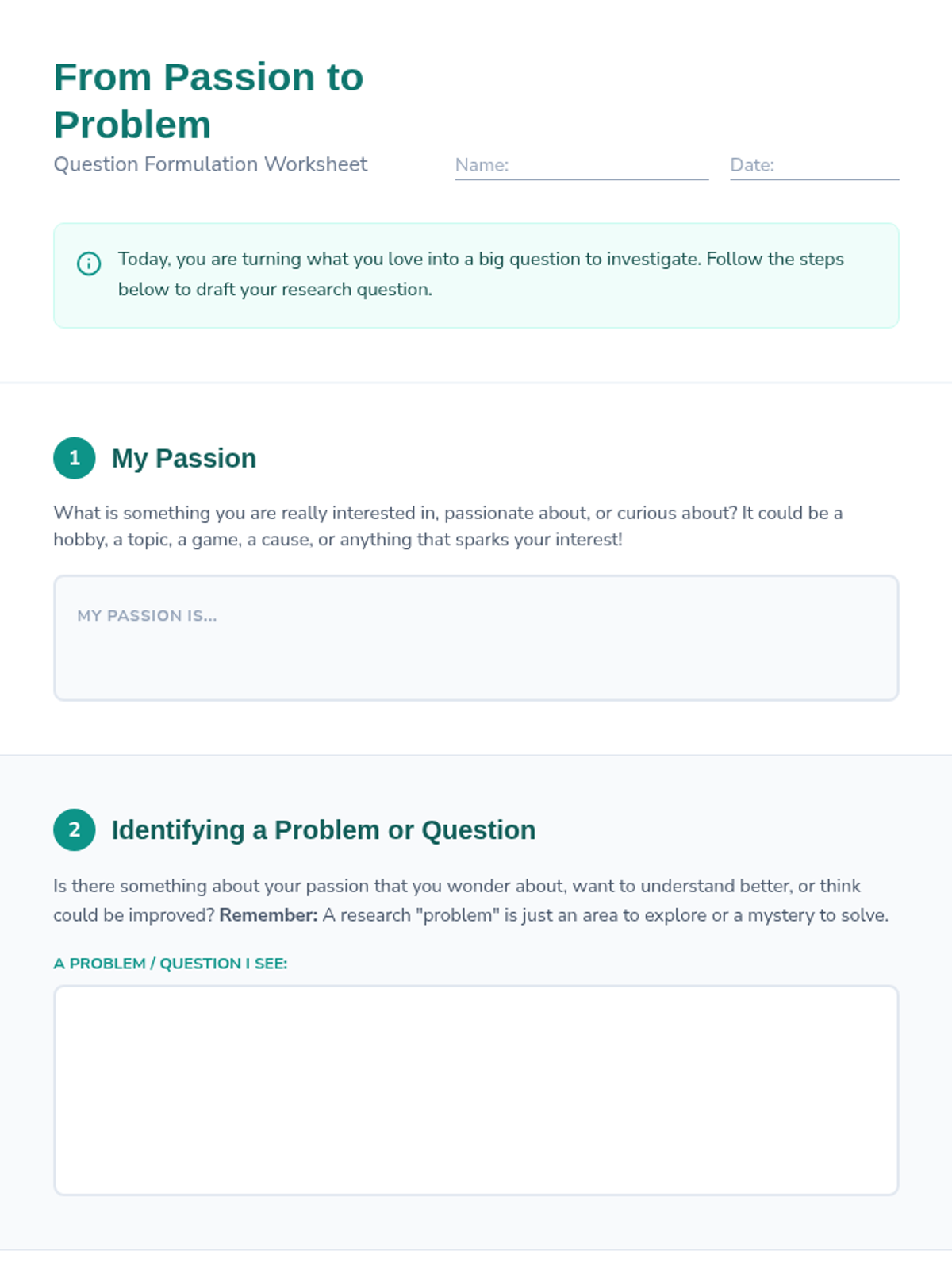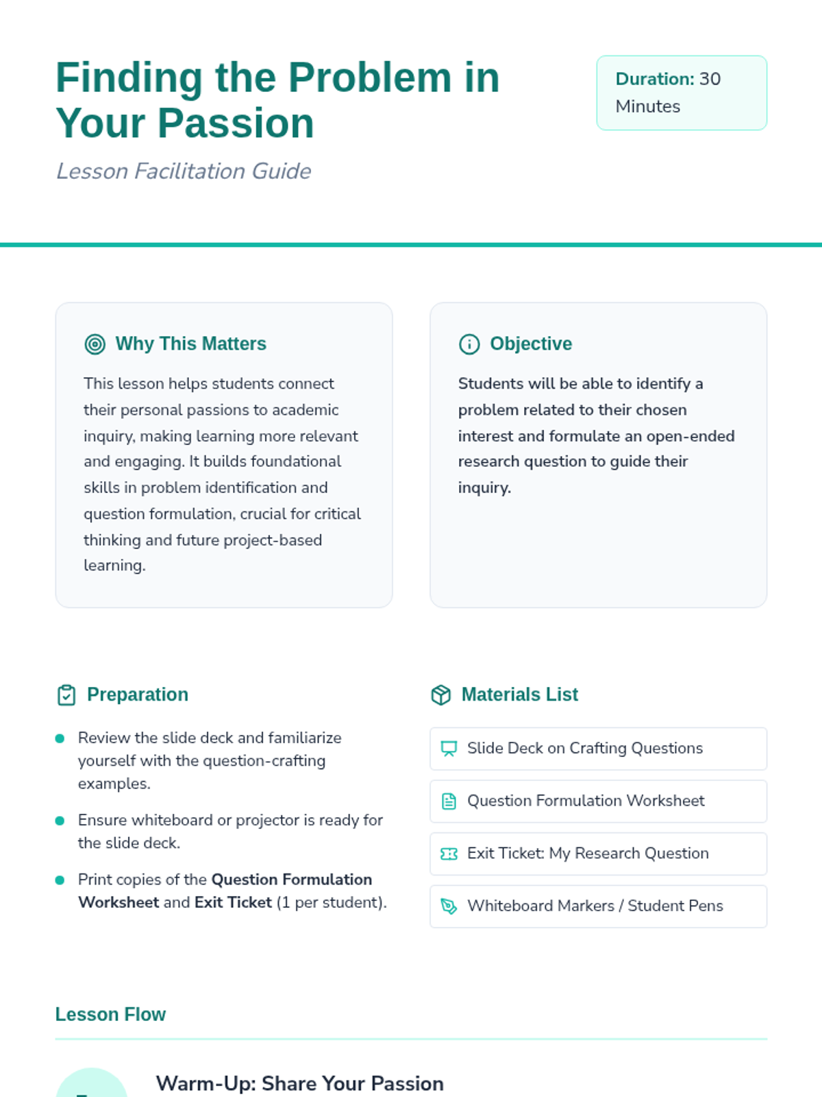 A 30-minute lesson for 6th graders that bridges personal interests with academic inquiry. Students learn to identify researchable 'problems' within their passions and formulate open-ended questions.