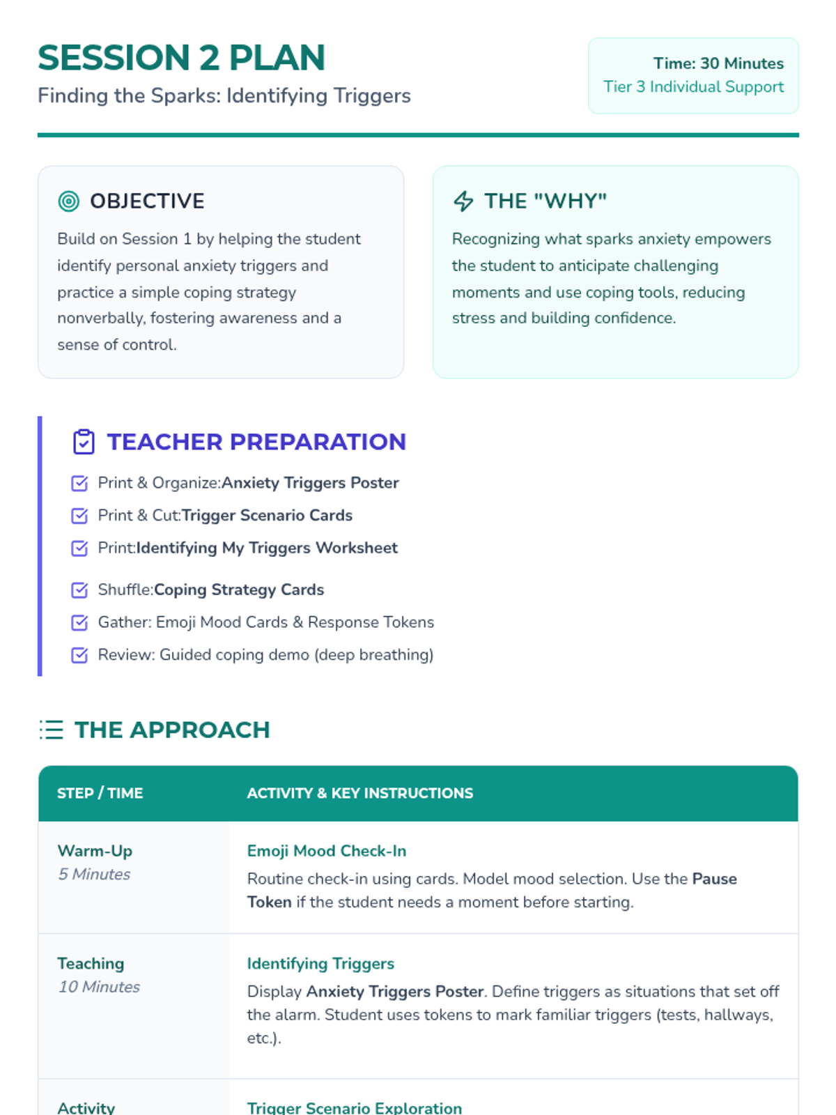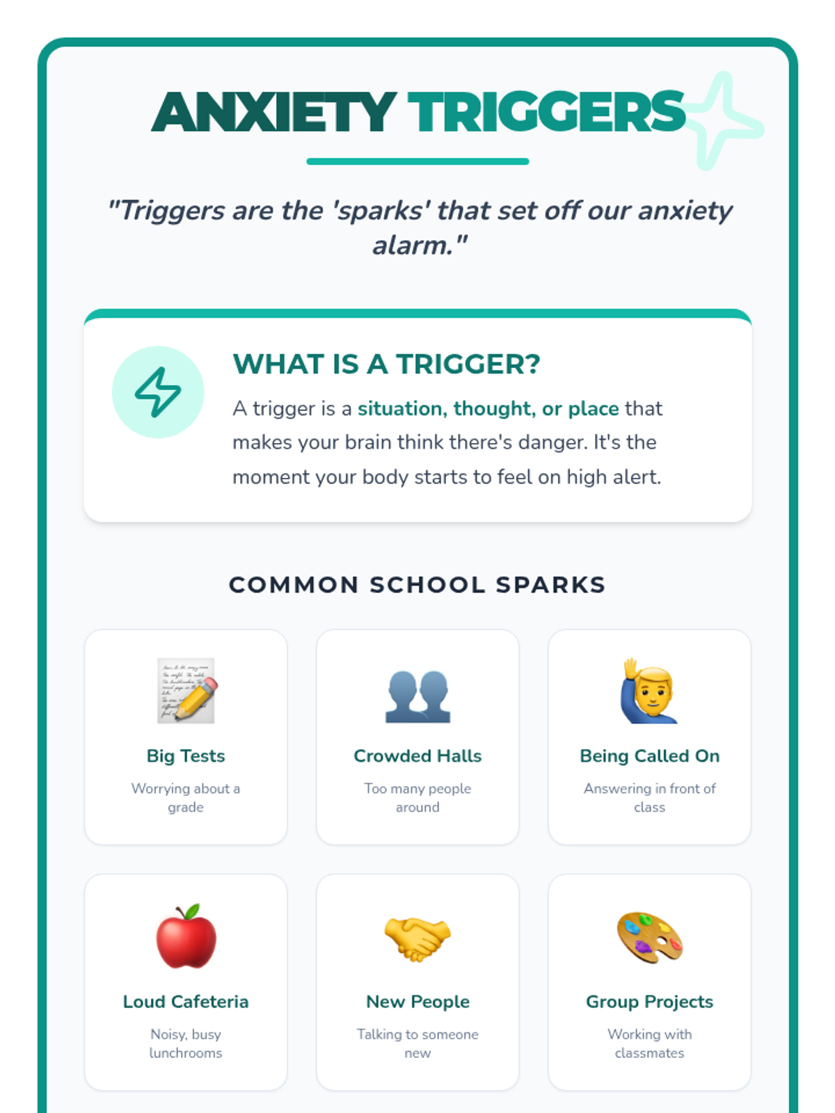 Helps the student identify personal anxiety triggers (situations that set off the 'alarm') and introduces simple nonverbal coping strategies for immediate regulation.