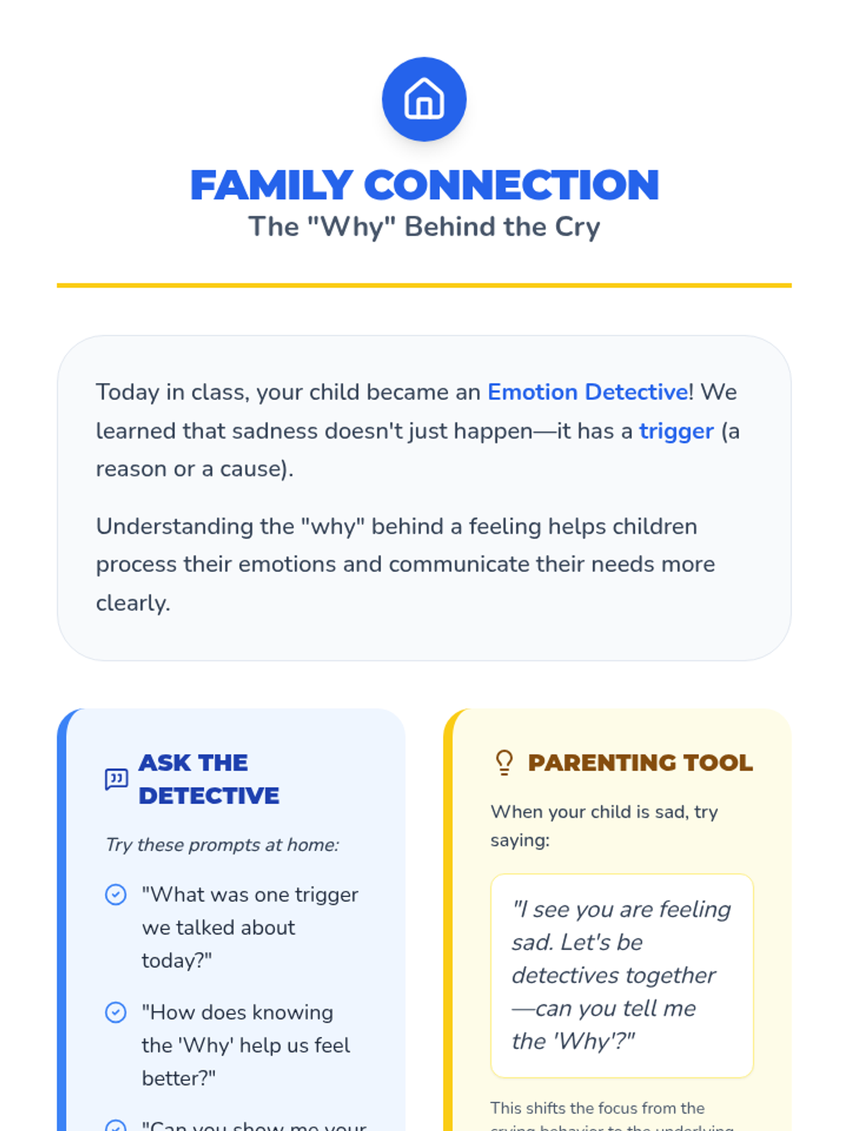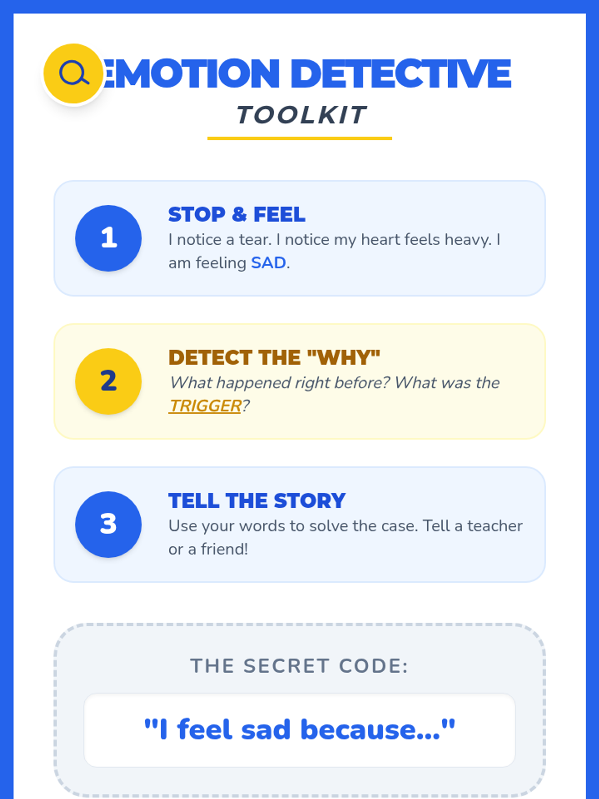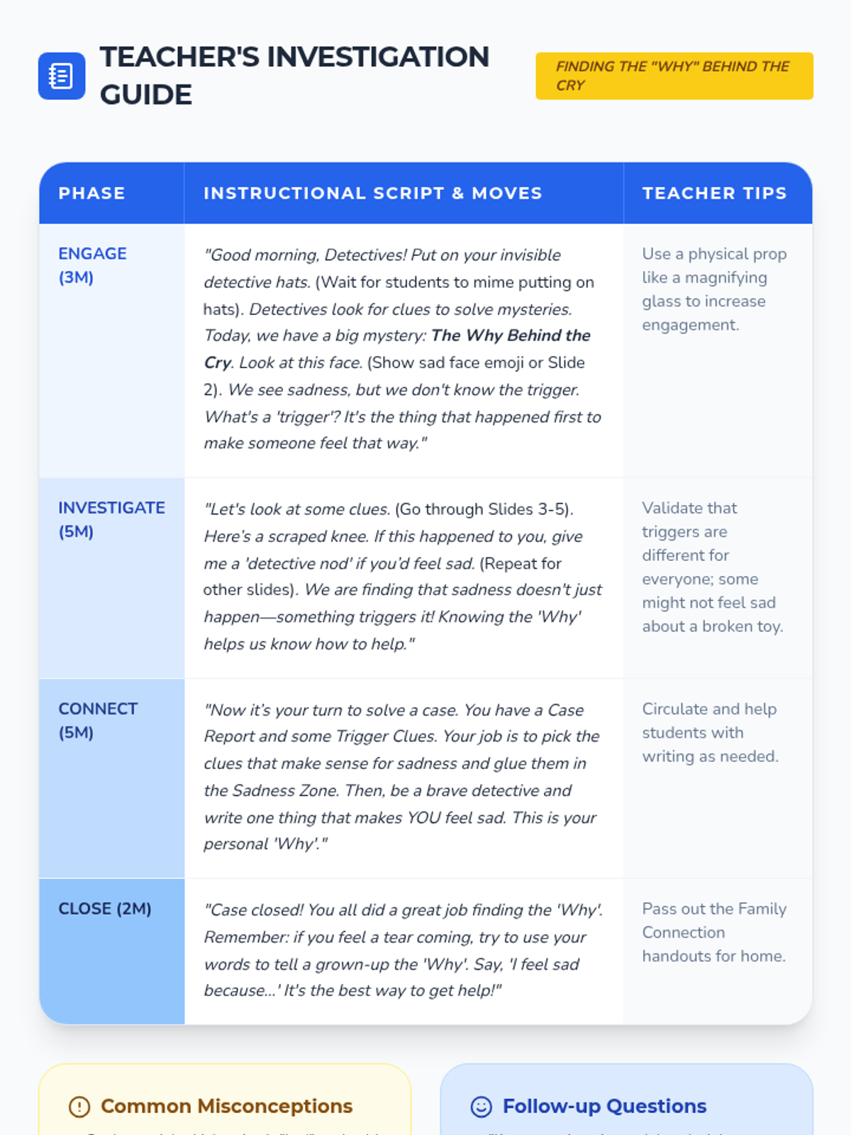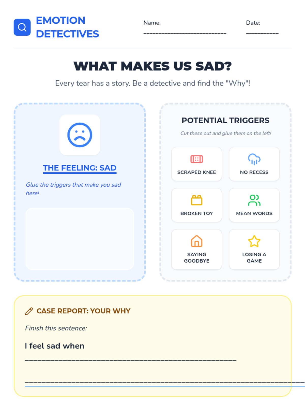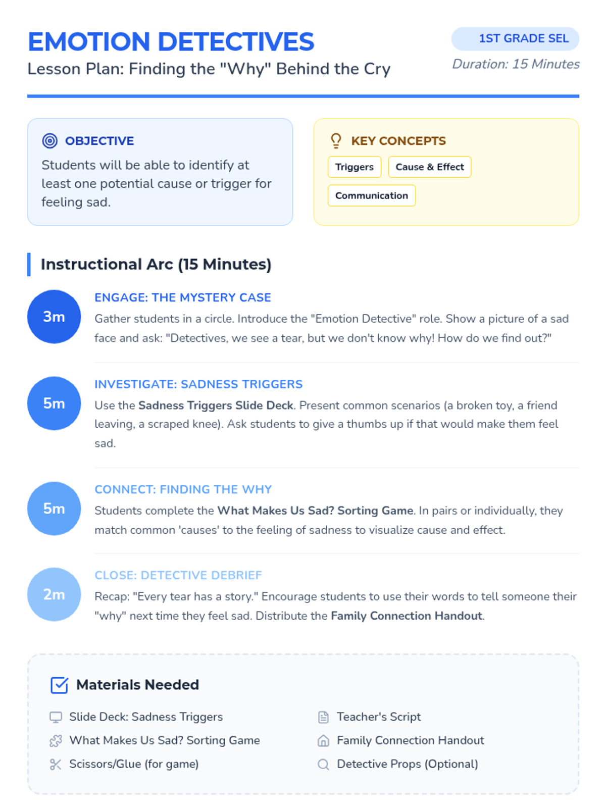 A quick 15-minute social-emotional learning lesson for 1st graders to explore the 'why' behind sadness, helping them identify triggers and connect feelings to causes.