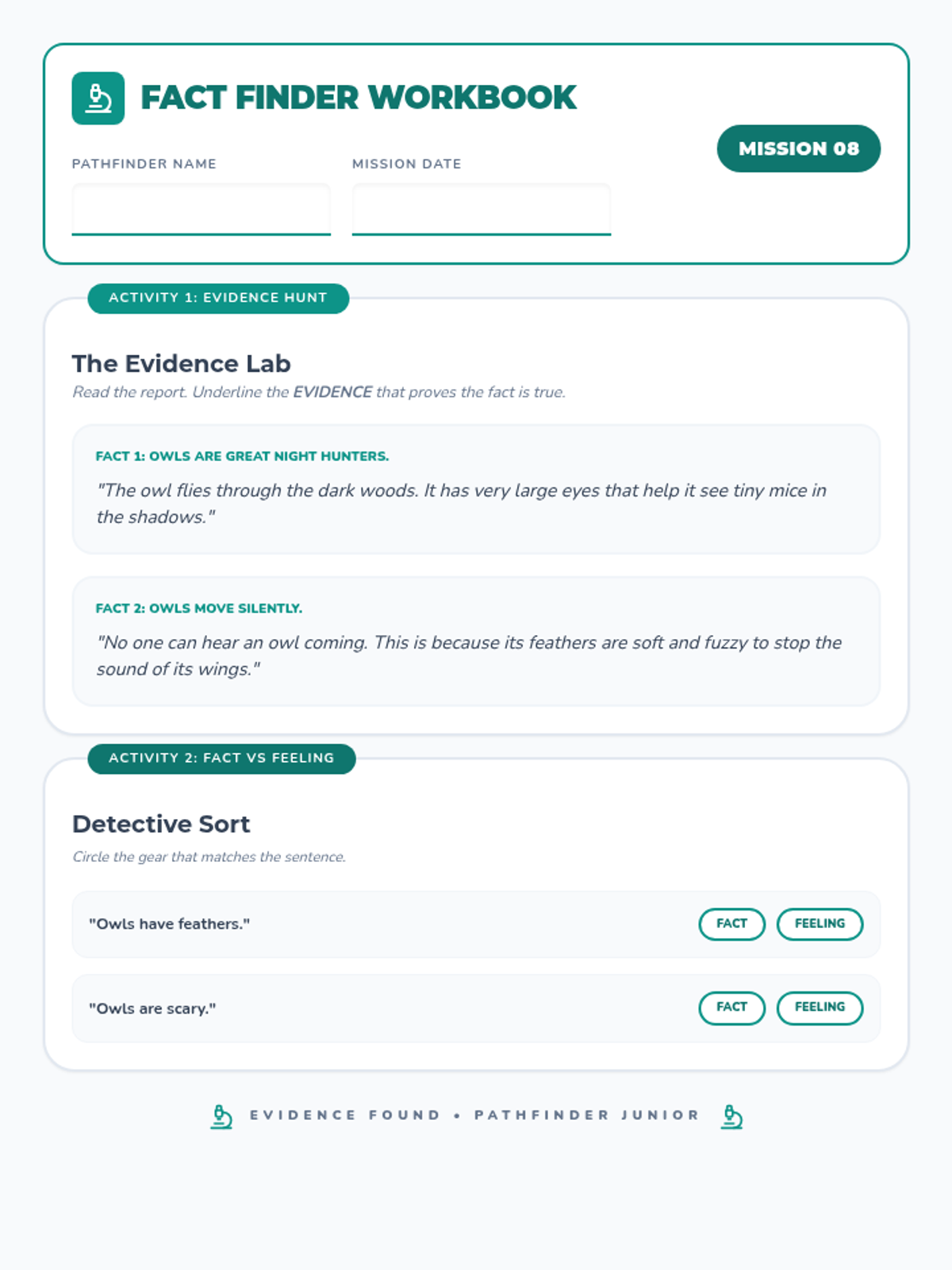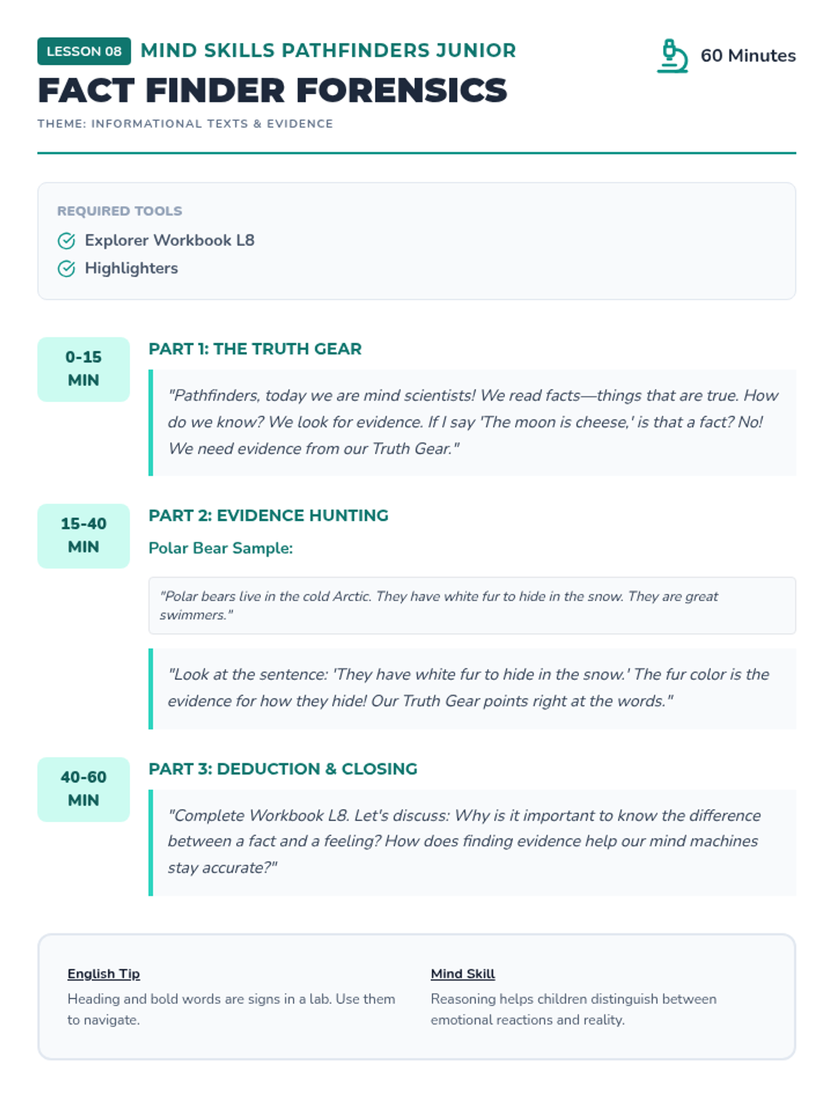 Develops information decoding skills by teaching students to search for facts and evidence within a text, much like a forensic scientist.