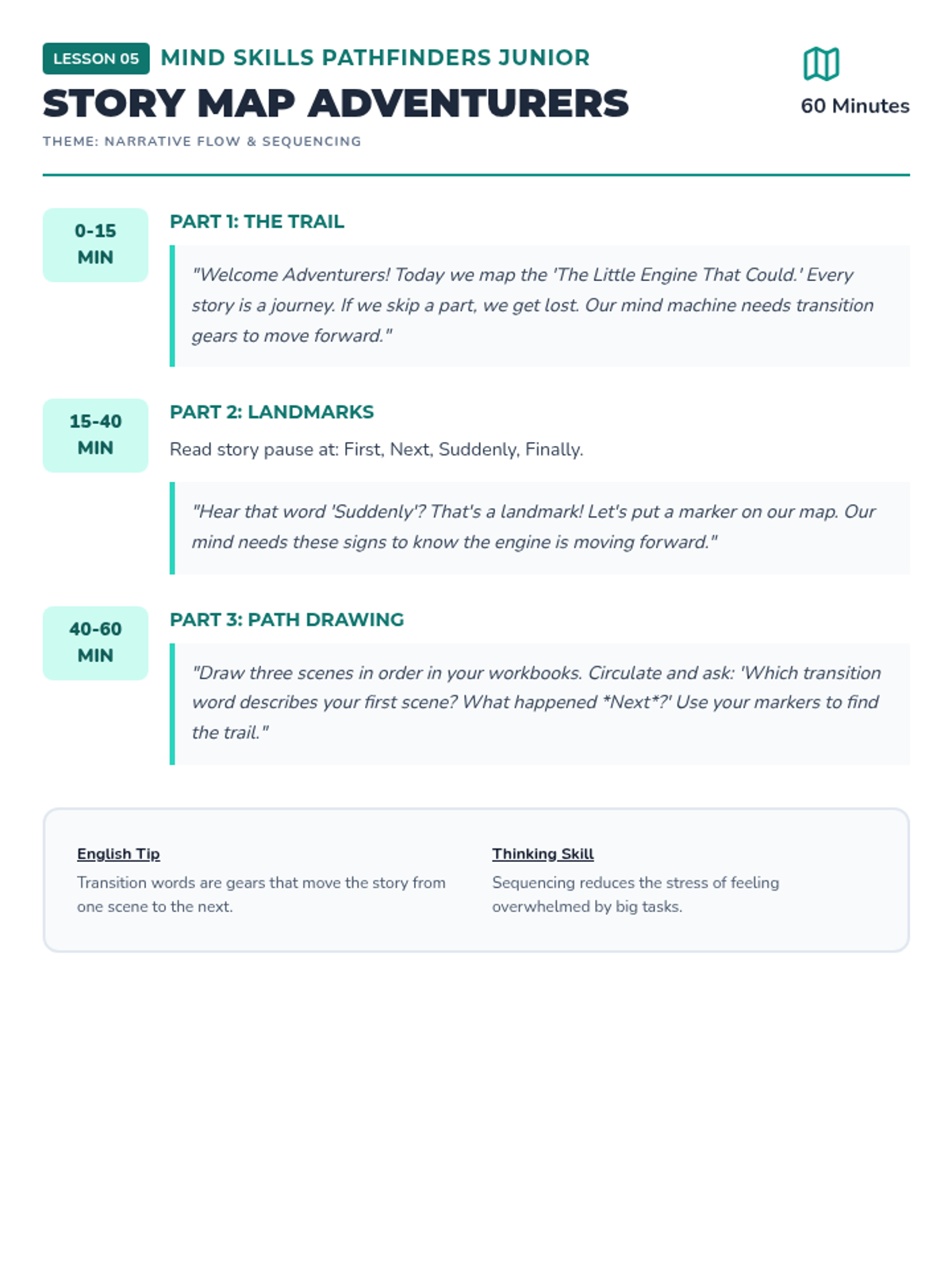 Uses story mapping to help students visualize narrative flow and understand how different parts of a story connect to form a whole.