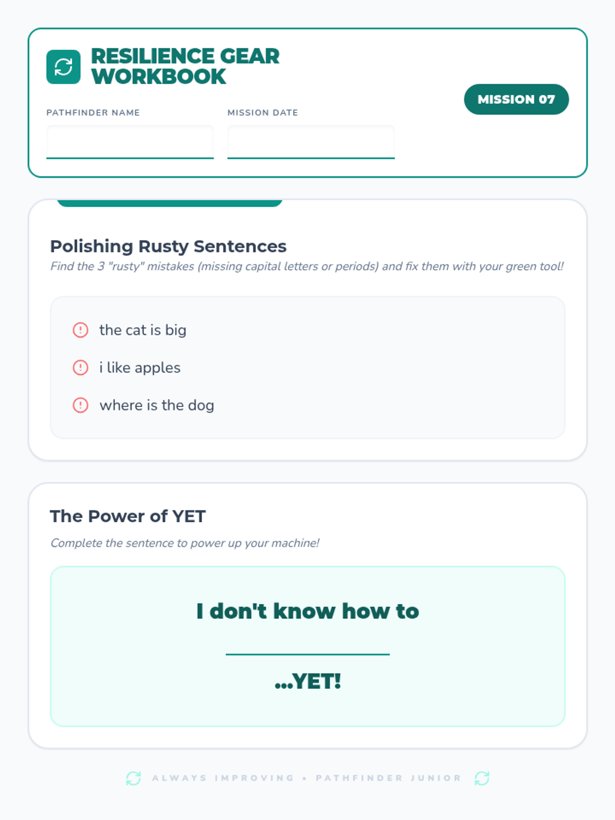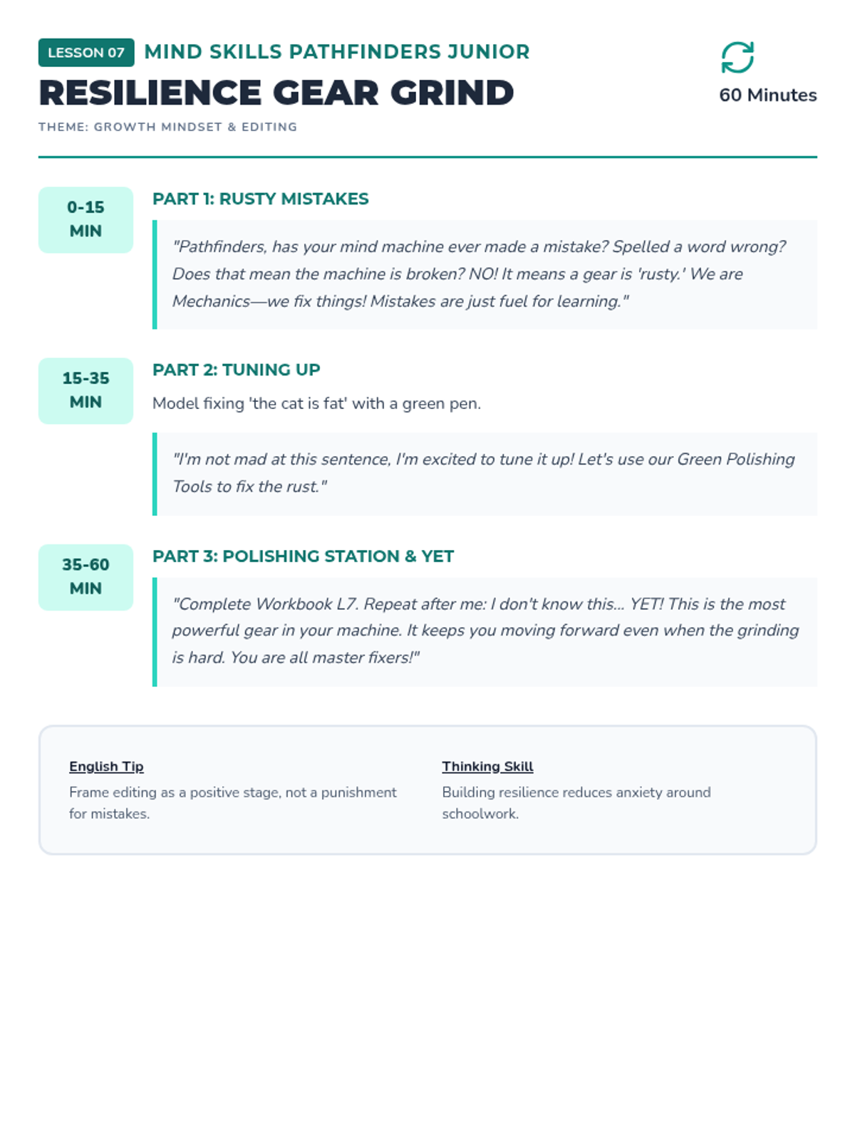 Introduces the growth mindset by comparing resilience to a gear that helps us keep moving forward even when we encounter 'rusty' mistakes.