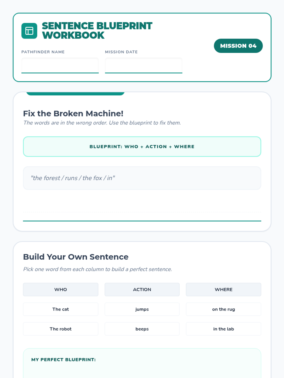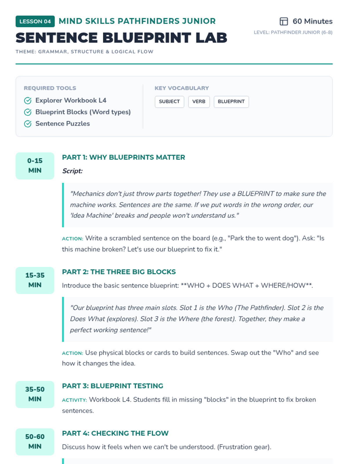 Teaches basic grammar and sentence structure as the 'blueprints' that help us express ideas clearly so others can understand our thoughts.