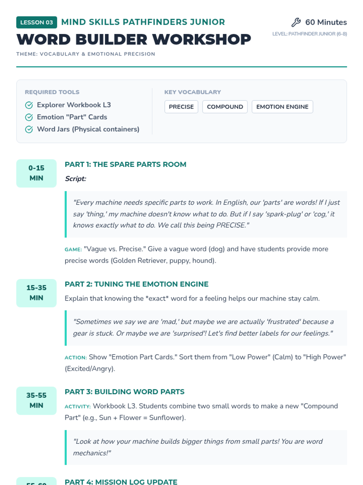 Introduces vocabulary building through the lens of 'parts' for our mind machines, focusing on labeling emotions and objects with precision.