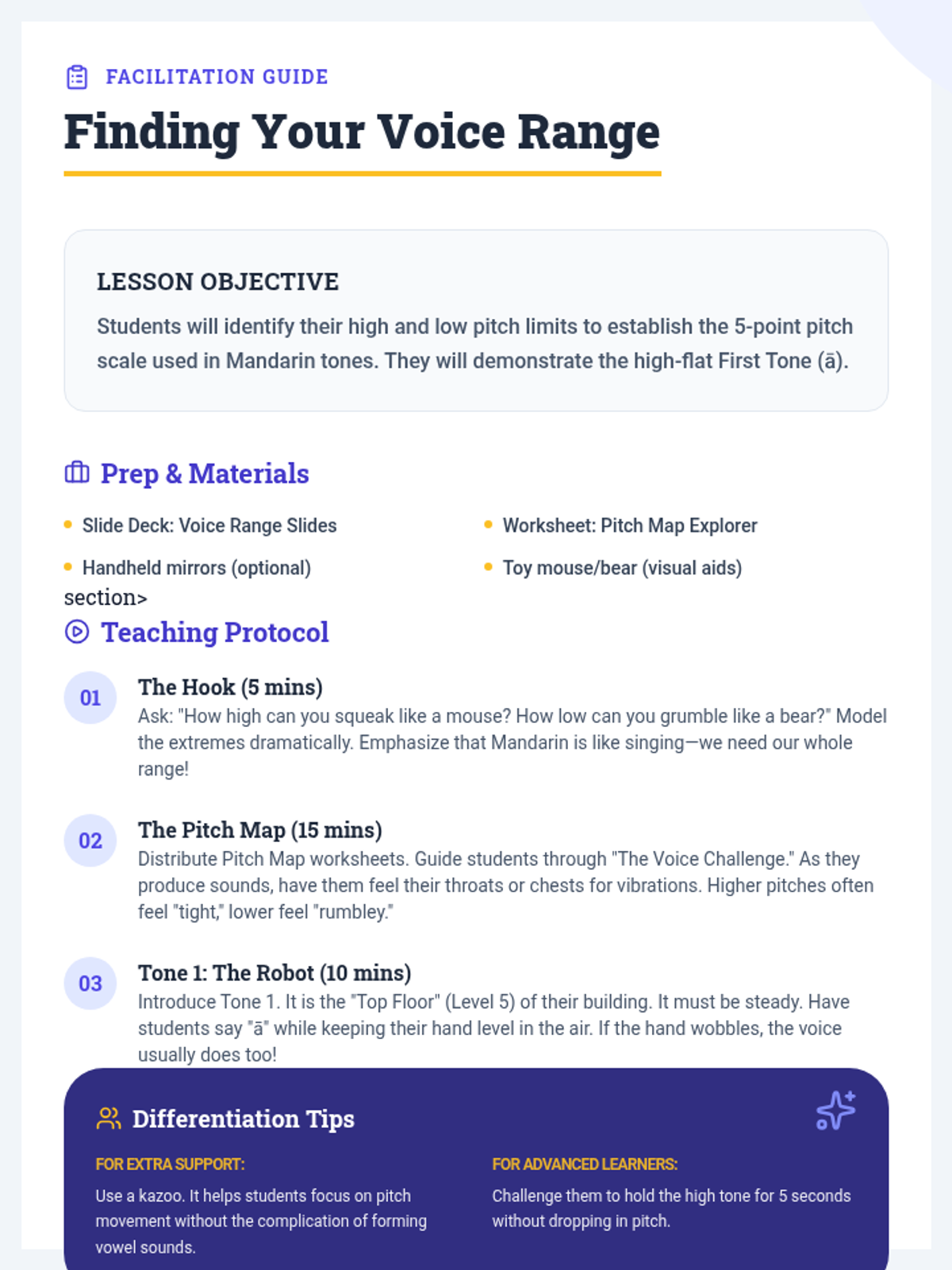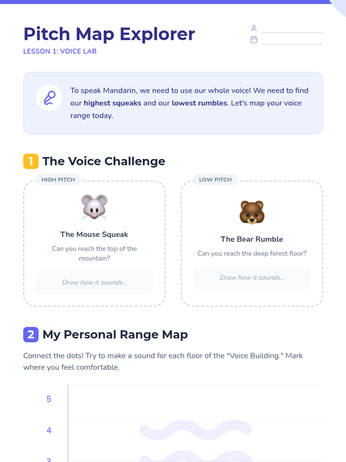 Students explore their vocal range by finding their highest and lowest comfortable pitches, establishing the 'canvas' for Mandarin tones.