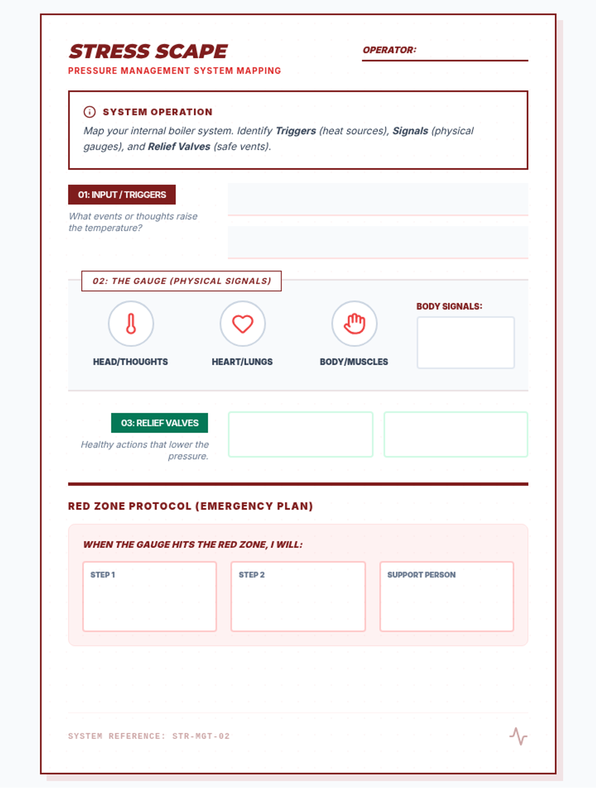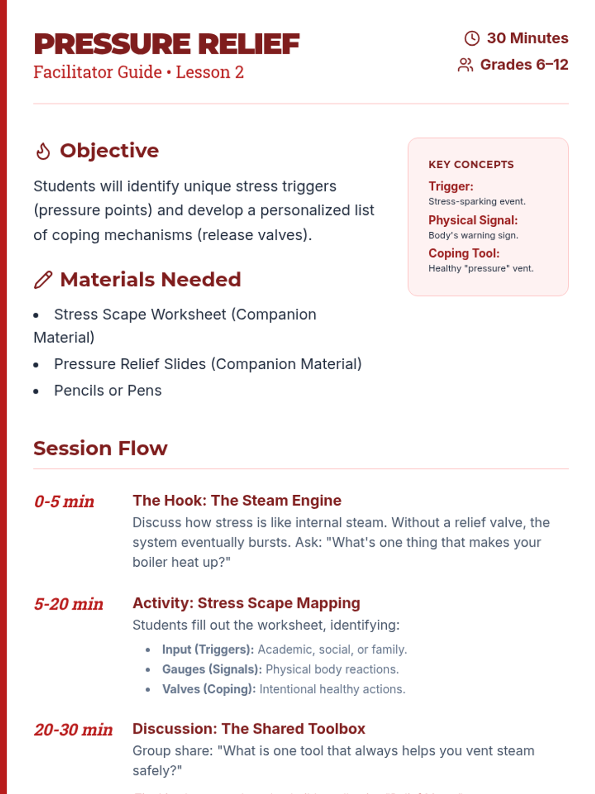 Students identify personal stress triggers and develop a 'relief valve' system of coping strategies. The lesson focuses on recognizing physical signs of stress and planning proactive responses.