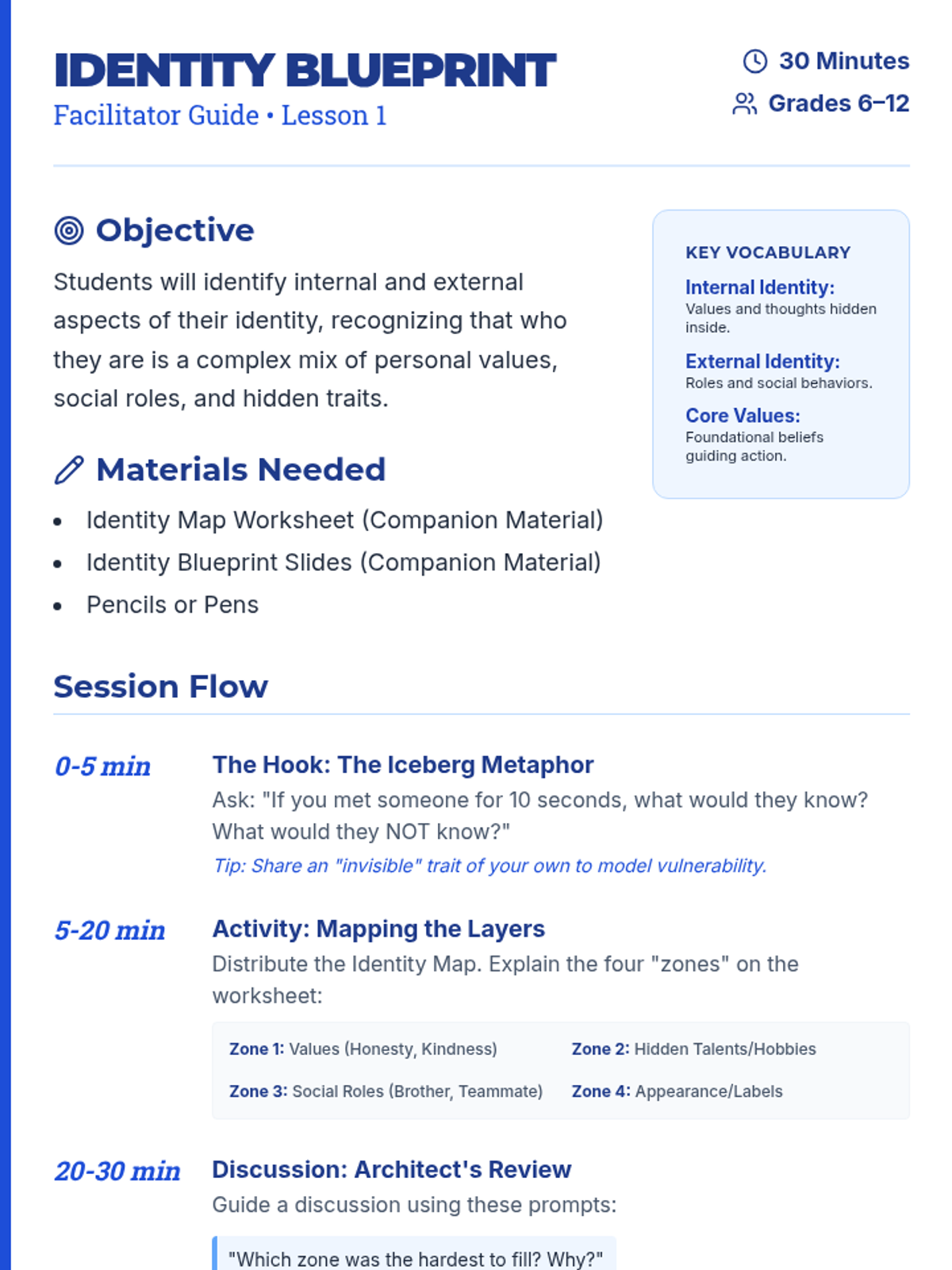 Students explore the layers of their identity, distinguishing between how they see themselves and how they are perceived by others. Includes a guided activity to create a multi-layered identity map.