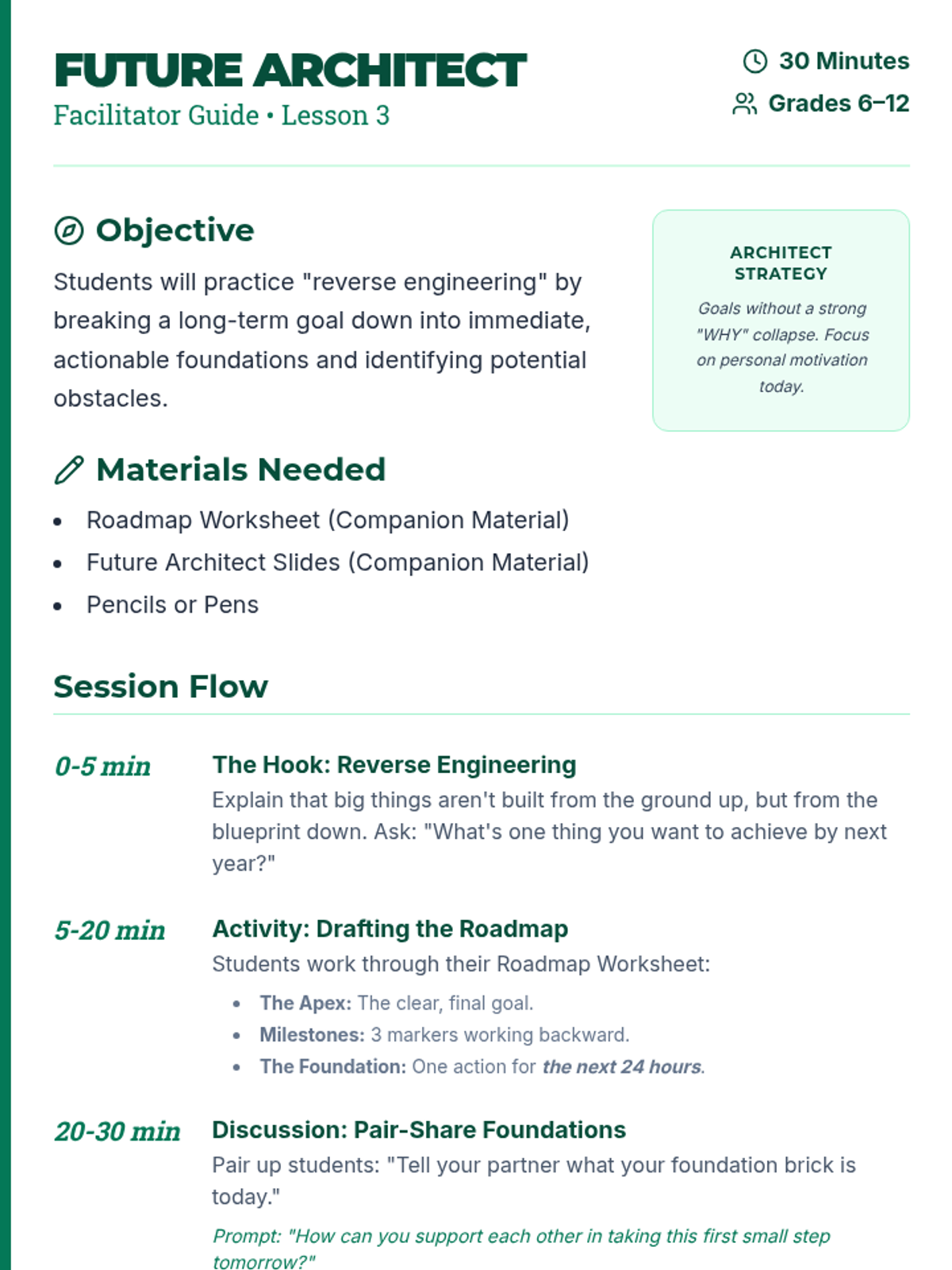 A goal-setting workshop where students 'reverse engineer' a long-term aspiration into immediate, manageable steps. Focuses on clarity, motivation, and overcoming potential obstacles.