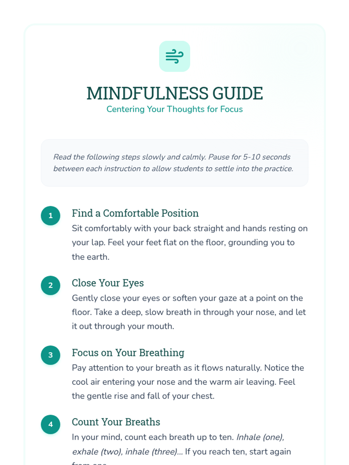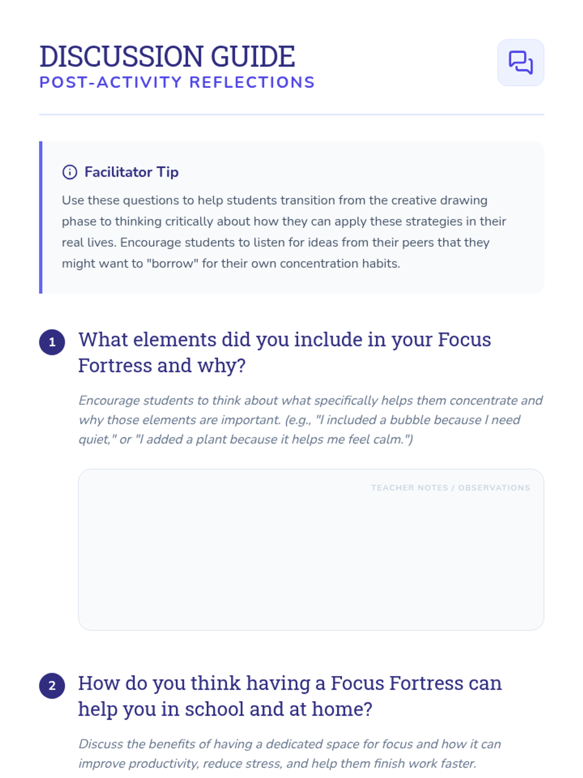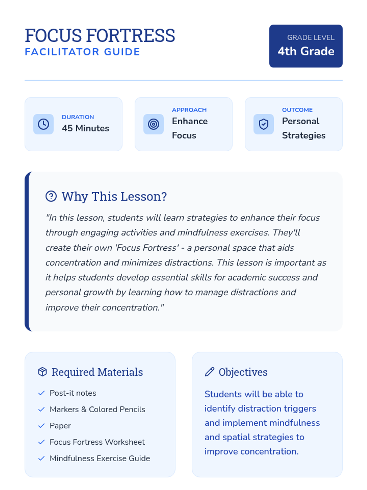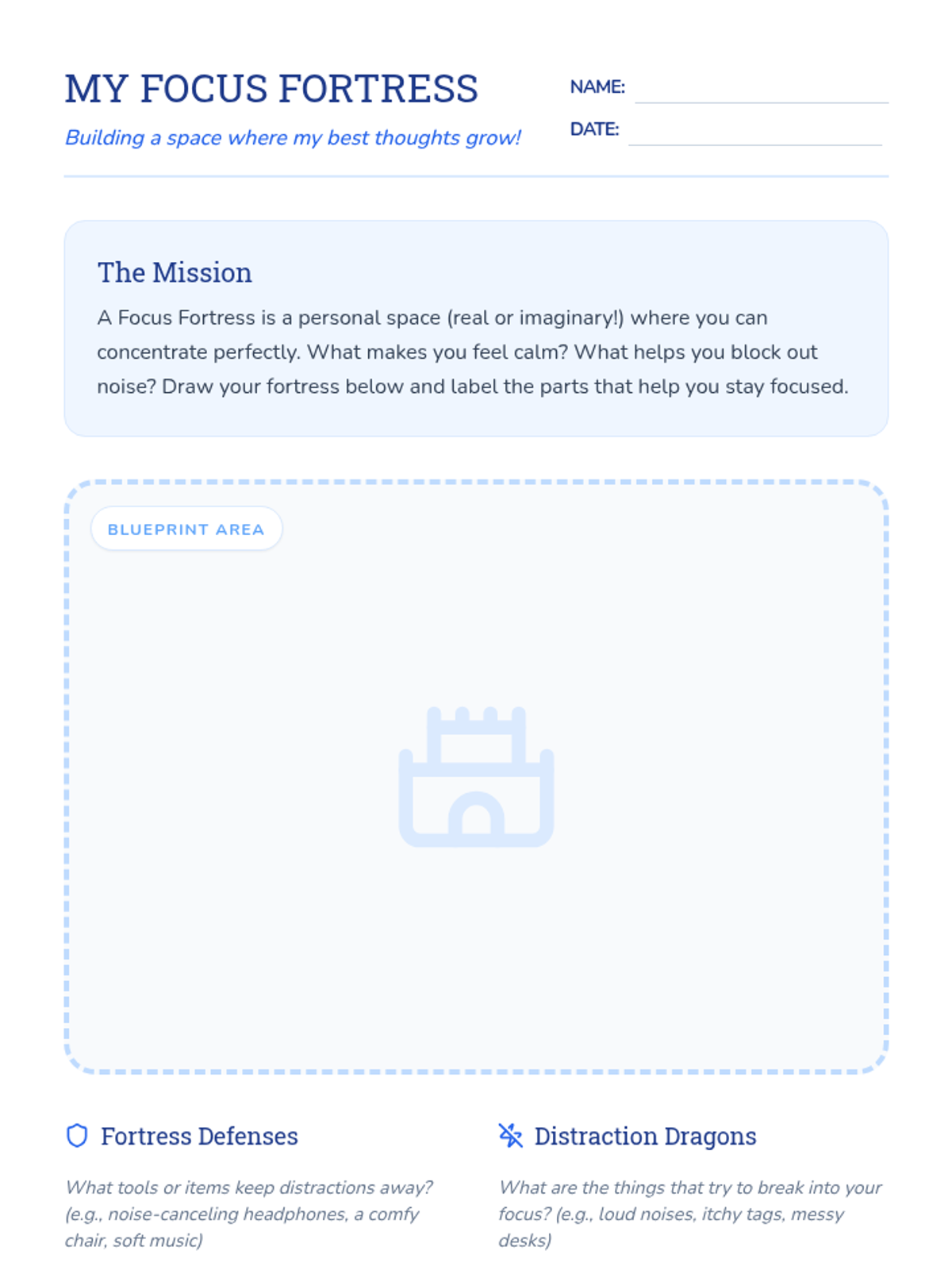Students will learn focus strategies through mindfulness and by designing a 'Focus Fortress' - a personalized mental or physical space designed to minimize distractions and maximize concentration.