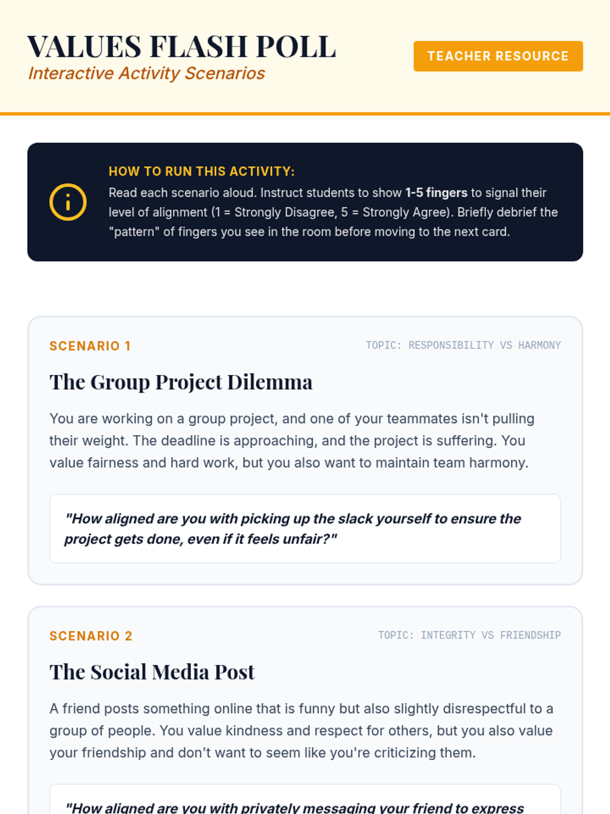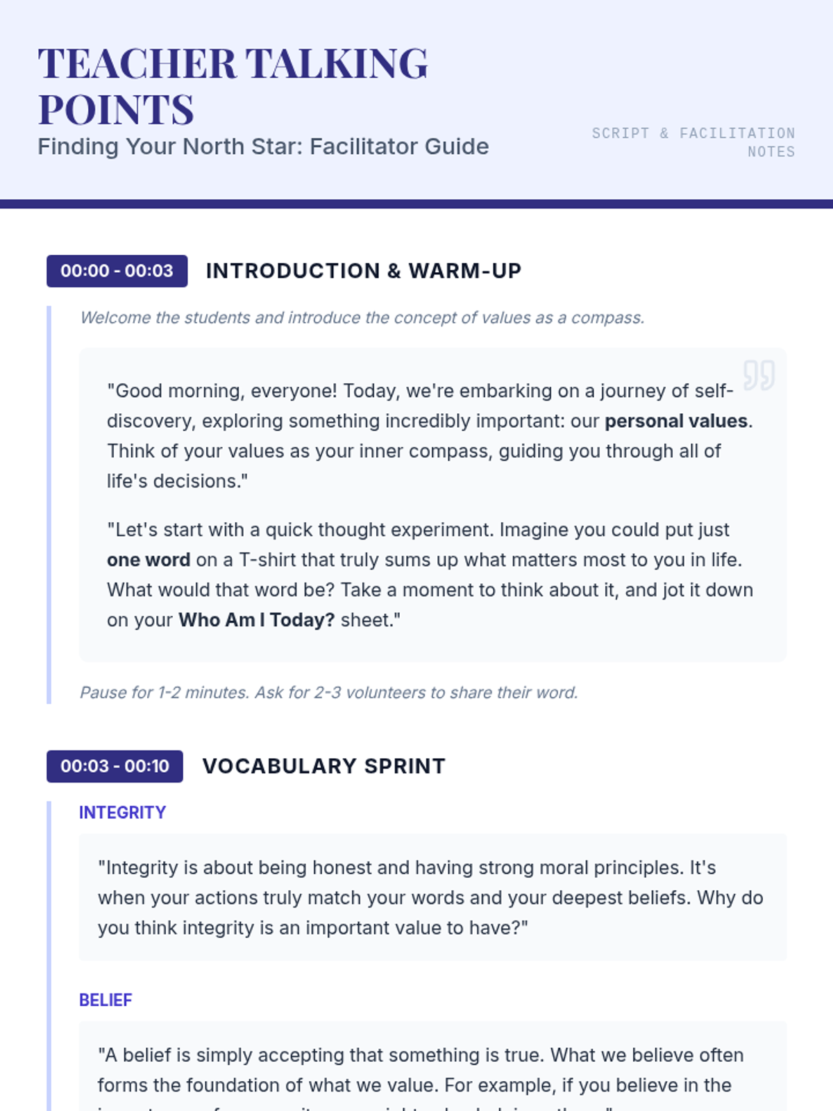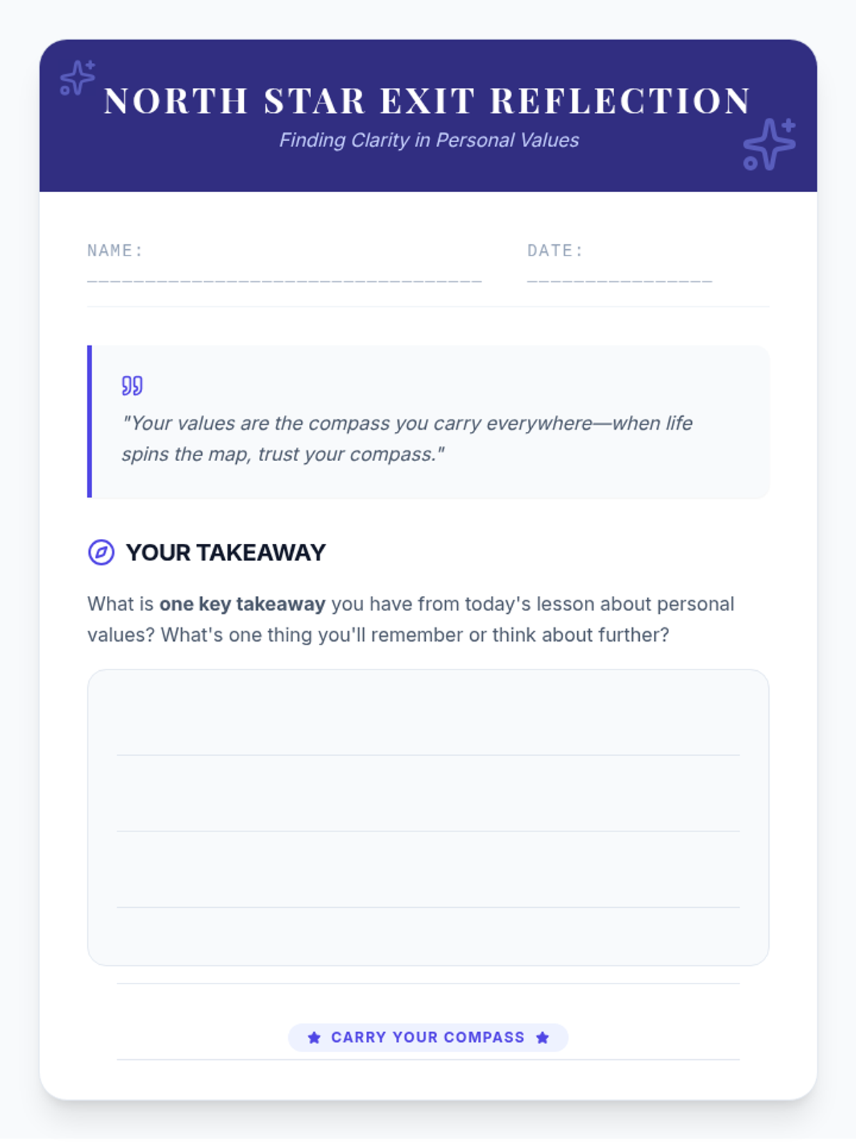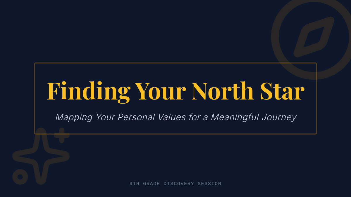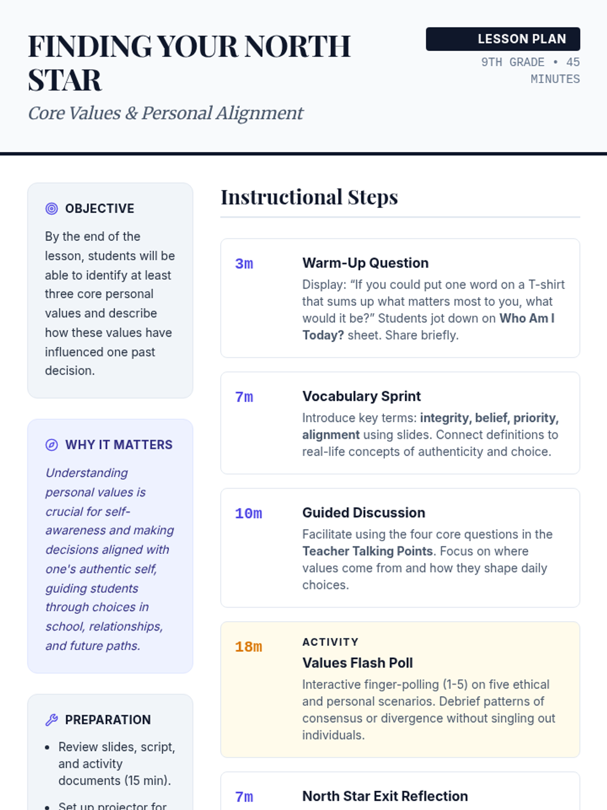 A 45-minute lesson for 9th-grade students to discover their core personal values through discussion, reflection, and an interactive flash poll. Students identify what matters most to them and how these values act as a 'North Star' for decision-making.
