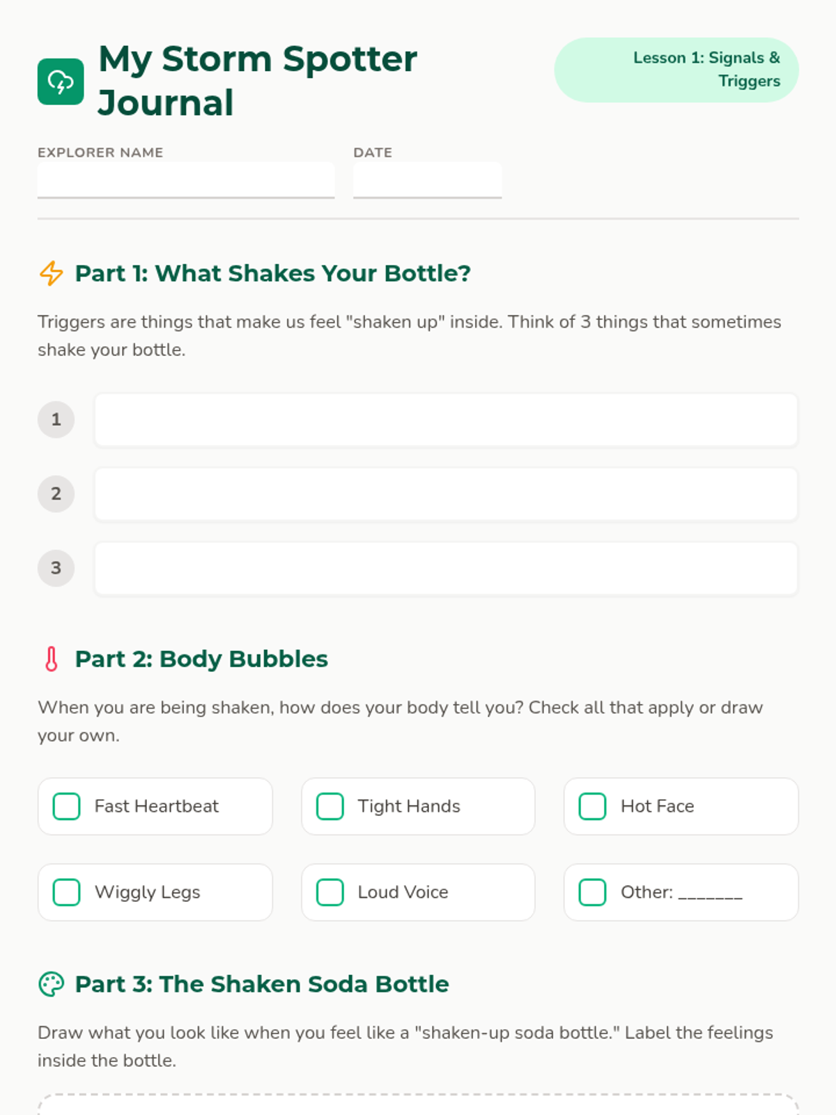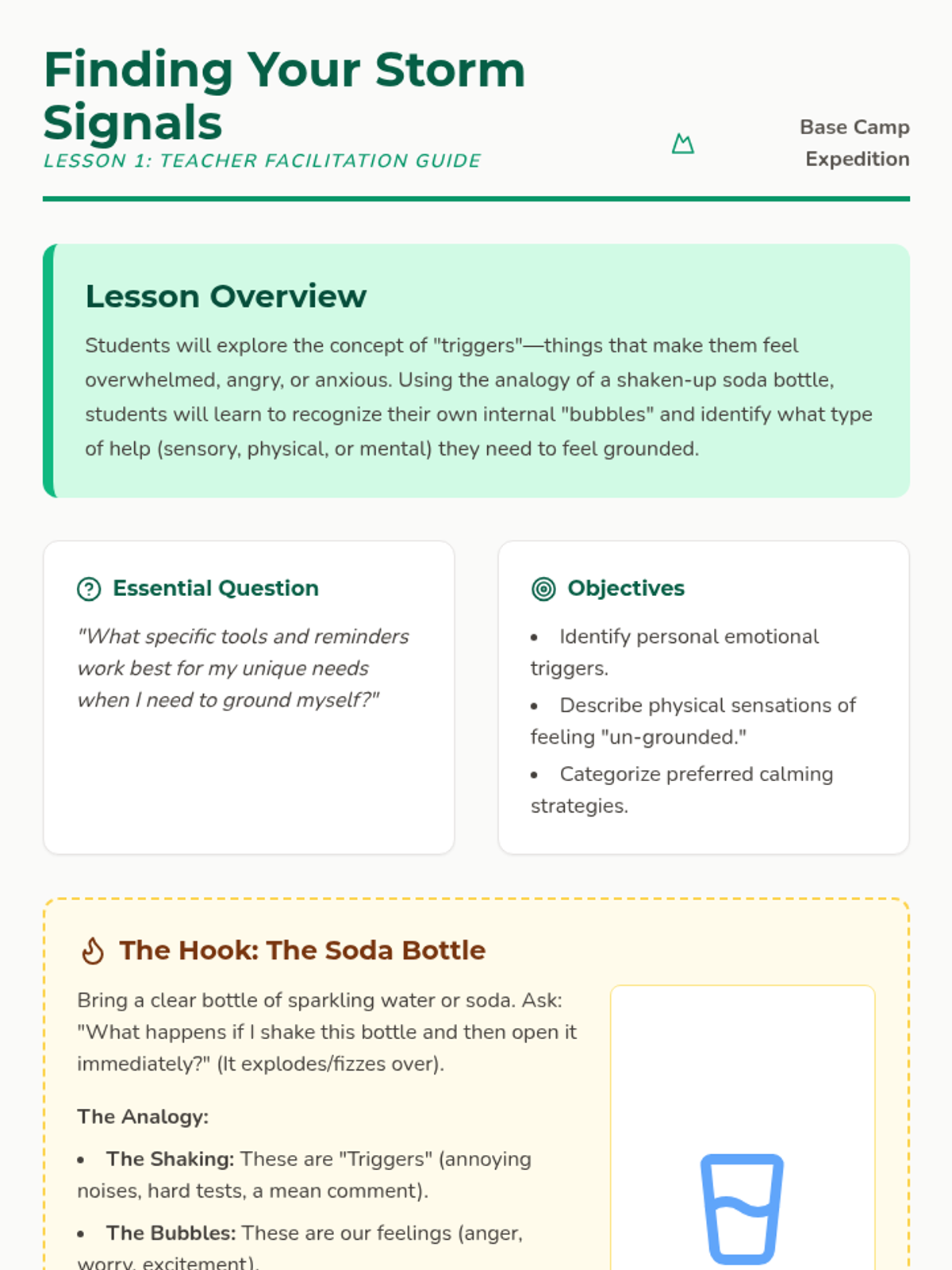Students explore the concept of emotional triggers and identify personal signals that indicate a need for grounding using the 'shaken-up soda bottle' analogy.