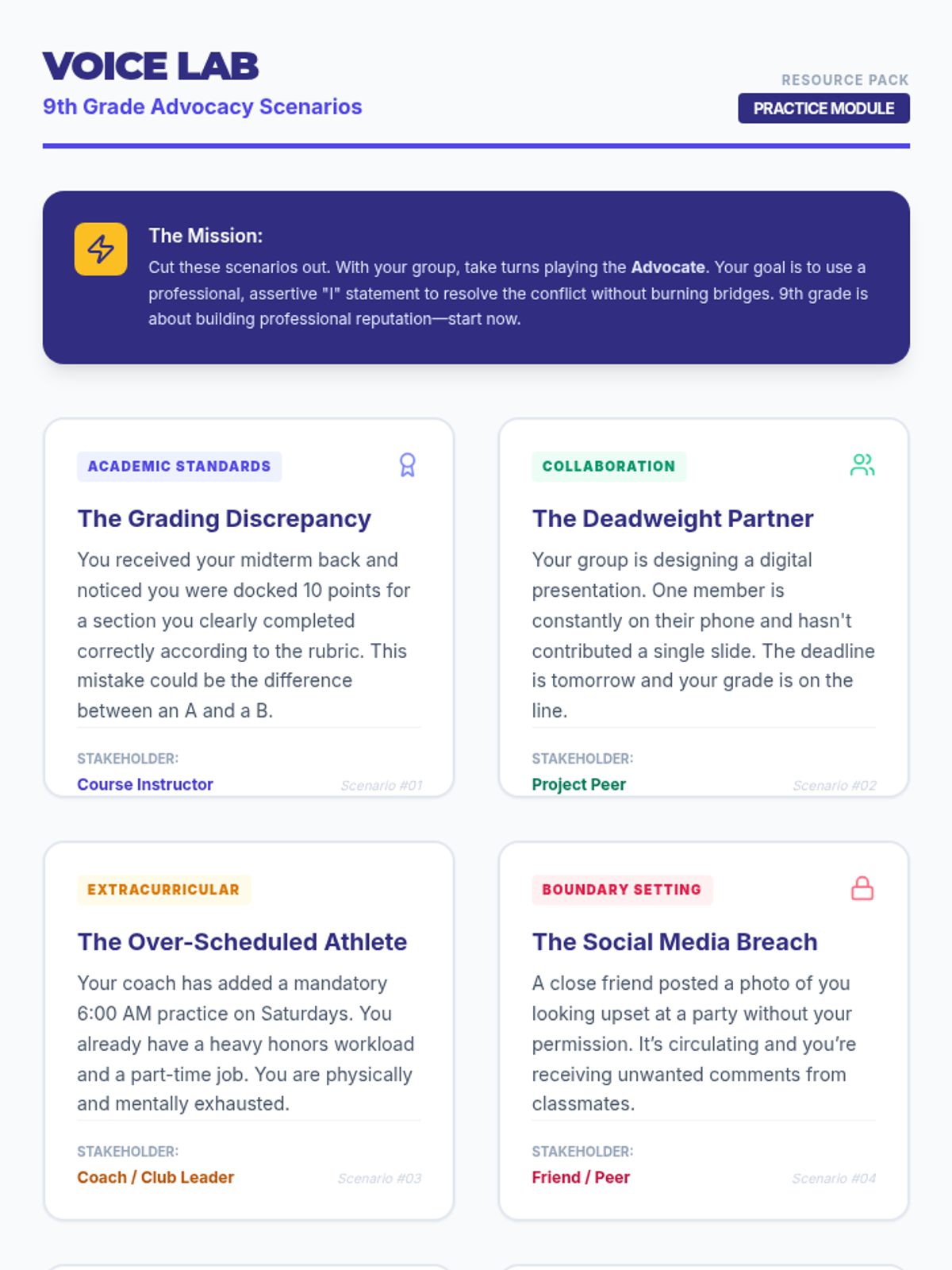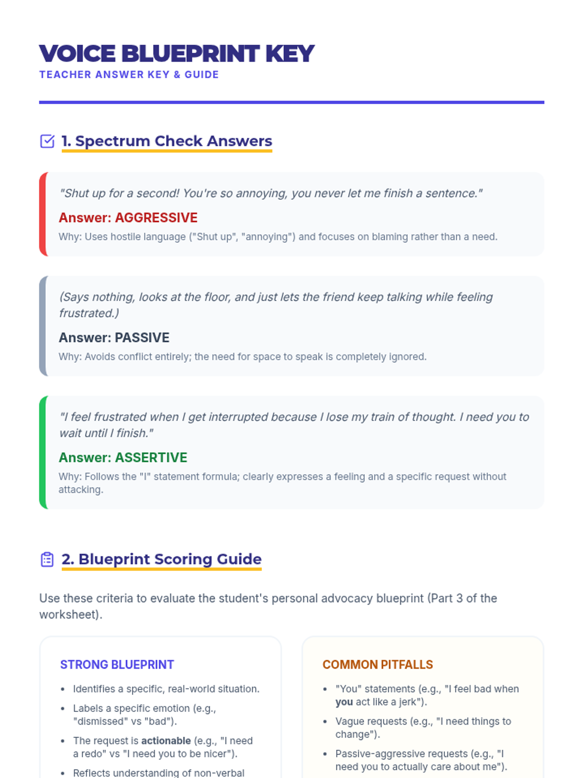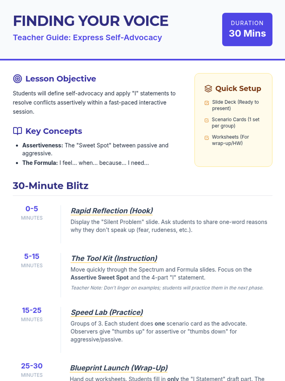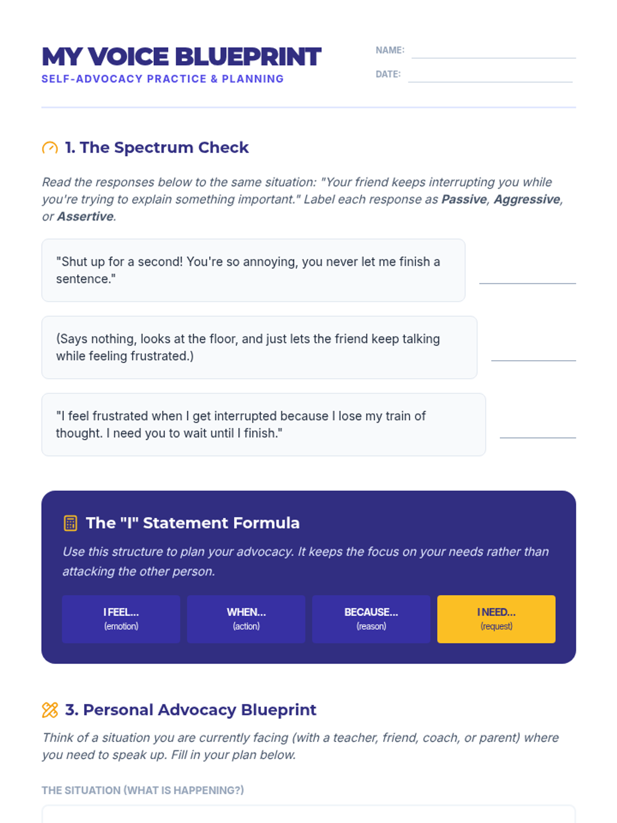 A comprehensive lesson for 9th and 10th graders on self-advocacy, focusing on respectful assertiveness, 'I' statements, and navigating challenging conversations.