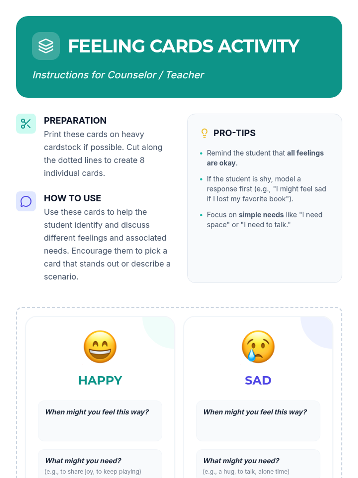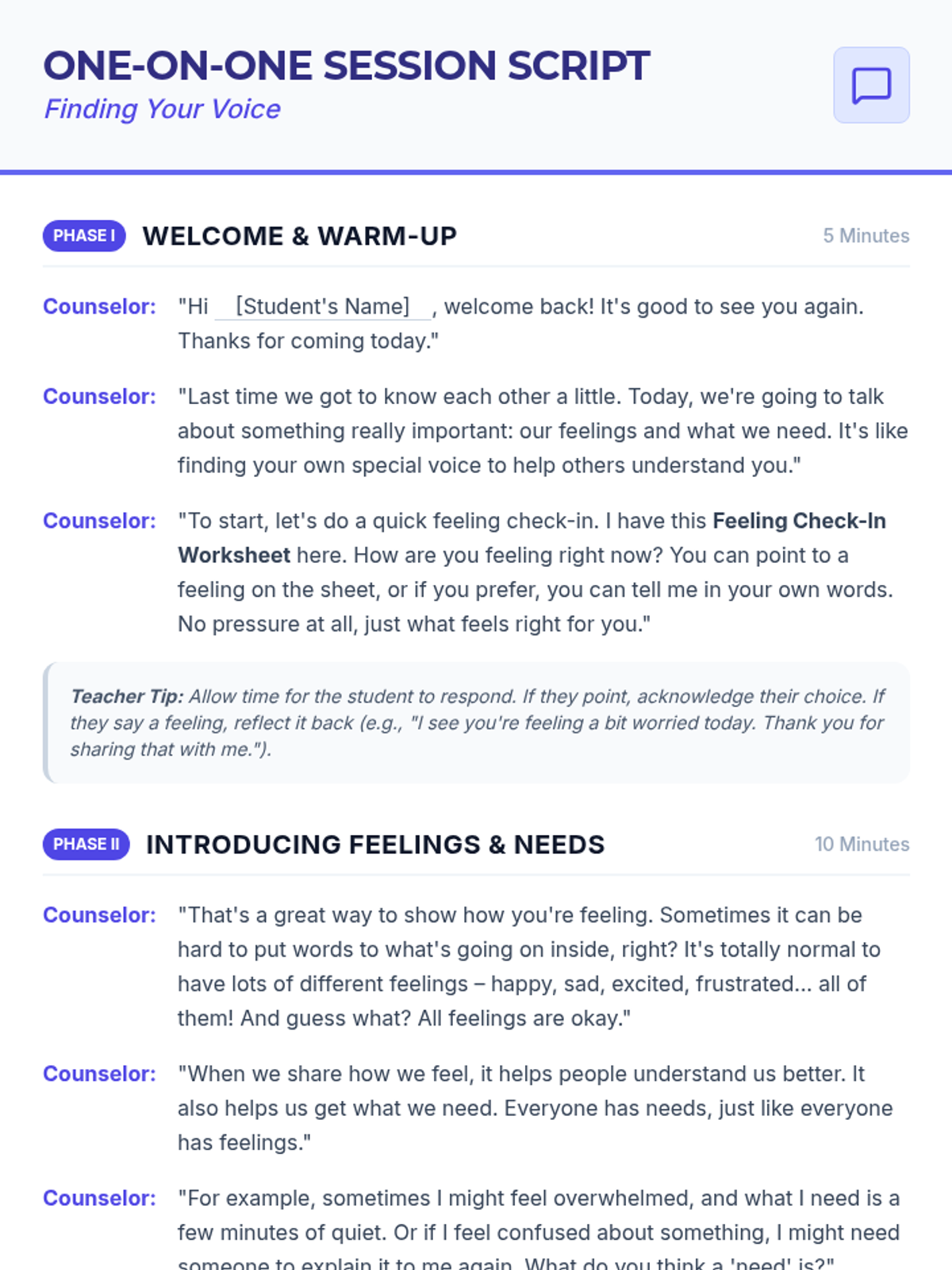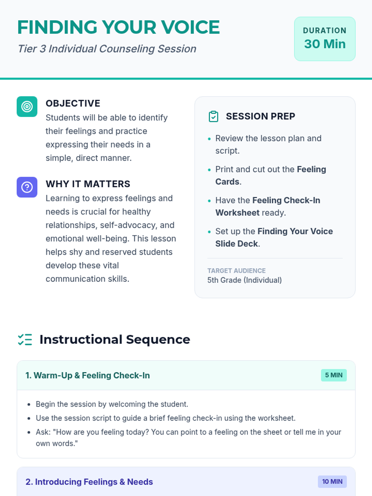 A 30-minute Tier 3 individual counseling session for 5th-grade students focused on identifying feelings and expressing needs through simple, direct communication strategies.