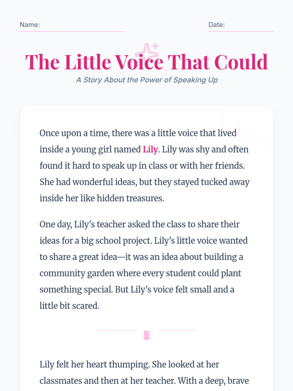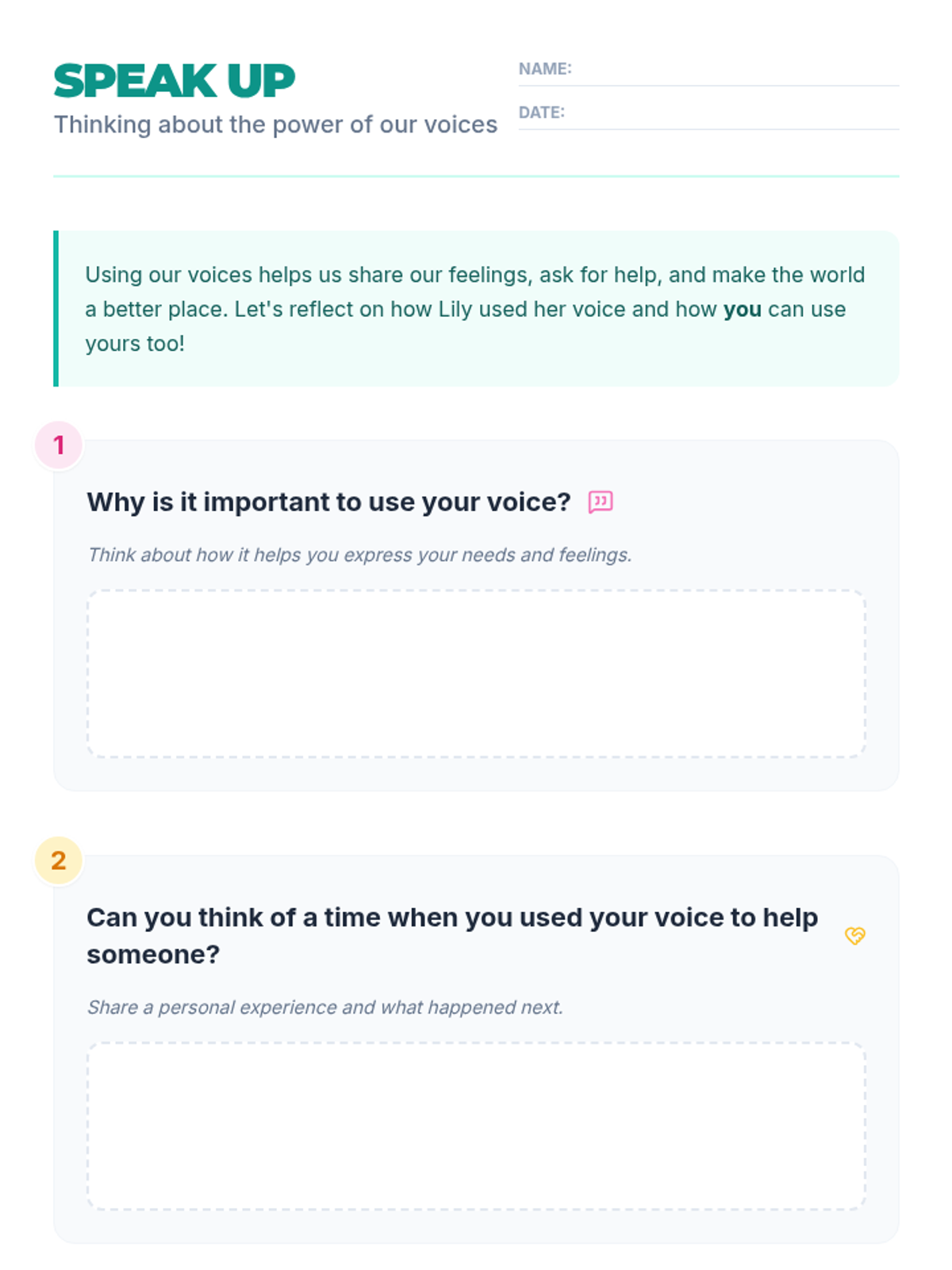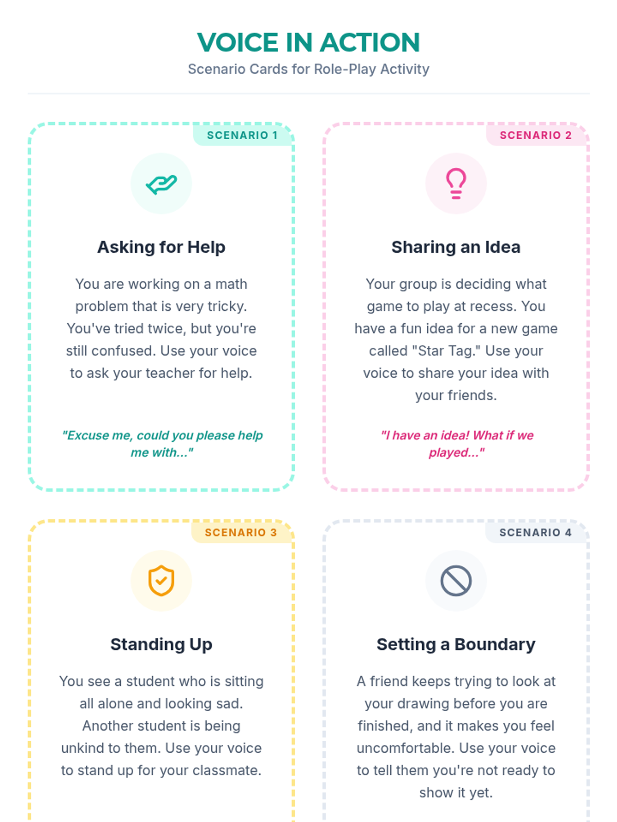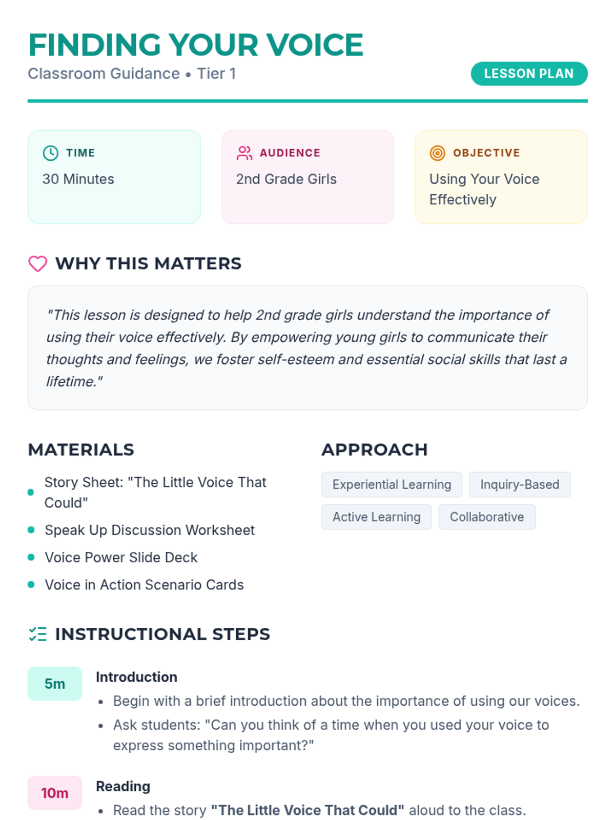 A 30-minute lesson for 2nd grade girls focused on self-expression and the power of using their voices effectively and respectfully. Students will explore a story, engage in guided discussions, and practice role-playing real-world scenarios.