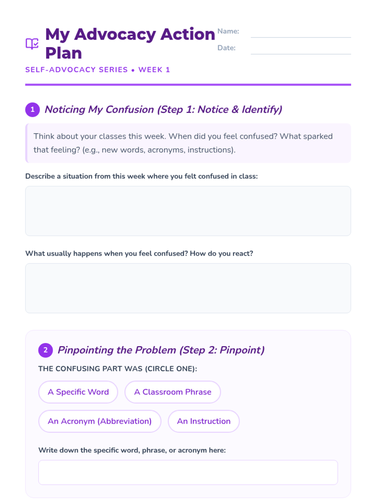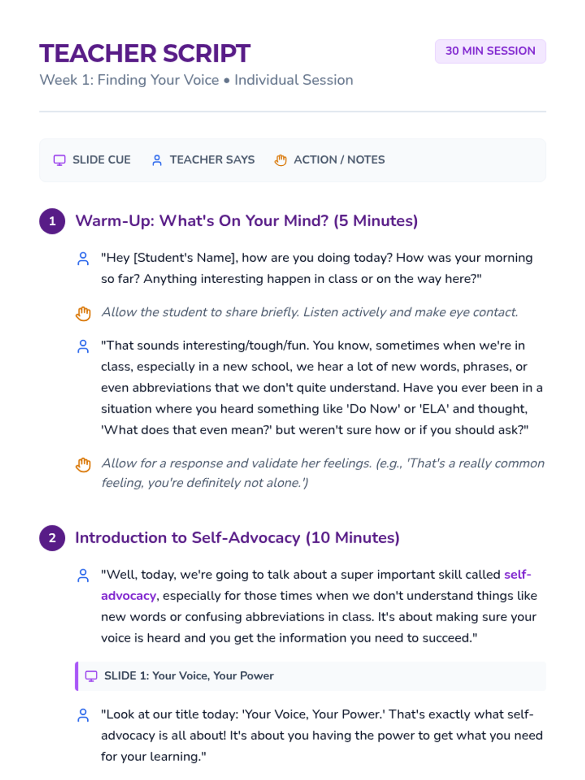 In this opening session, students define self-advocacy and learn the 'Ask It!' strategy (Notice, Pinpoint, Choose Your Words) to identify and address confusion in the classroom.