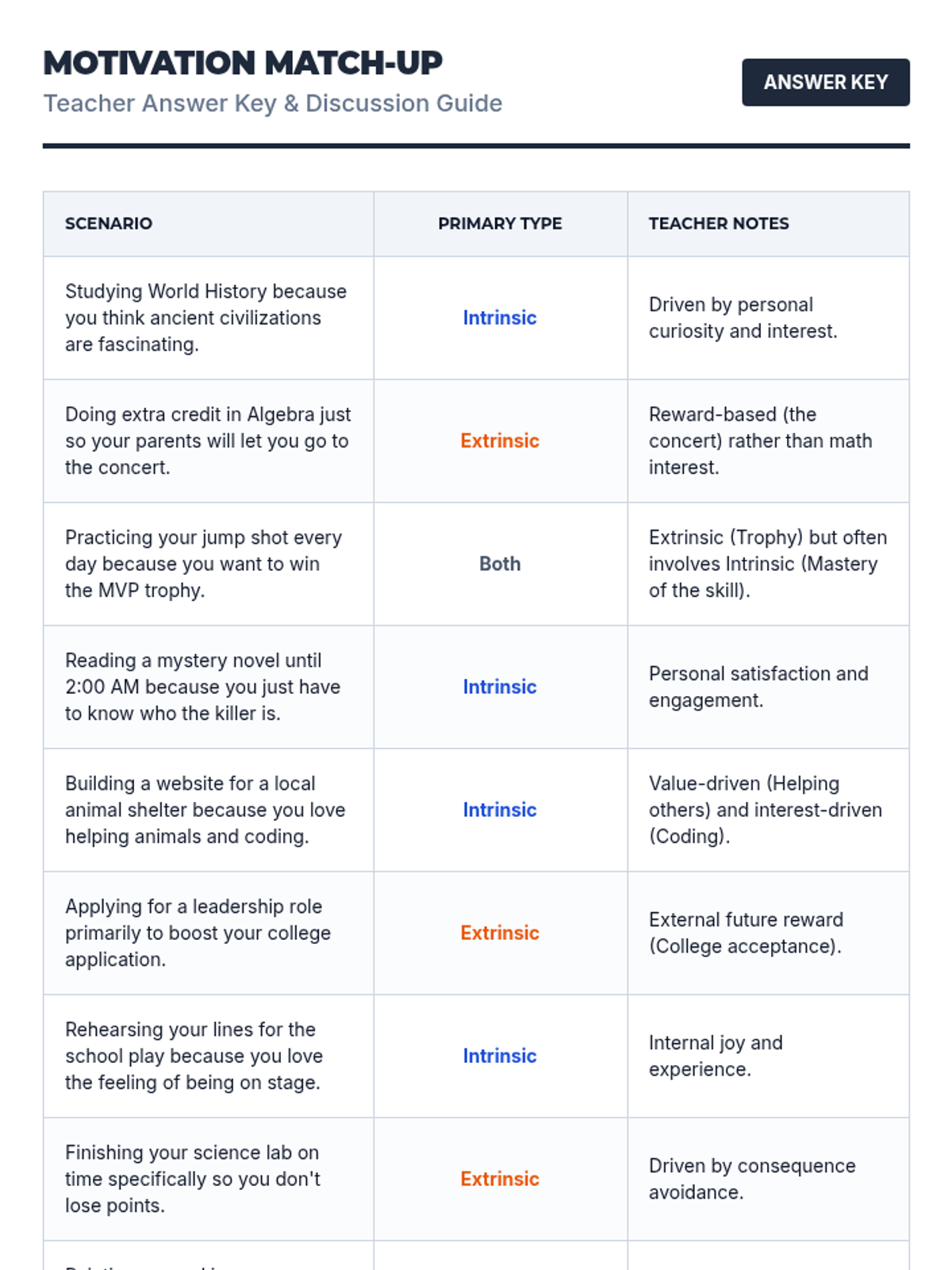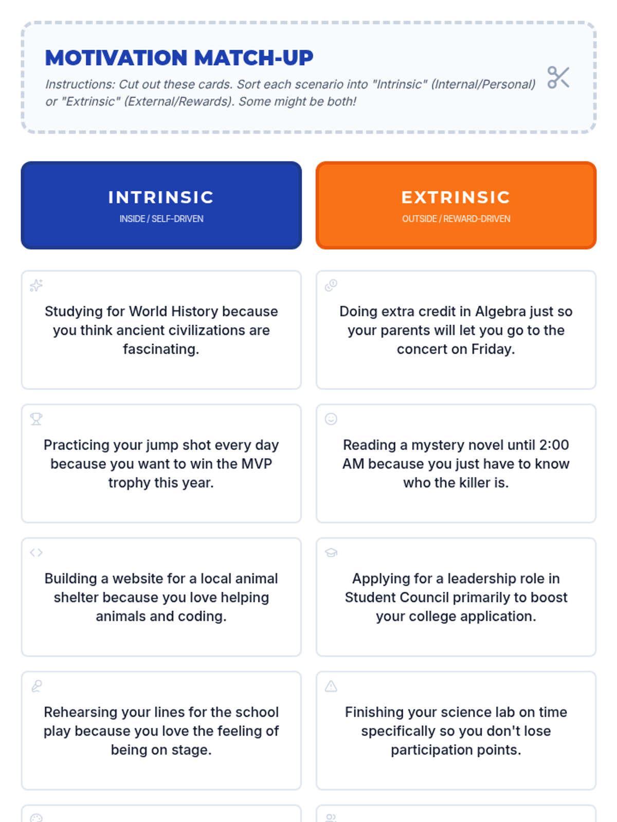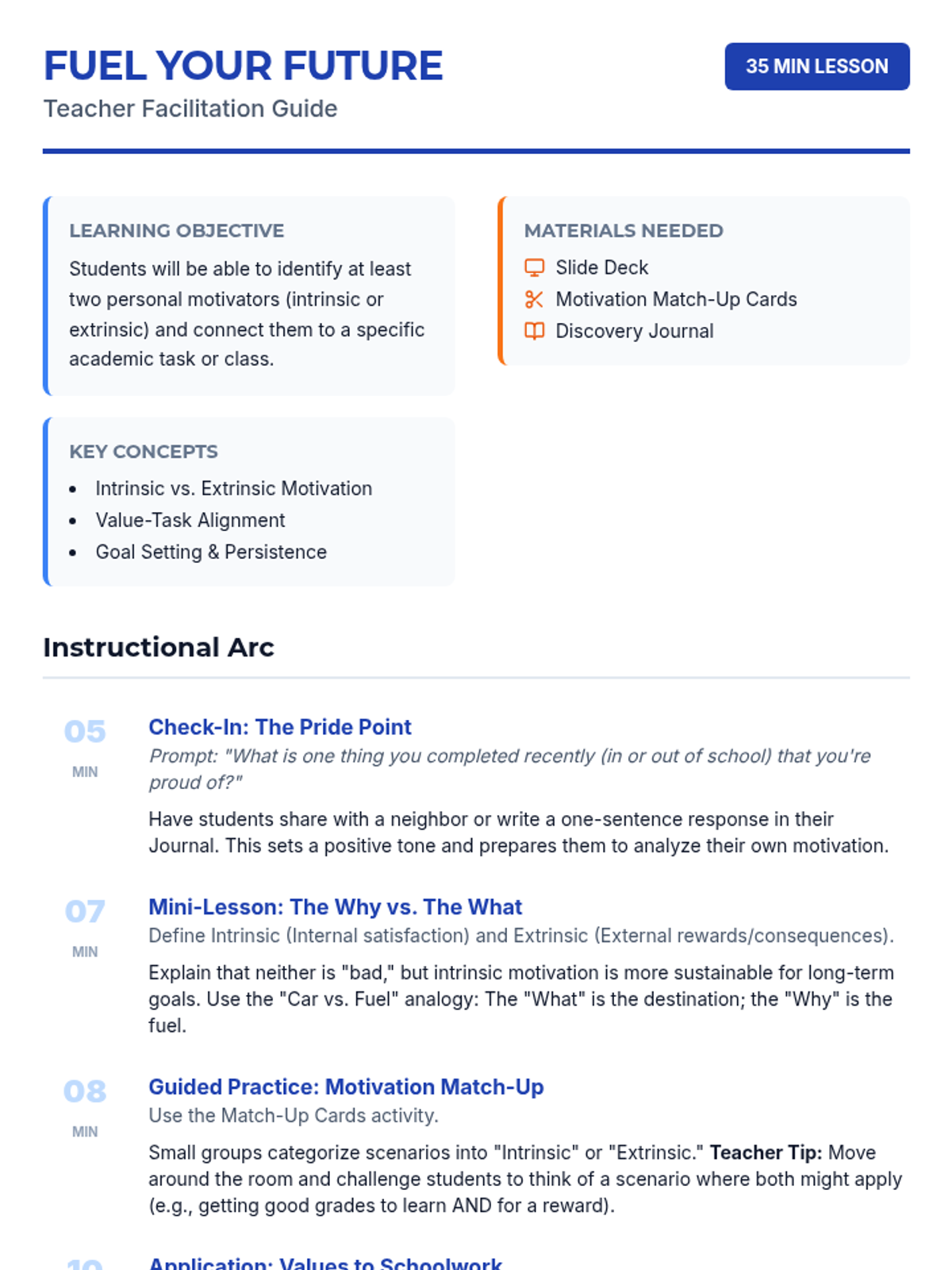 A 35-minute lesson designed to help 9th graders identify intrinsic and extrinsic motivators and connect their personal values to their daily academic responsibilities.