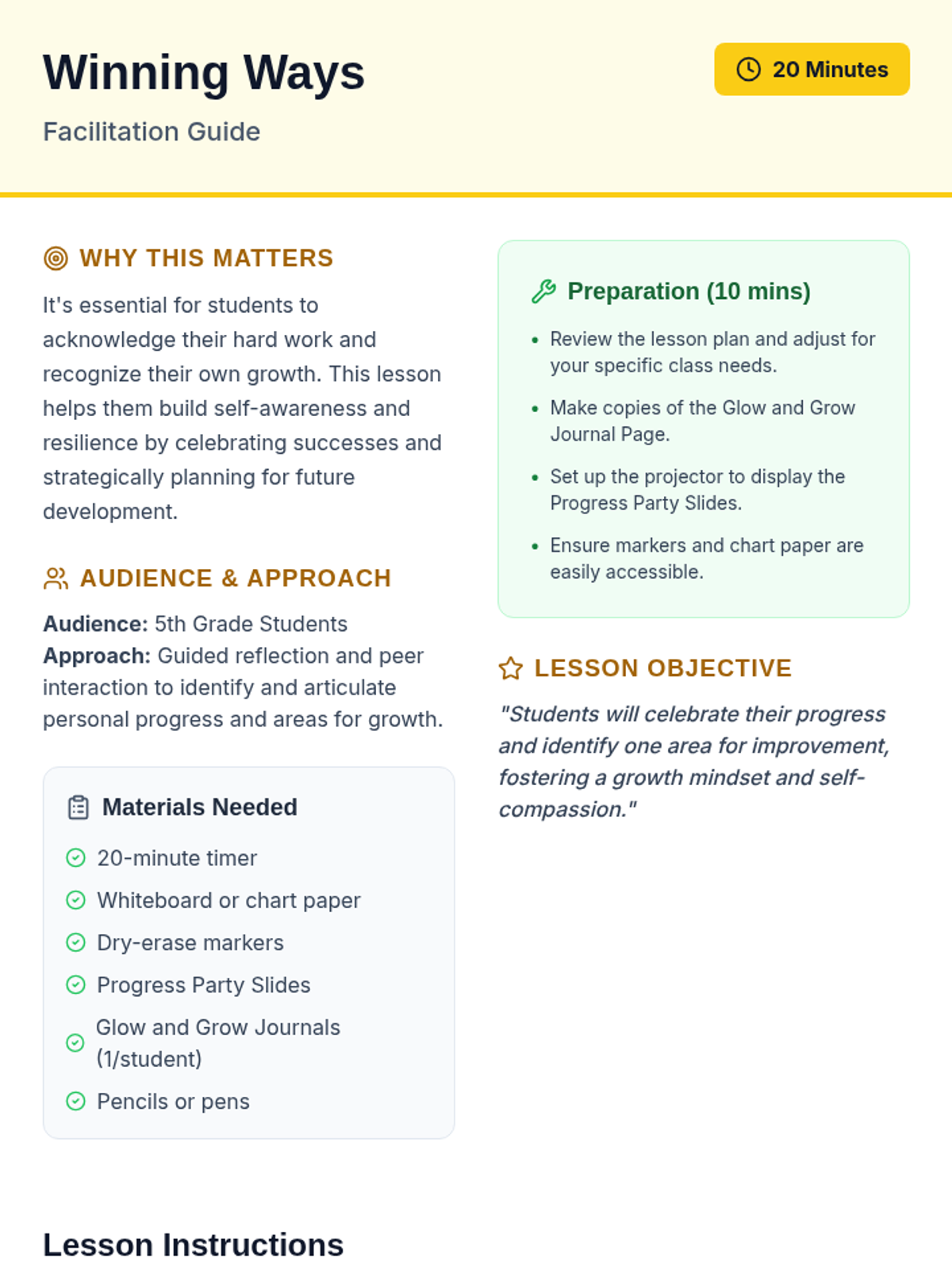 A 20-minute growth mindset lesson for 5th graders focused on recognizing personal progress ('glows') and setting specific goals for improvement ('grows'). Students participate in a shout-out circle and a structured self-reflection journal activity.