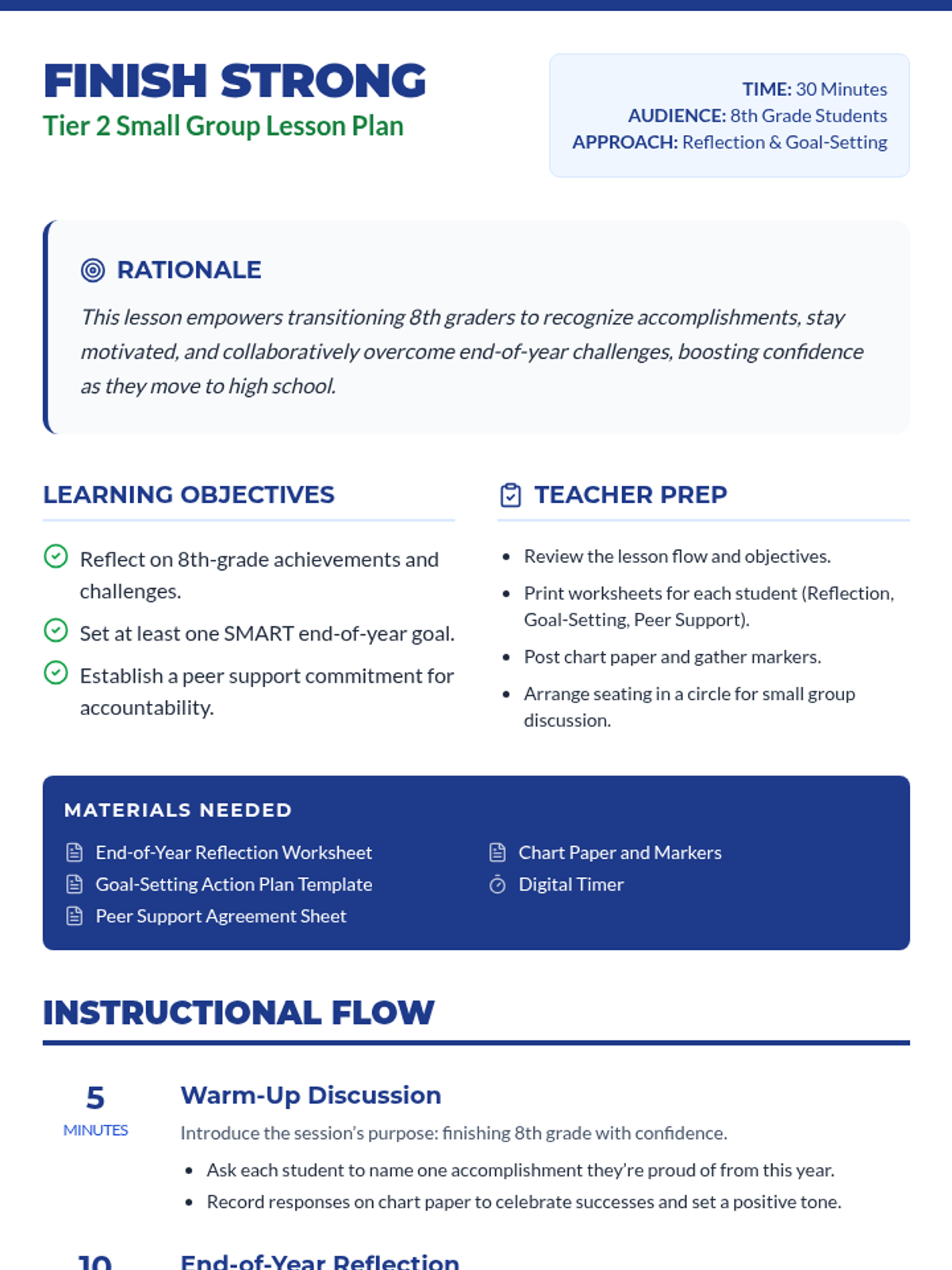 A 30-minute small-group Tier 2 lesson for 8th graders to reflect on achievements, set SMART goals, and build peer support to transition successfully to high school.