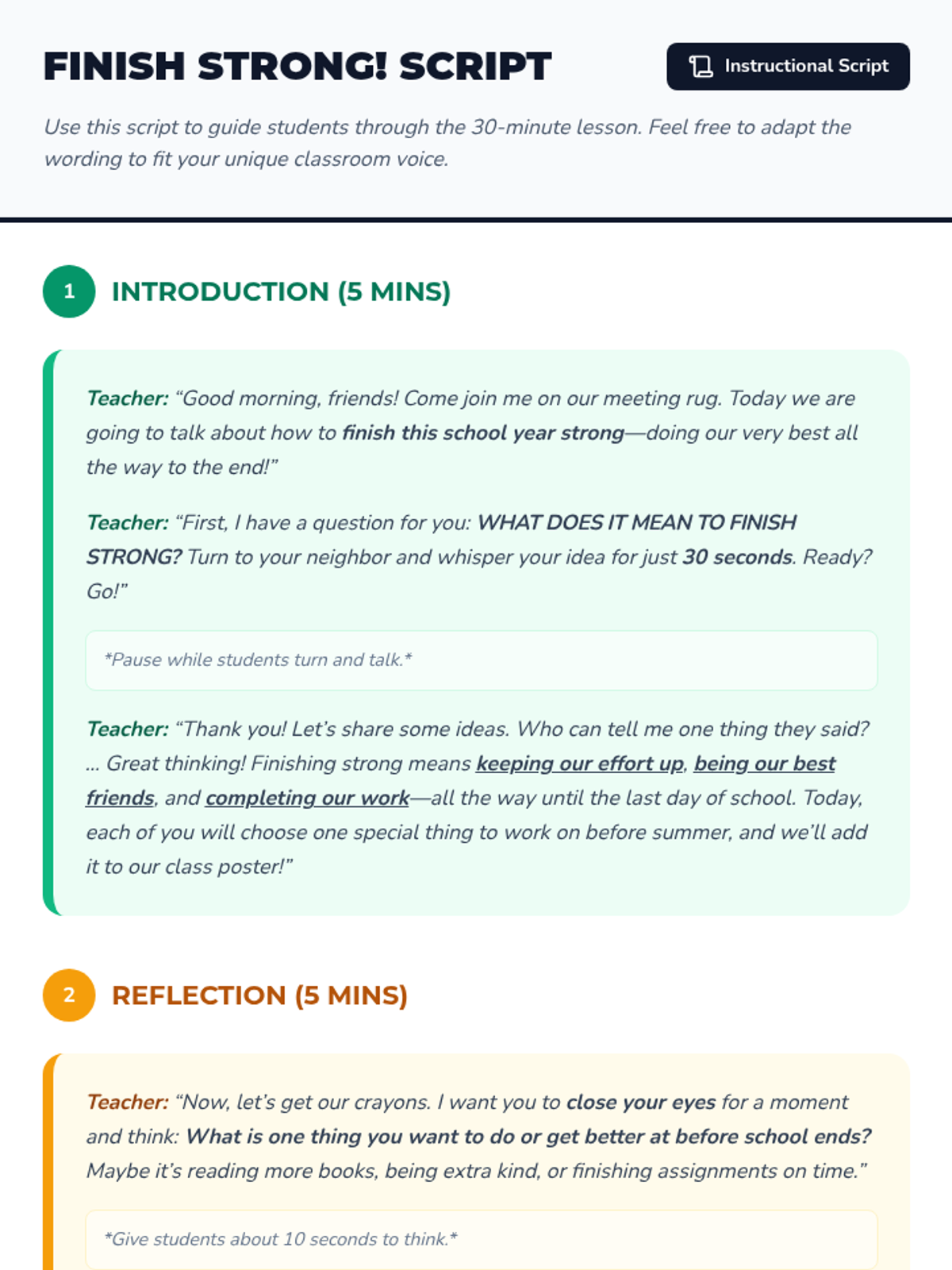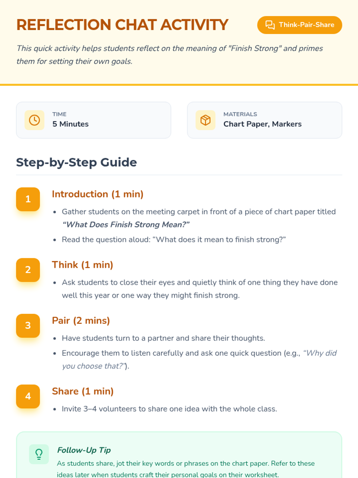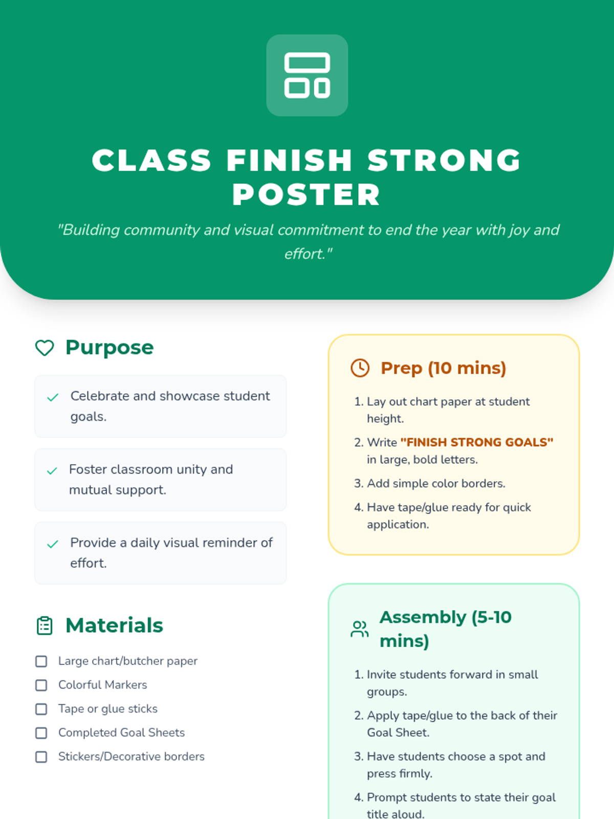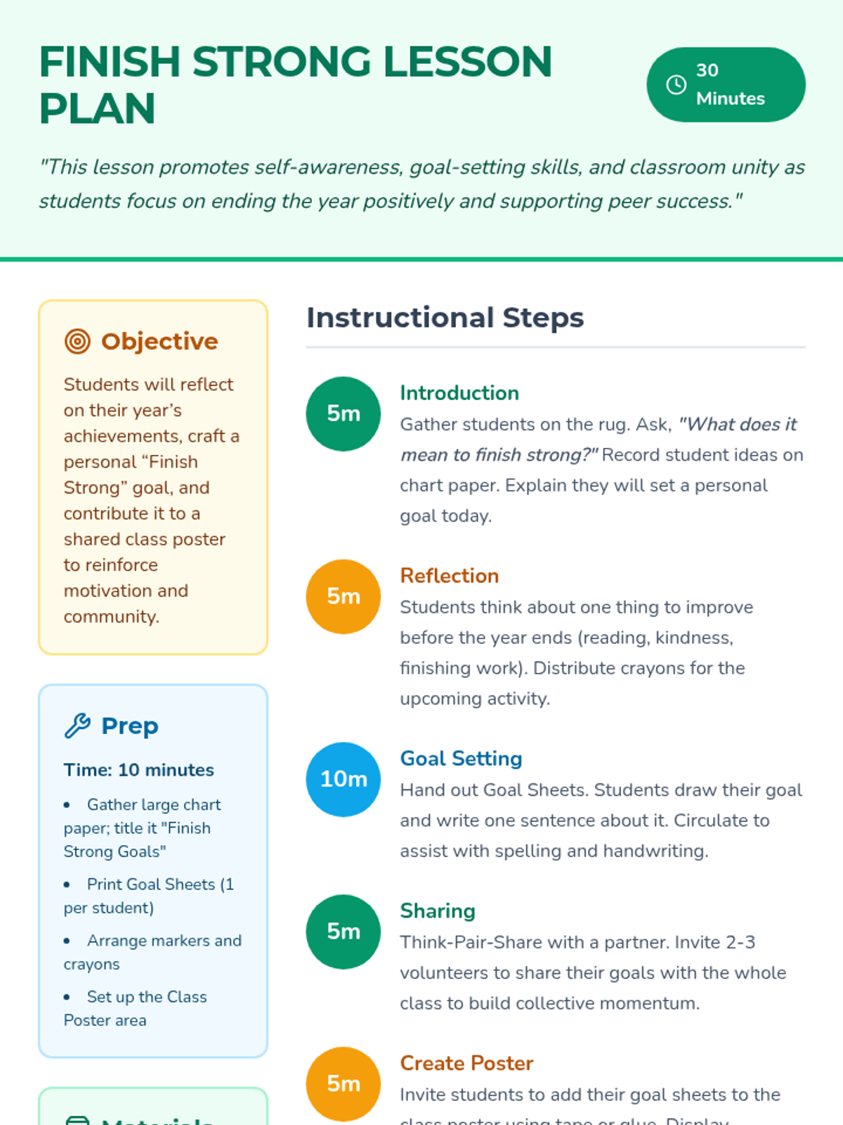 A high-energy, 30-minute lesson where 1st graders reflect on their year, set personal growth goals, and create a collaborative class poster to commit to finishing the school year on a high note.