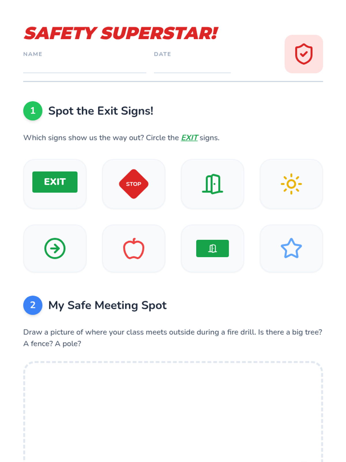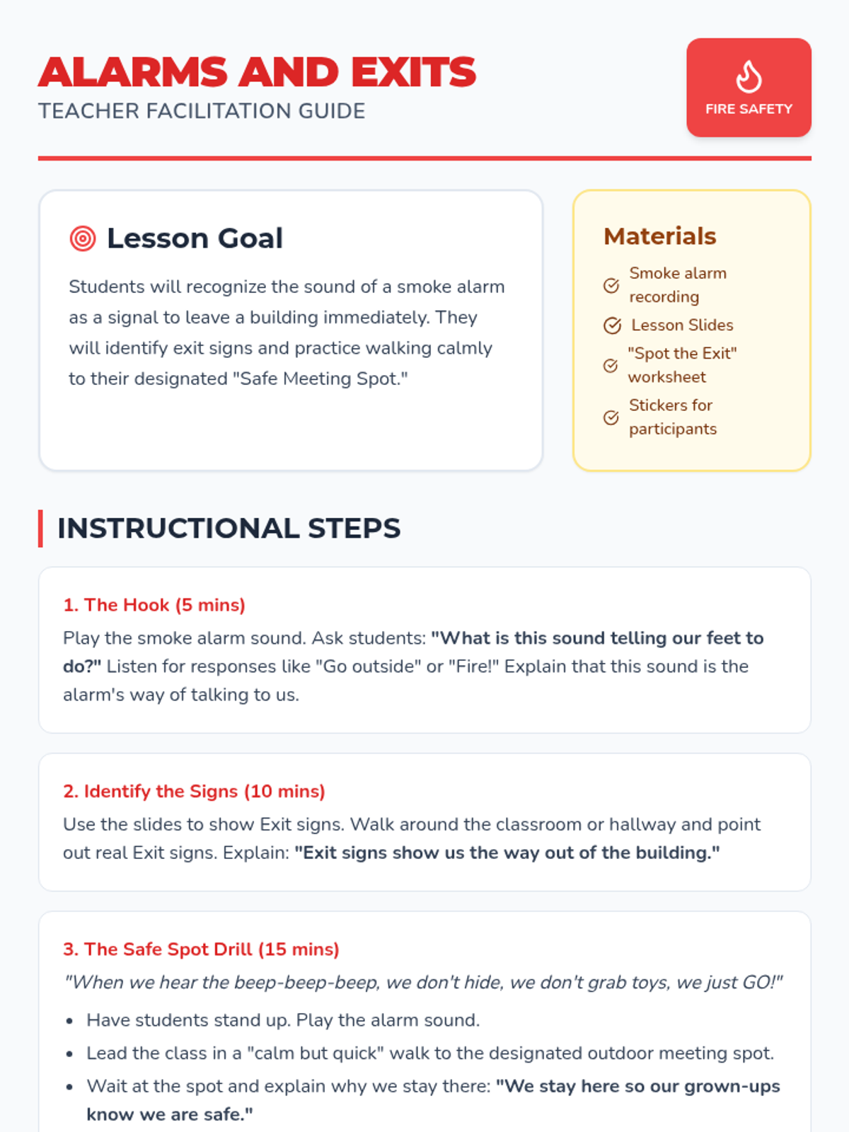 Students learn to recognize smoke alarm sounds, locate exit signs, and understand the importance of immediate evacuation to a meeting spot.