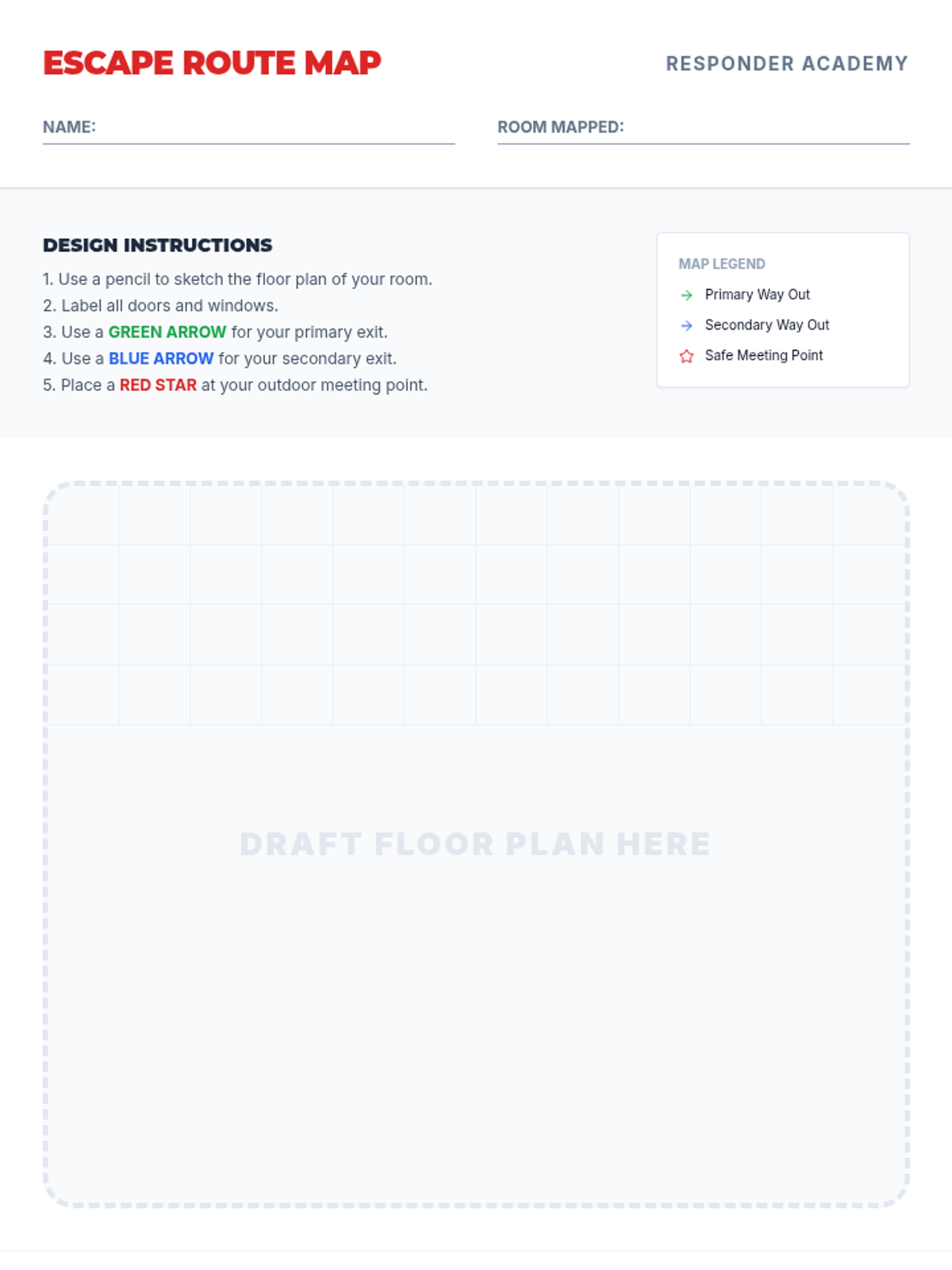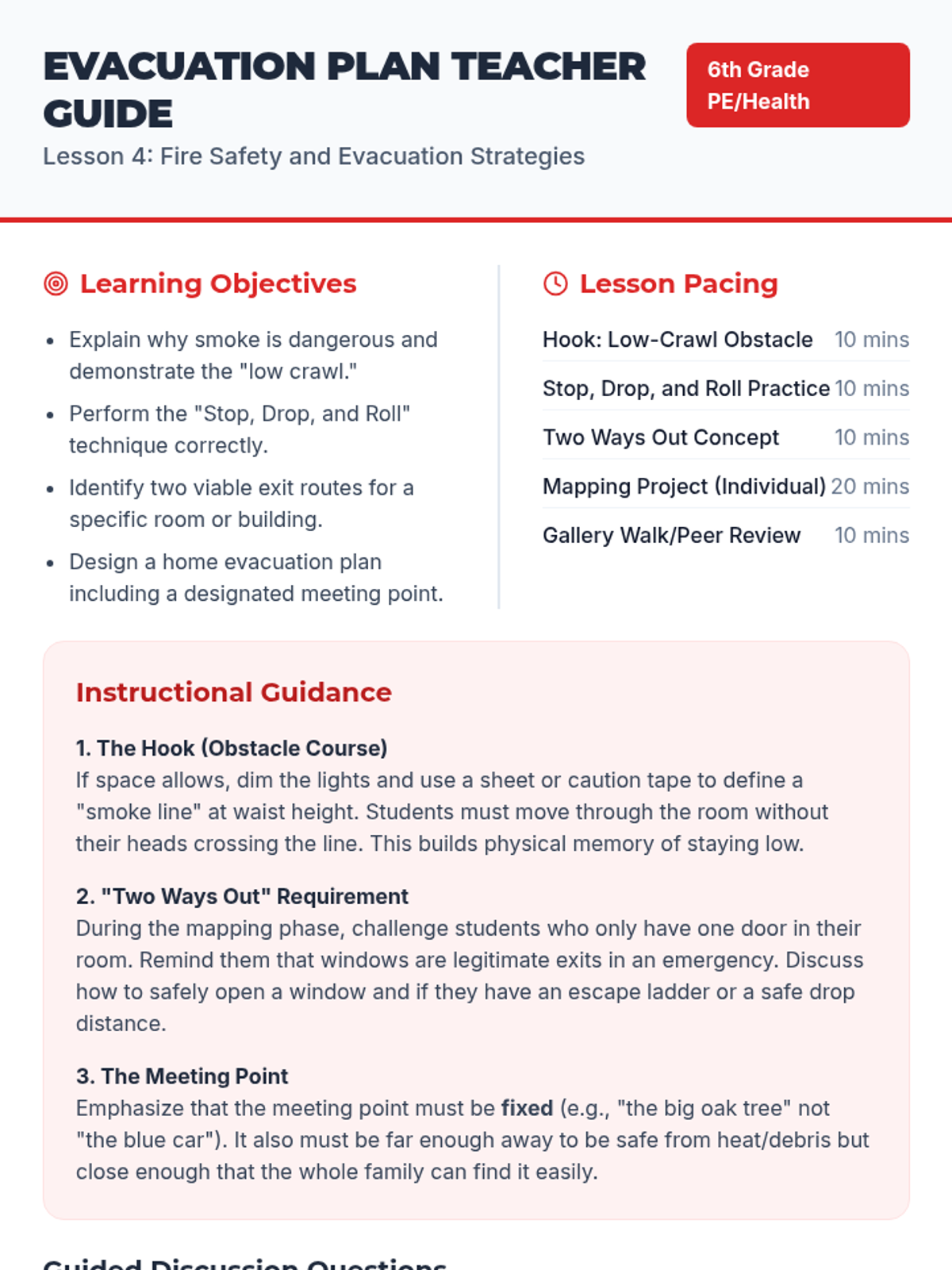 Students explore fire behavior and practice evacuation strategies, including 'Stop, Drop, and Roll' and home escape planning.