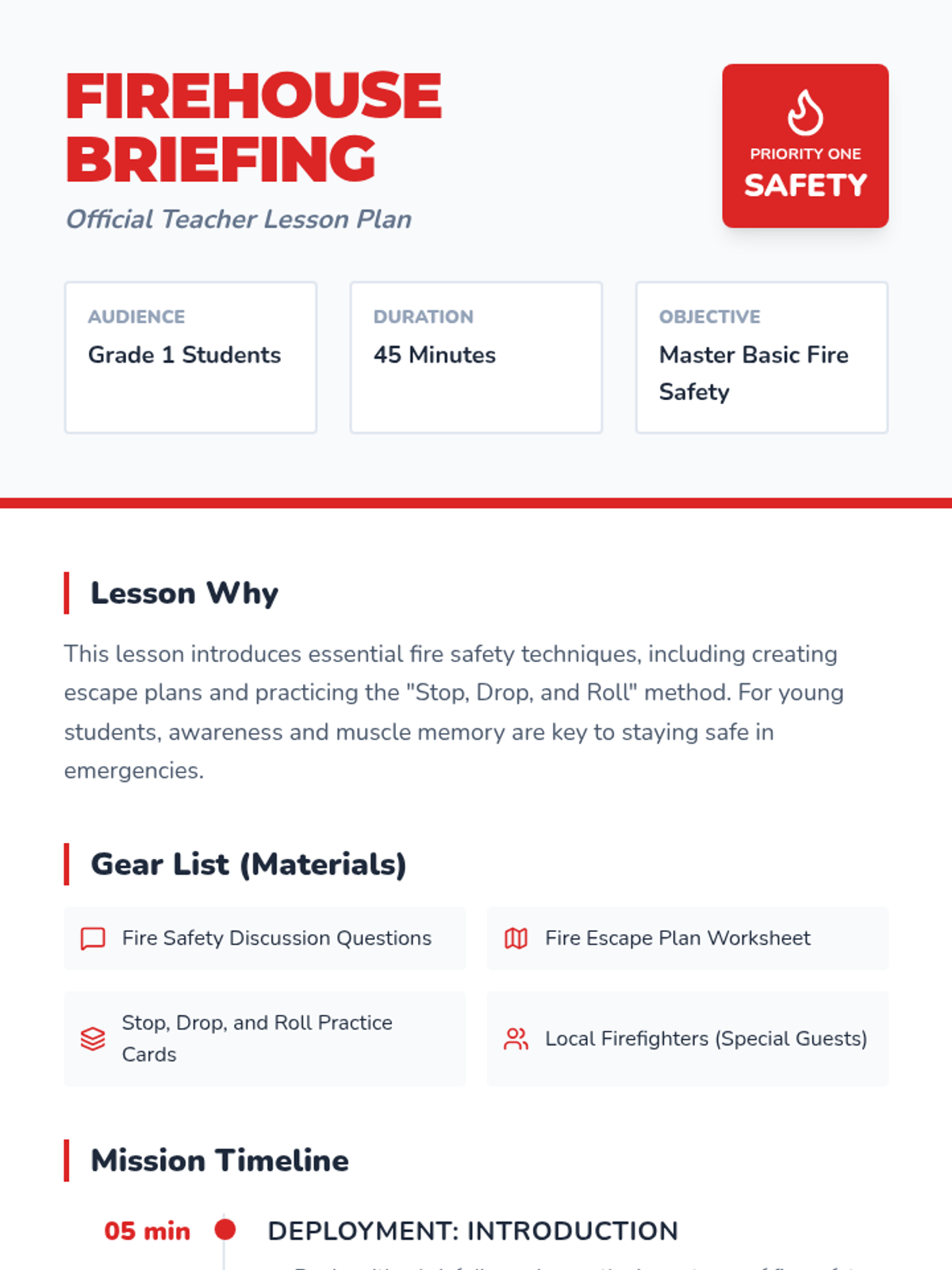 This lesson introduces Grade 1 students to essential fire safety techniques, including creating fire escape plans and practicing the stop, drop, and roll method. A visit from local firefighters provides real-world context for staying safe in emergencies.