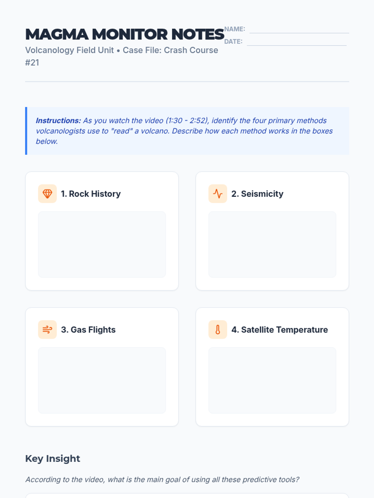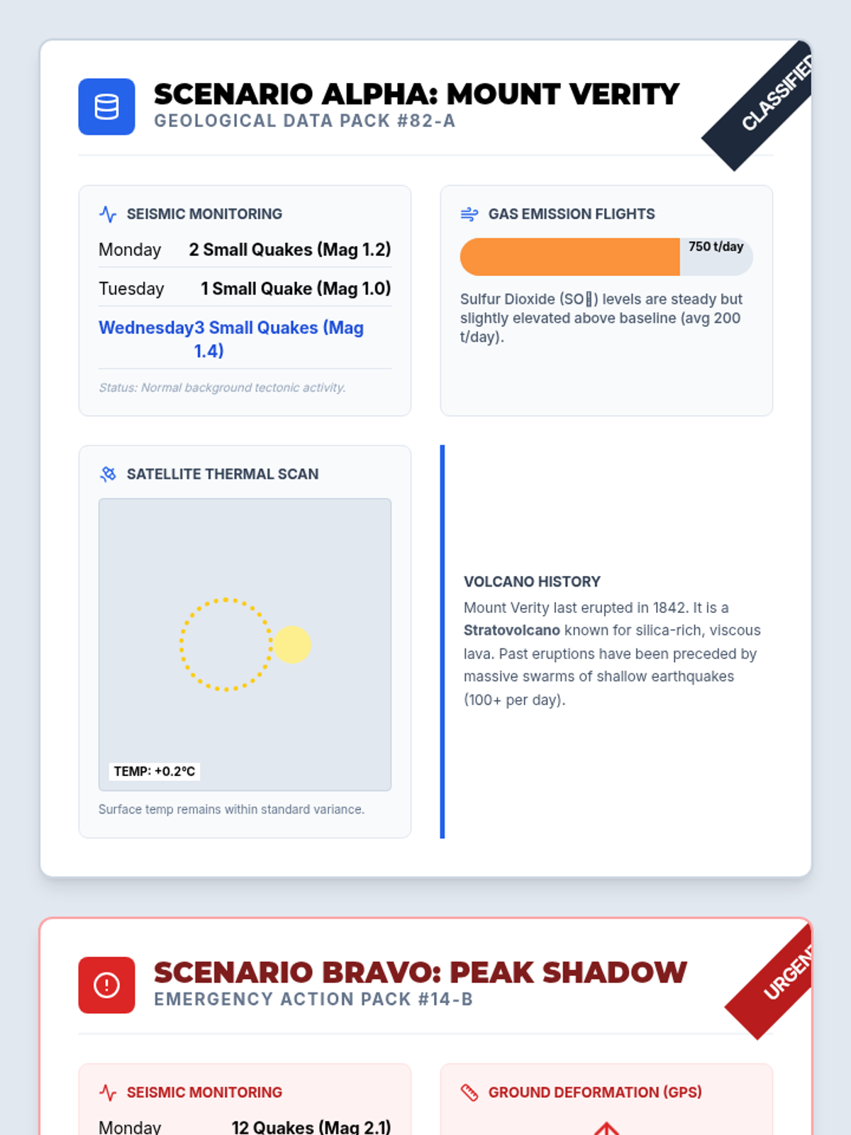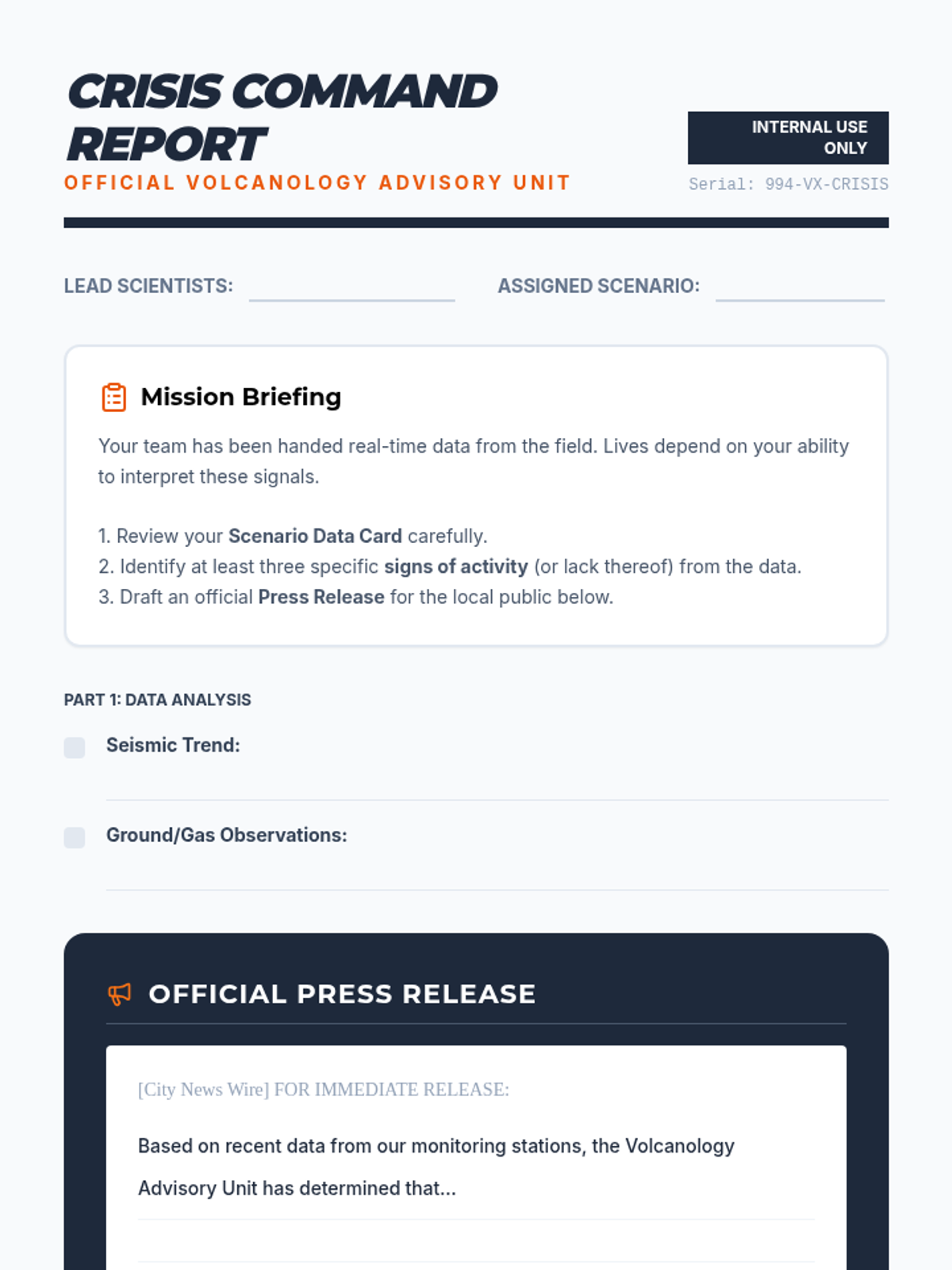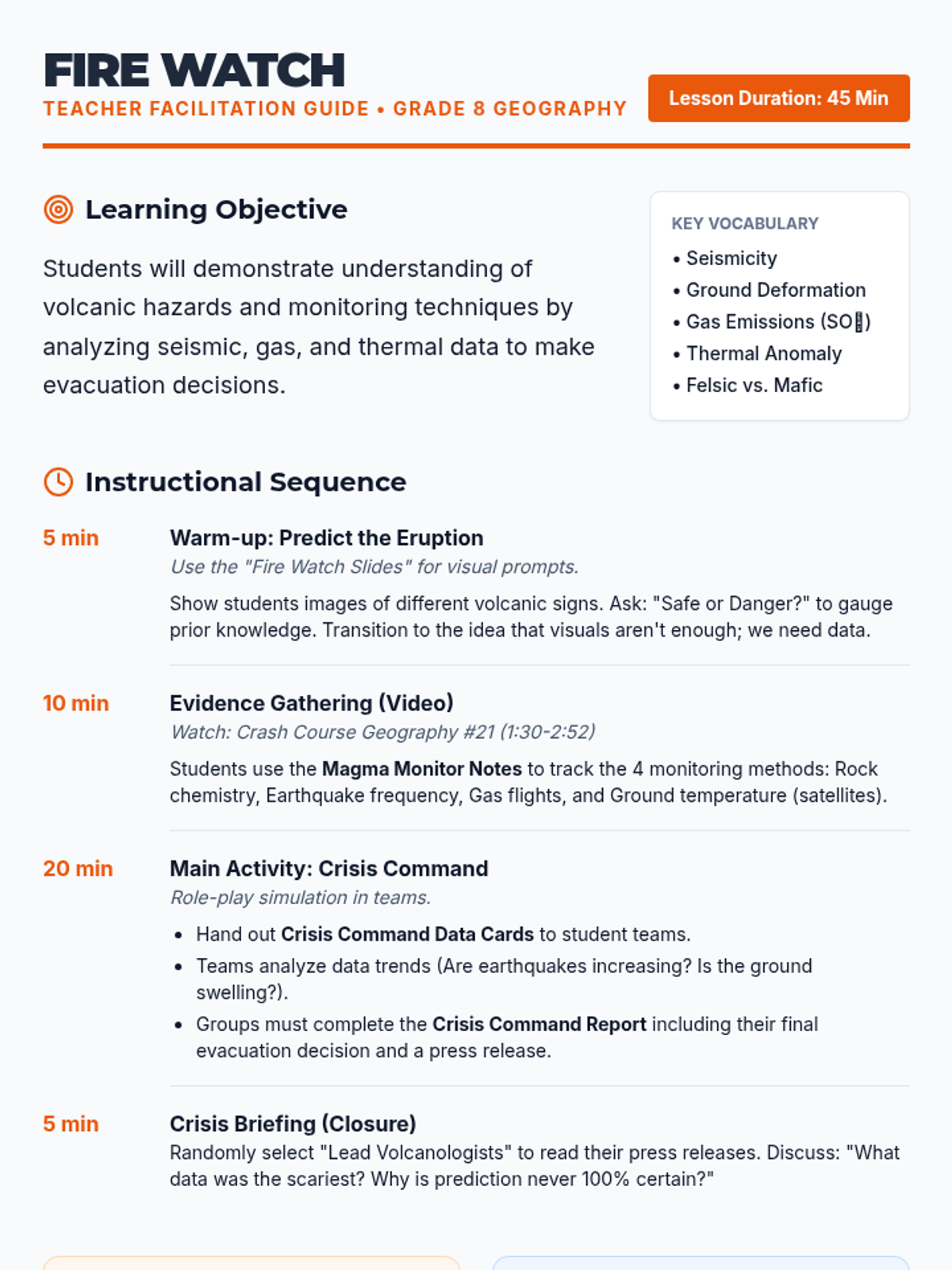 A high-stakes geography lesson where students act as volcanologists, analyzing real-time data to predict eruptions and manage emergency evacuations. Students learn about monitoring techniques like seismic activity, gas emissions, and ground deformation.