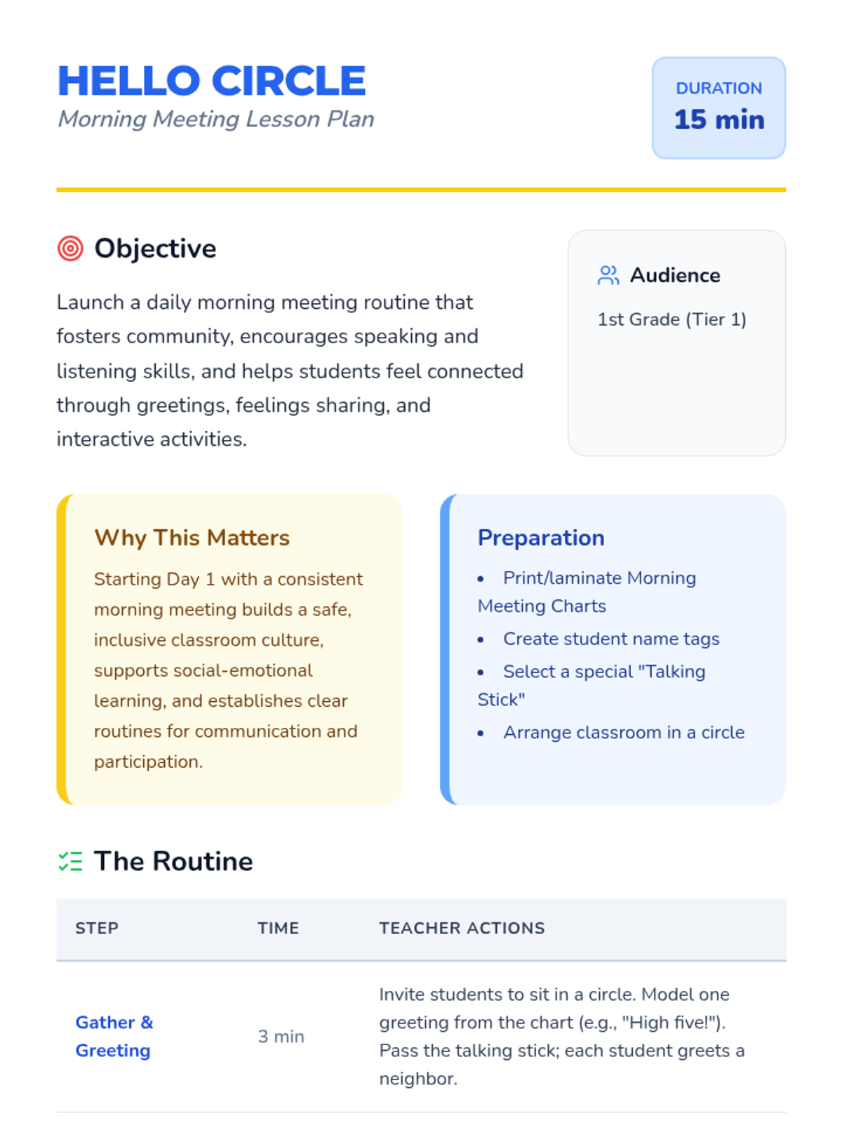 Kick off your 1st-grade class with a warm, engaging morning meeting that builds community, sets routines, and sparks enthusiasm. Students practice greetings, share feelings, and learn classroom expectations.
