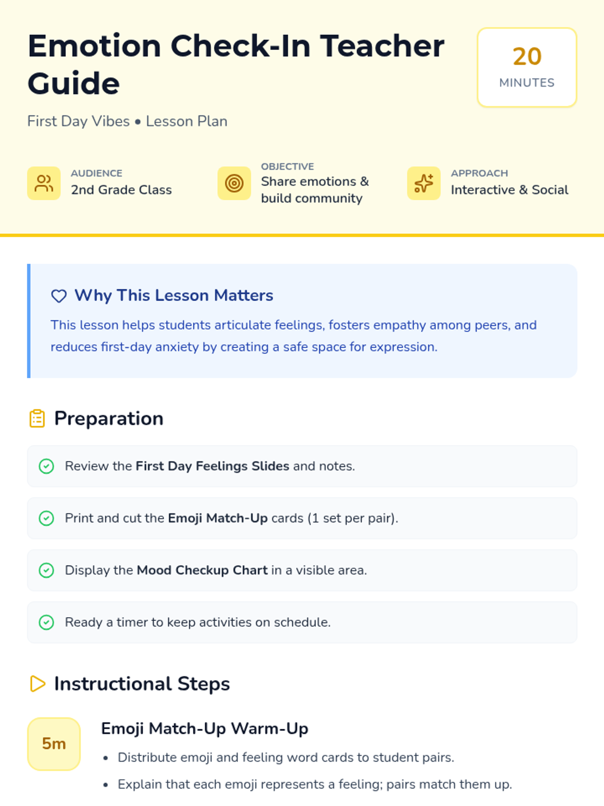 A fun, 20-minute Tier 1 lesson for 2nd graders to explore first-day emotions, build community, and set a positive classroom tone.