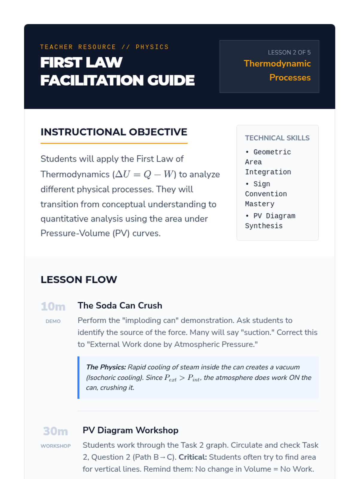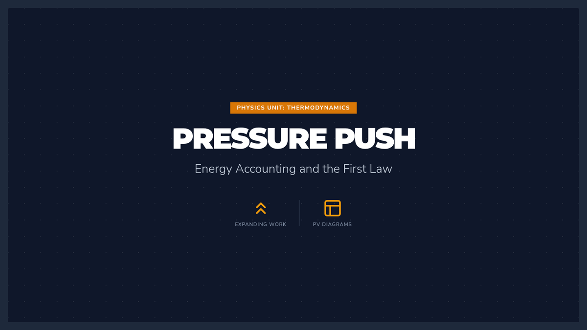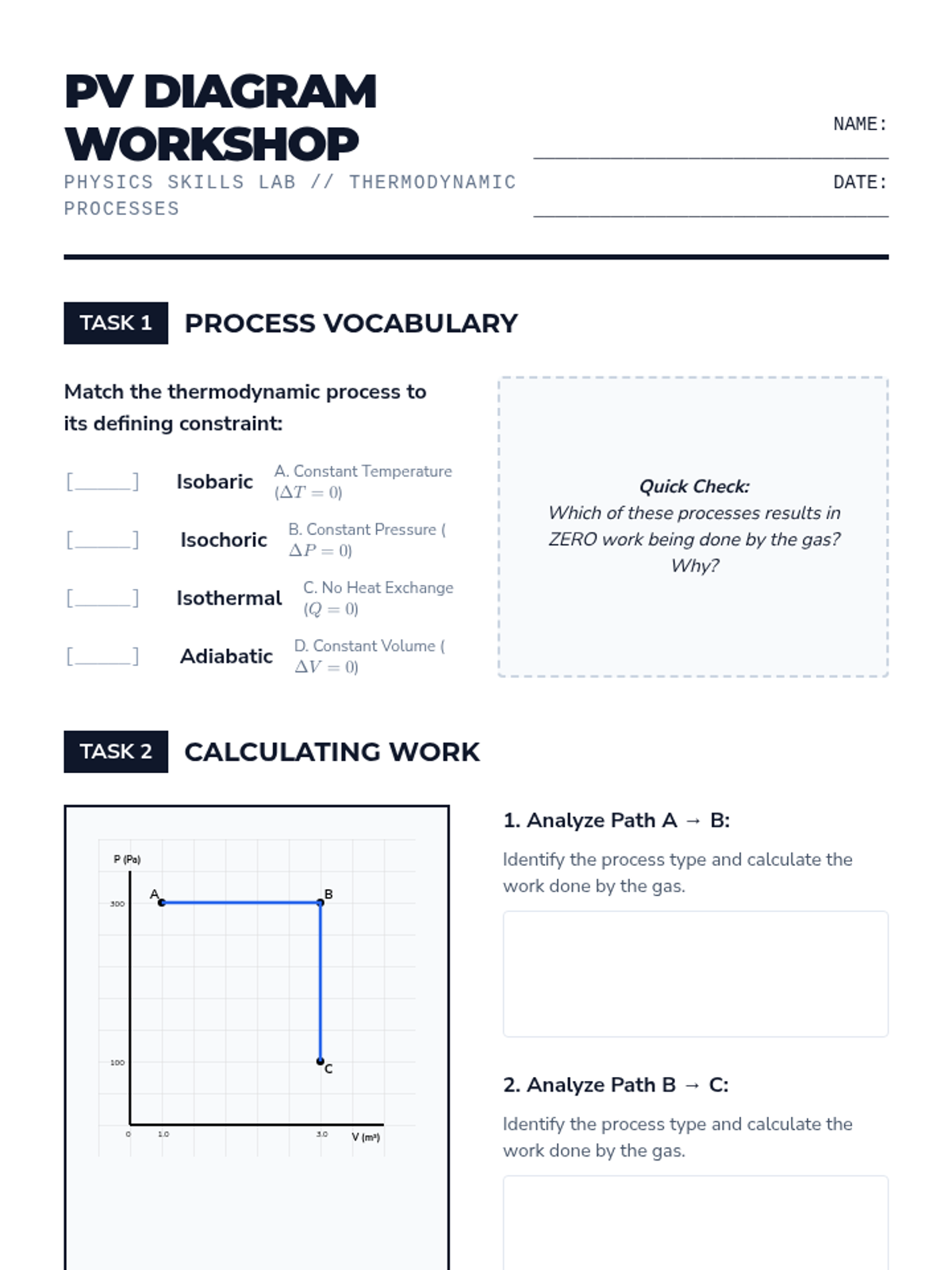 Learners investigate the First Law of Thermodynamics (conservation of energy) by analyzing isobaric, isochoric, isothermal, and adiabatic processes. They calculate work done by expanding gases using Pressure-Volume (PV) diagrams.