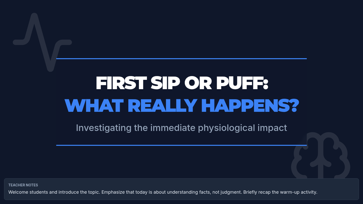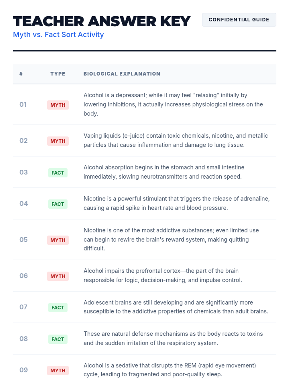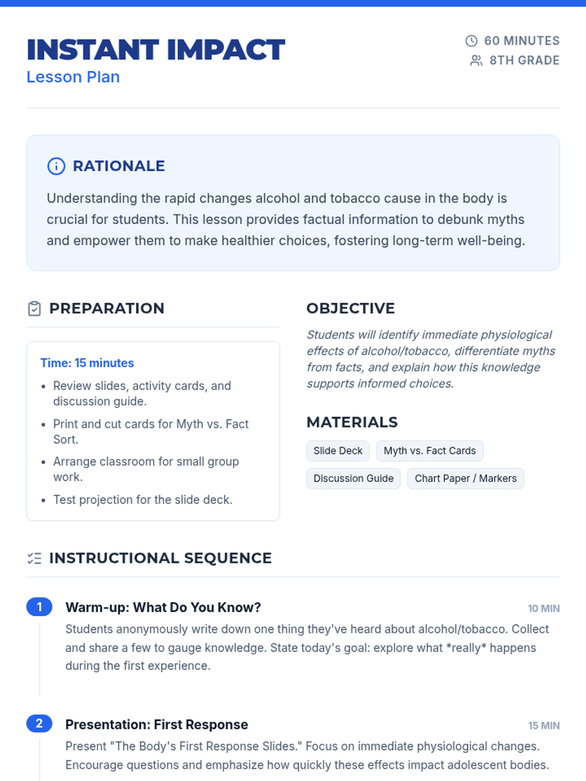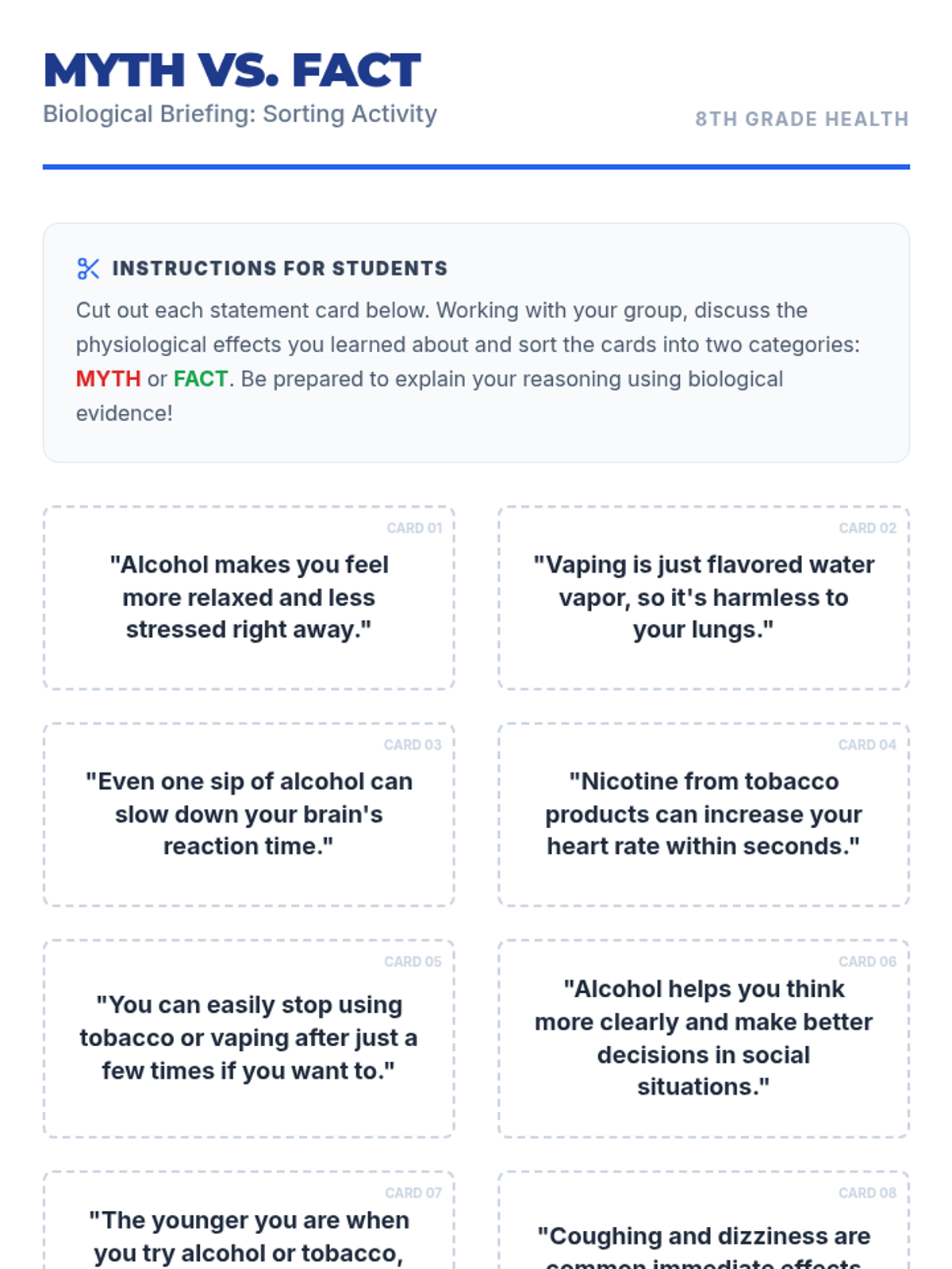 This lesson explores the immediate physiological effects of alcohol and tobacco on the adolescent body, debunking common myths and providing factual information. Through a slide presentation, sorting activity, and guided discussion, 8th-grade students learn how these substances rapidly affect the brain, heart, and lungs, empowering them to make informed decisions.