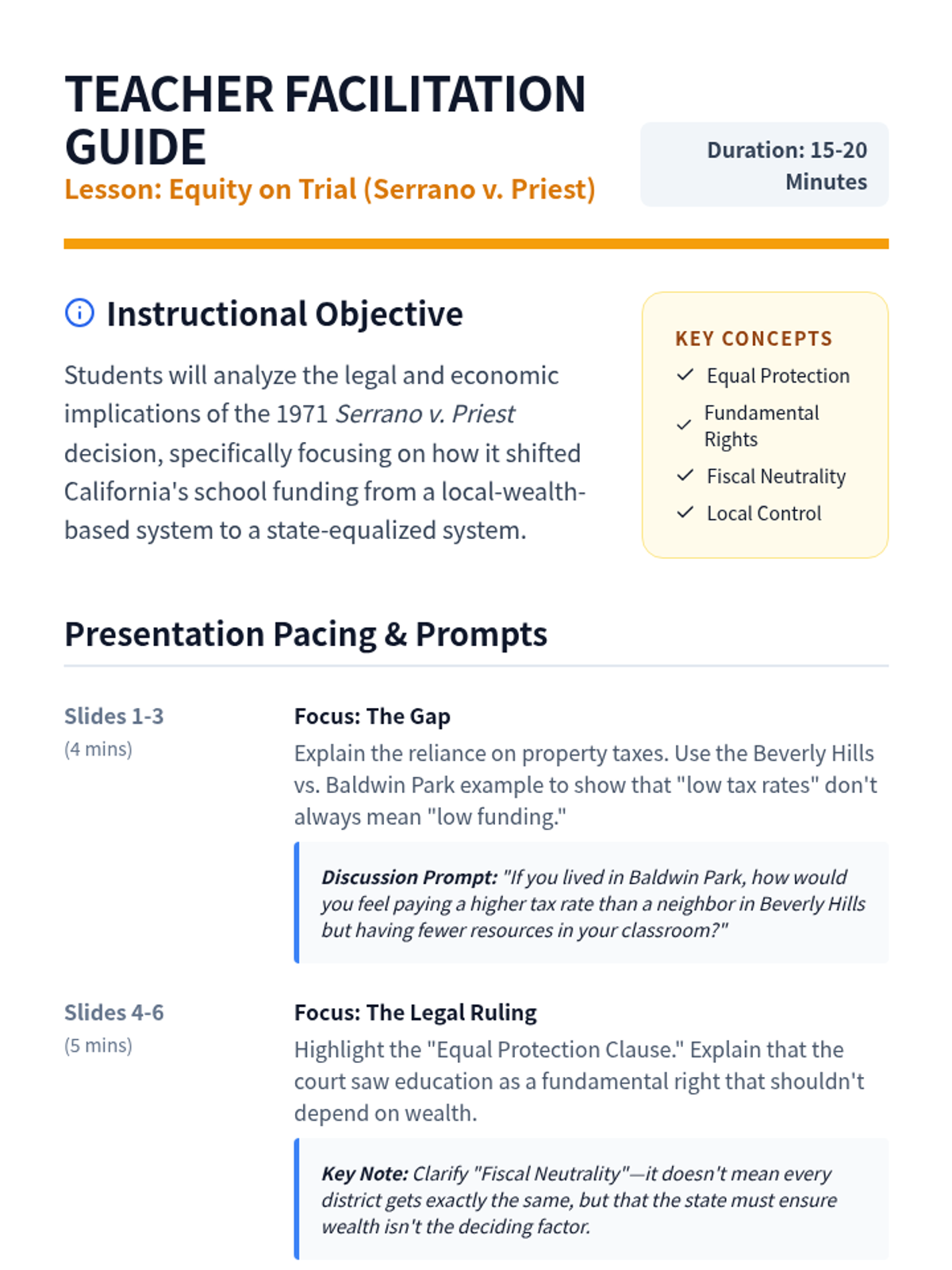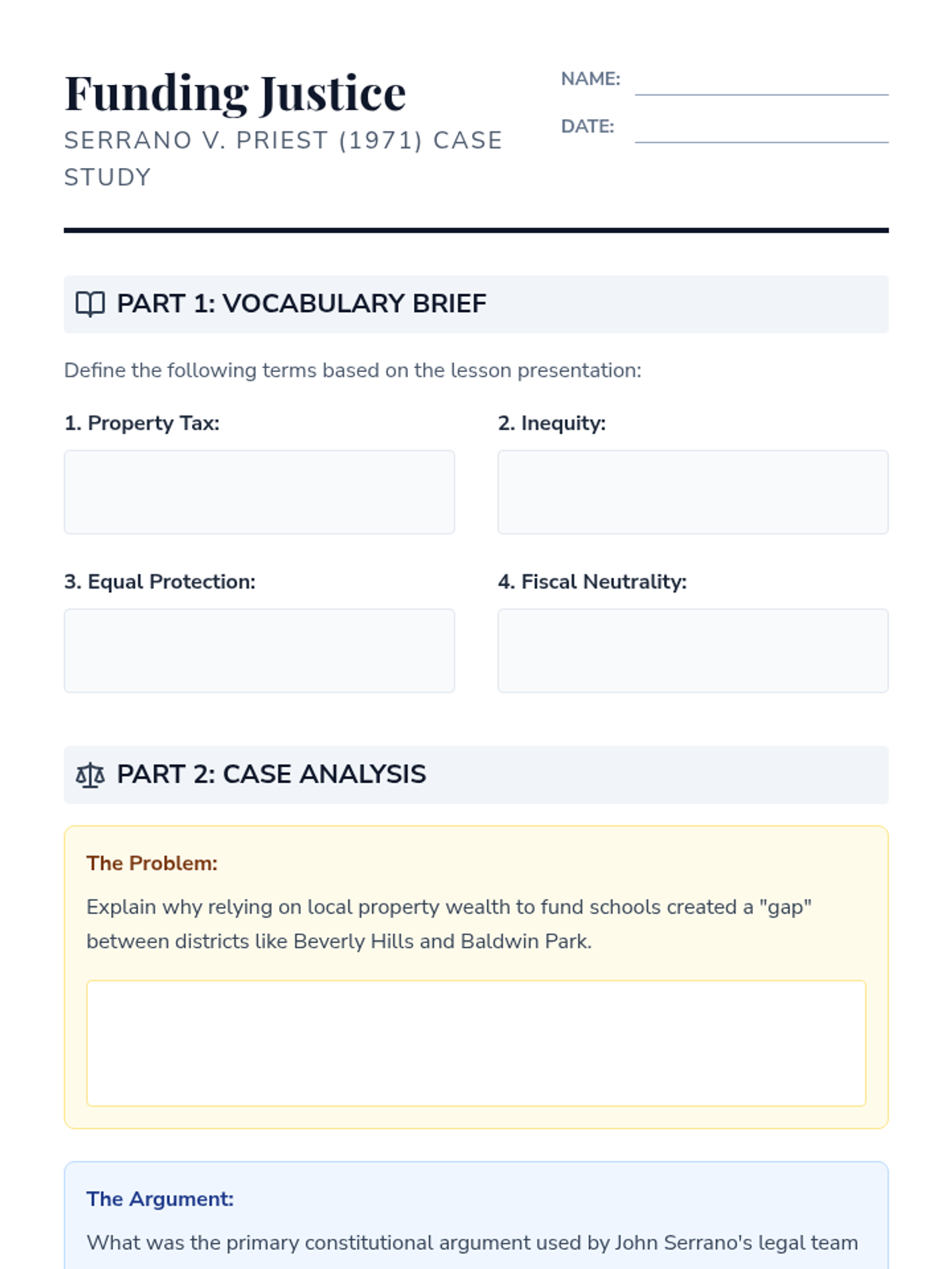 This lesson explores the landmark California Supreme Court case Serrano v. Priest (1971), which challenged the constitutionality of using local property taxes to fund public schools. Students will analyze the legal arguments for educational equity and the long-term impact on school finance in California.