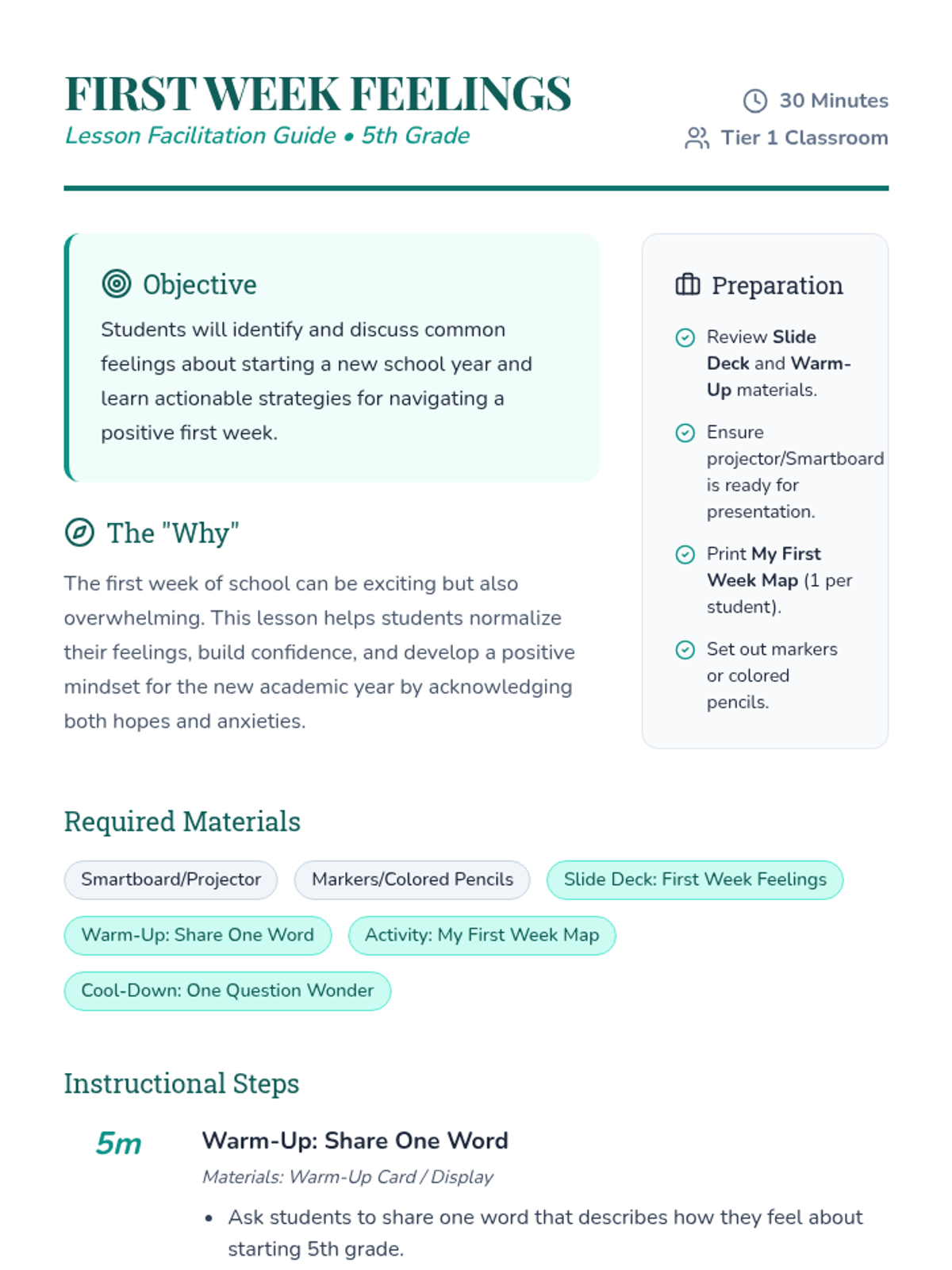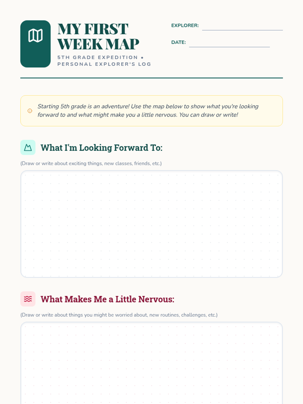 A 30-minute 5th-grade lesson designed to normalize back-to-school anxieties and build excitement through discussion and mapping activities.