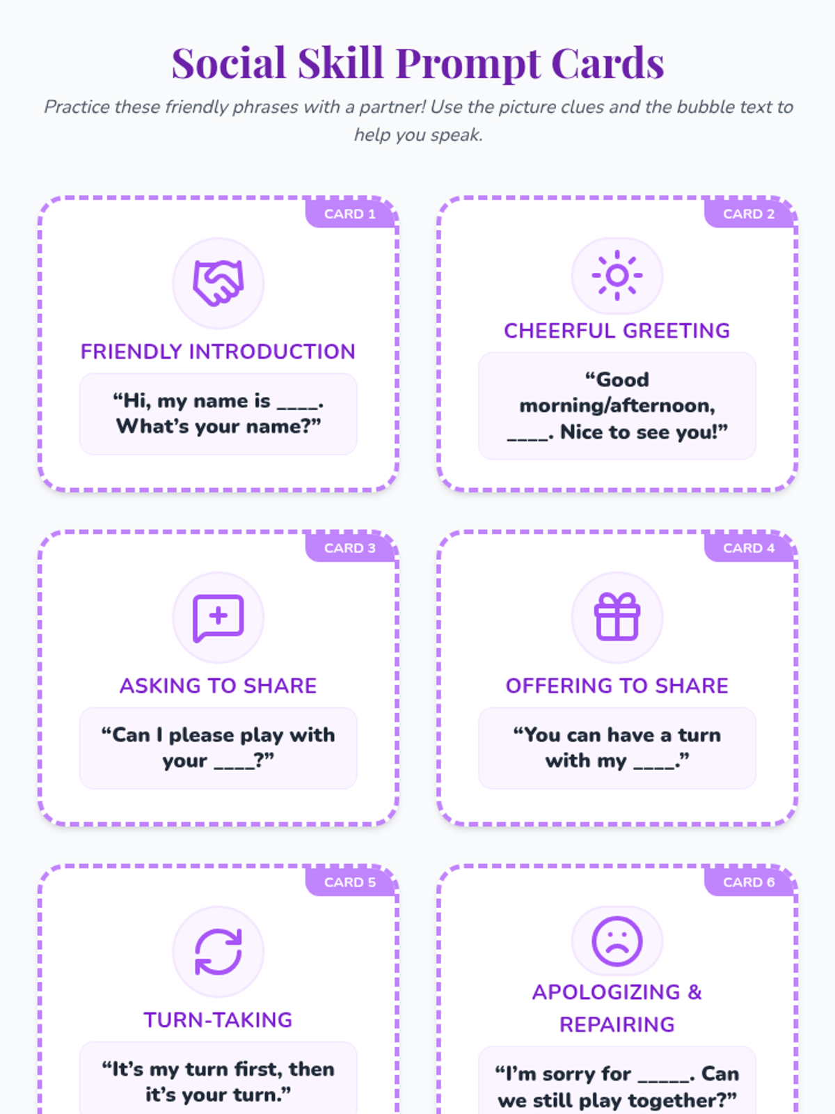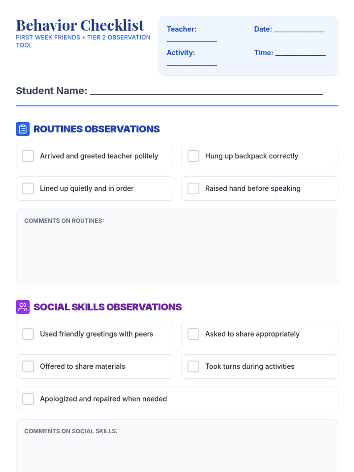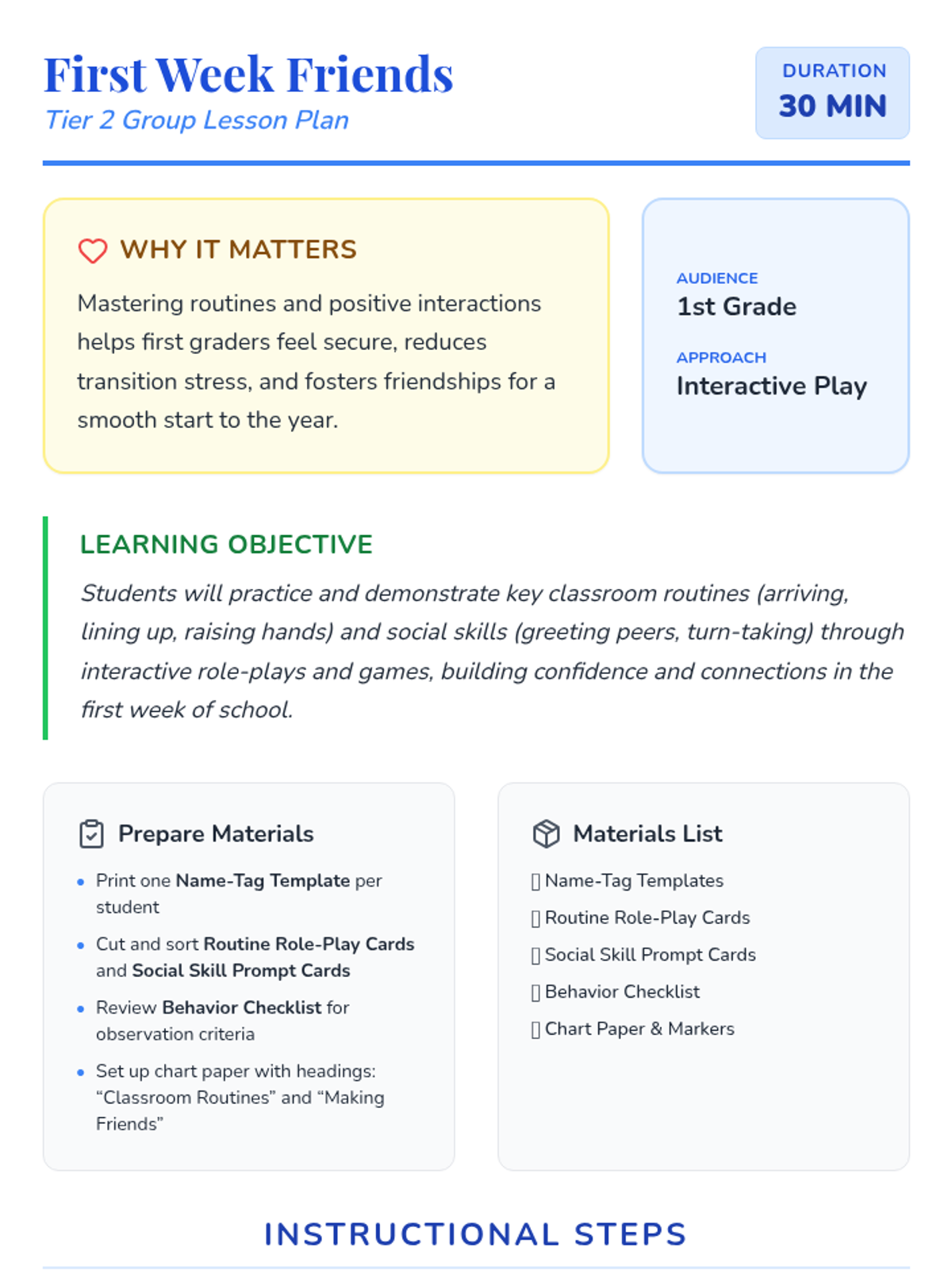 A 30-minute Tier 2 group lesson for 1st graders focusing on classroom routines and basic social skills like greetings and turn-taking. through role-plays and interactive games, students build confidence and peer connections.