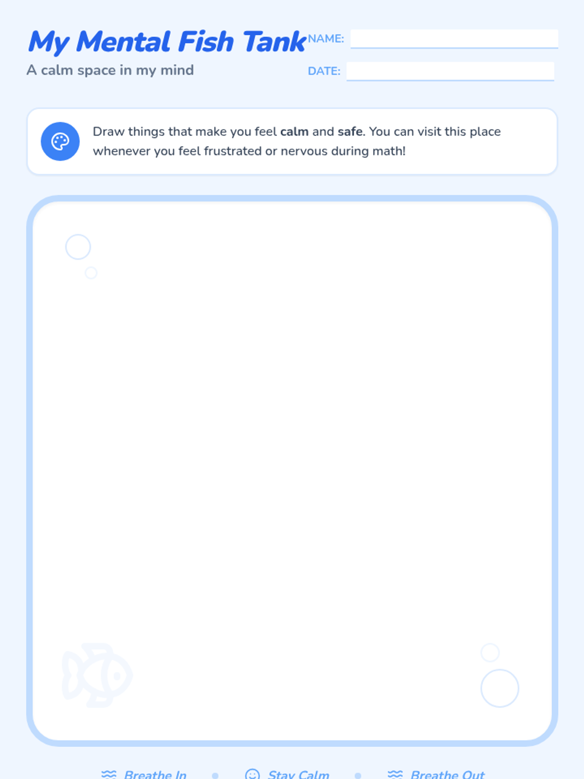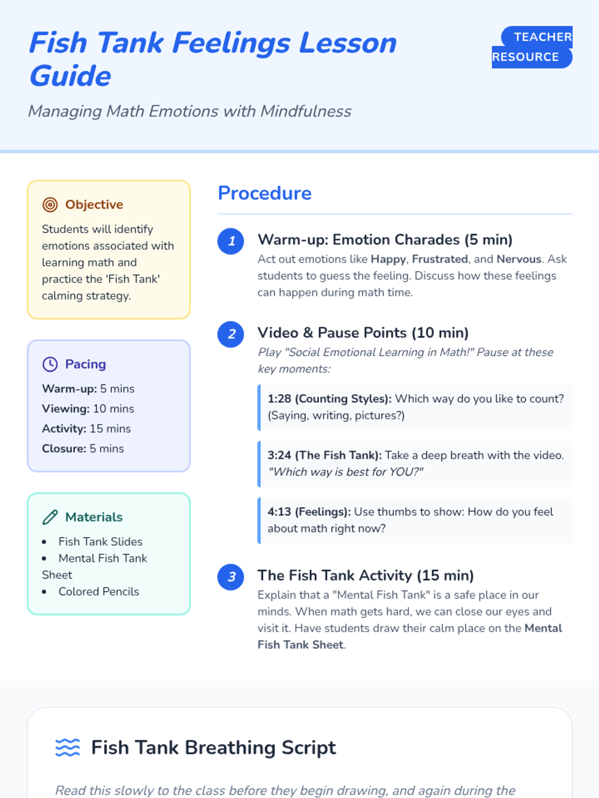 A social-emotional learning lesson for 1st-2nd graders focused on identifying math-related feelings and practicing the 'Fish Tank' mindfulness technique.