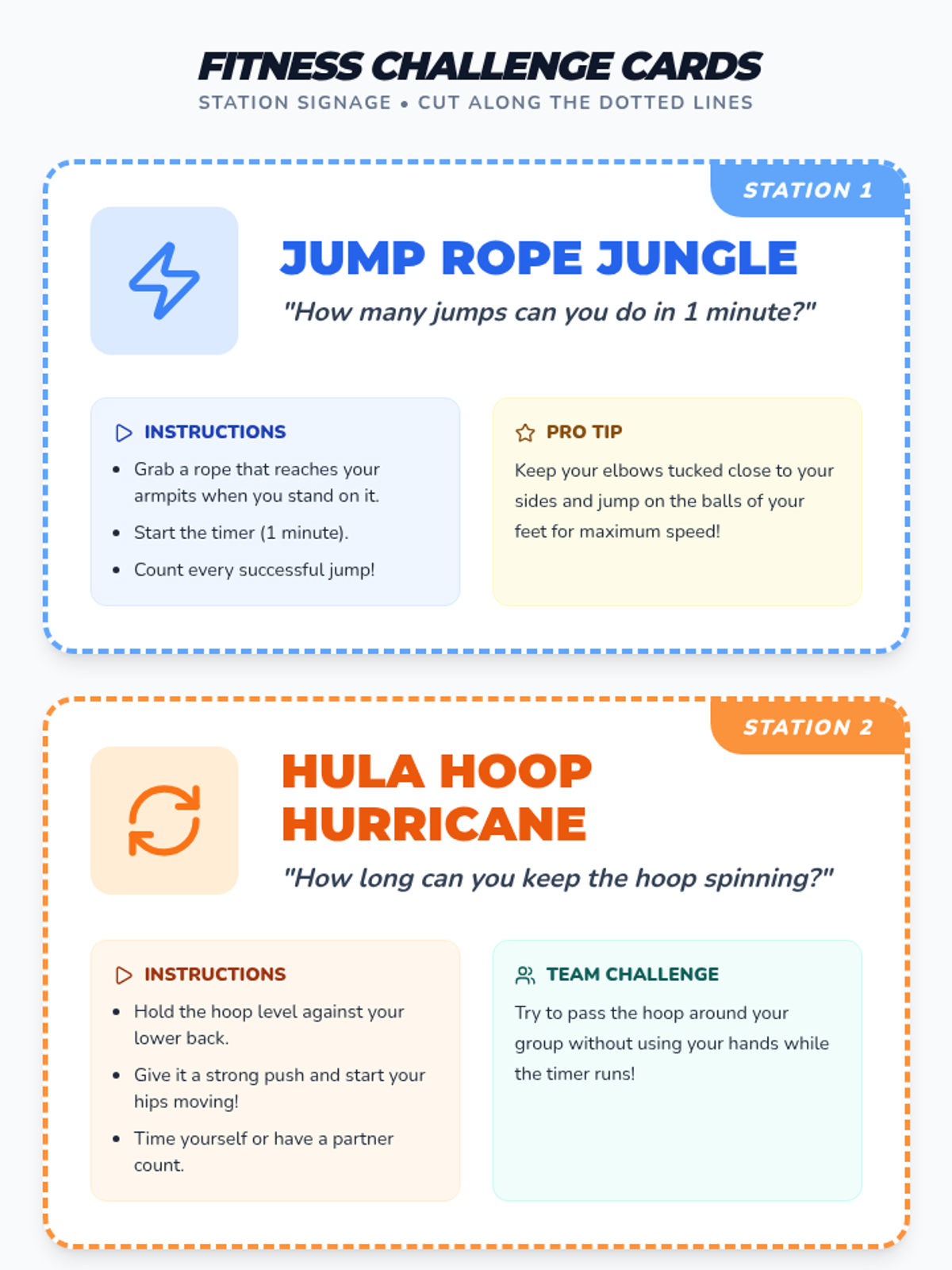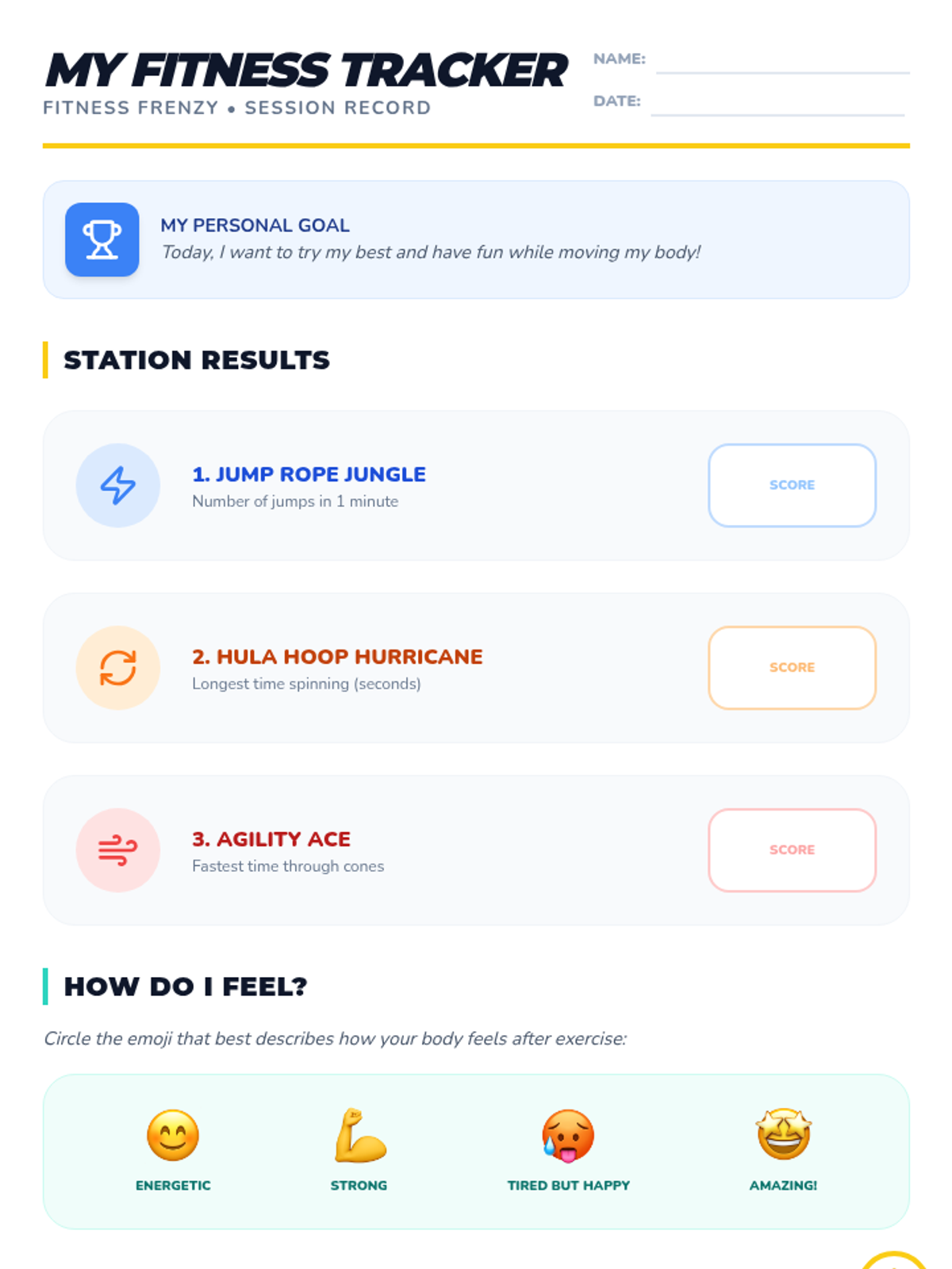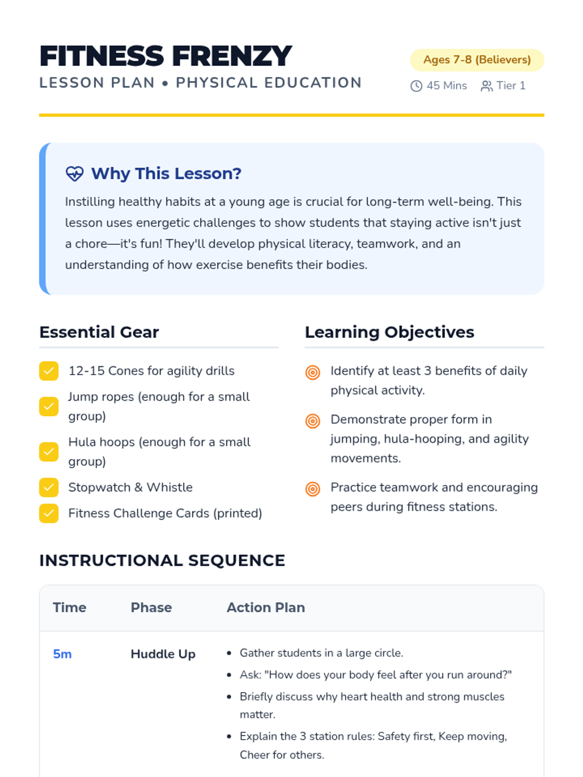 A high-energy lesson focused on physical activity, featuring fitness stations, agility drills, and teamwork challenges for students aged 7-8.