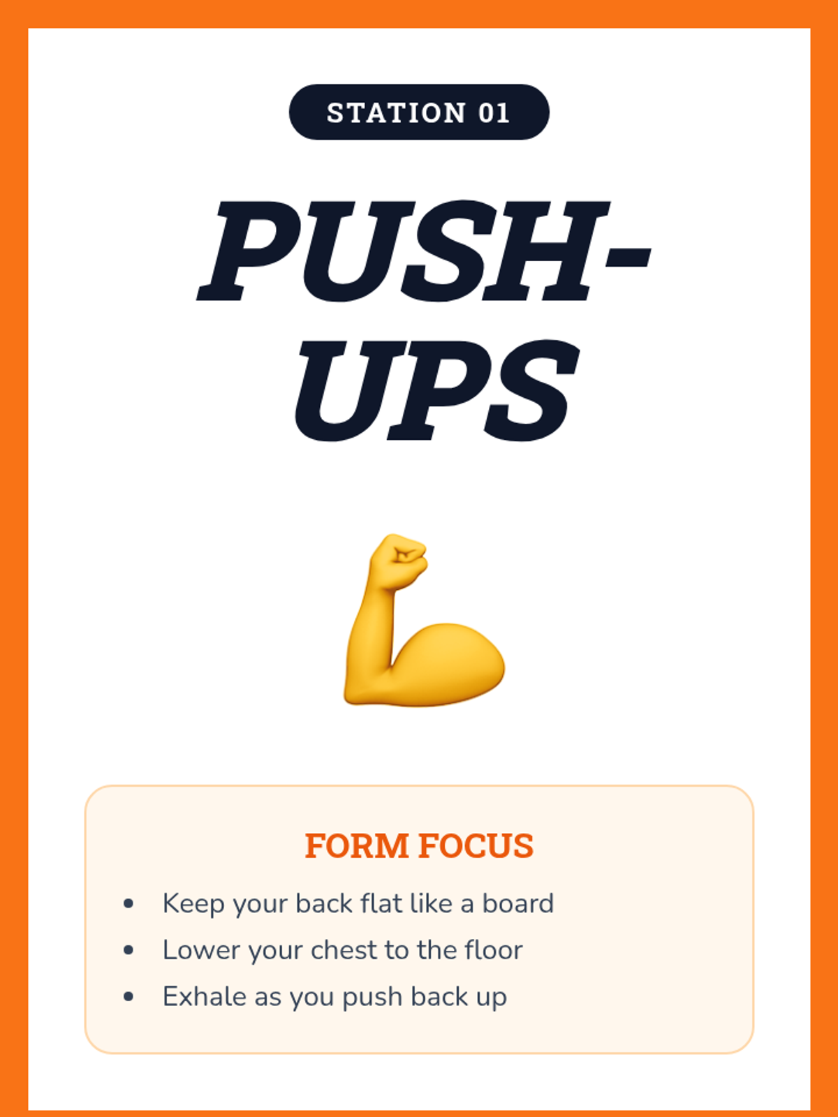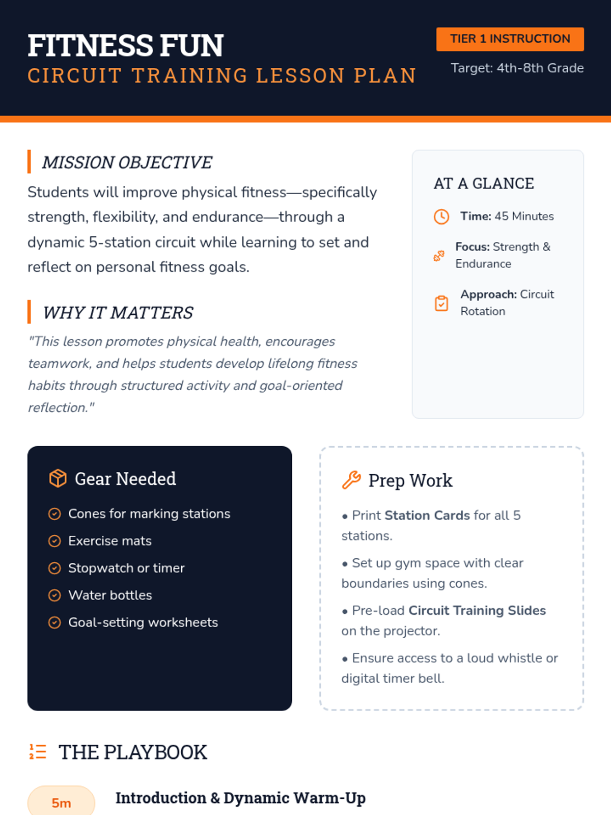 This lesson engages students in a fun and dynamic circuit training session designed to improve their physical fitness through strength, flexibility, and endurance exercises. Students will participate in a 5-station circuit and set personal fitness goals to foster motivation and healthy habits.
