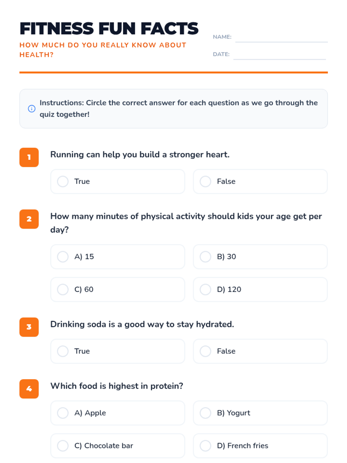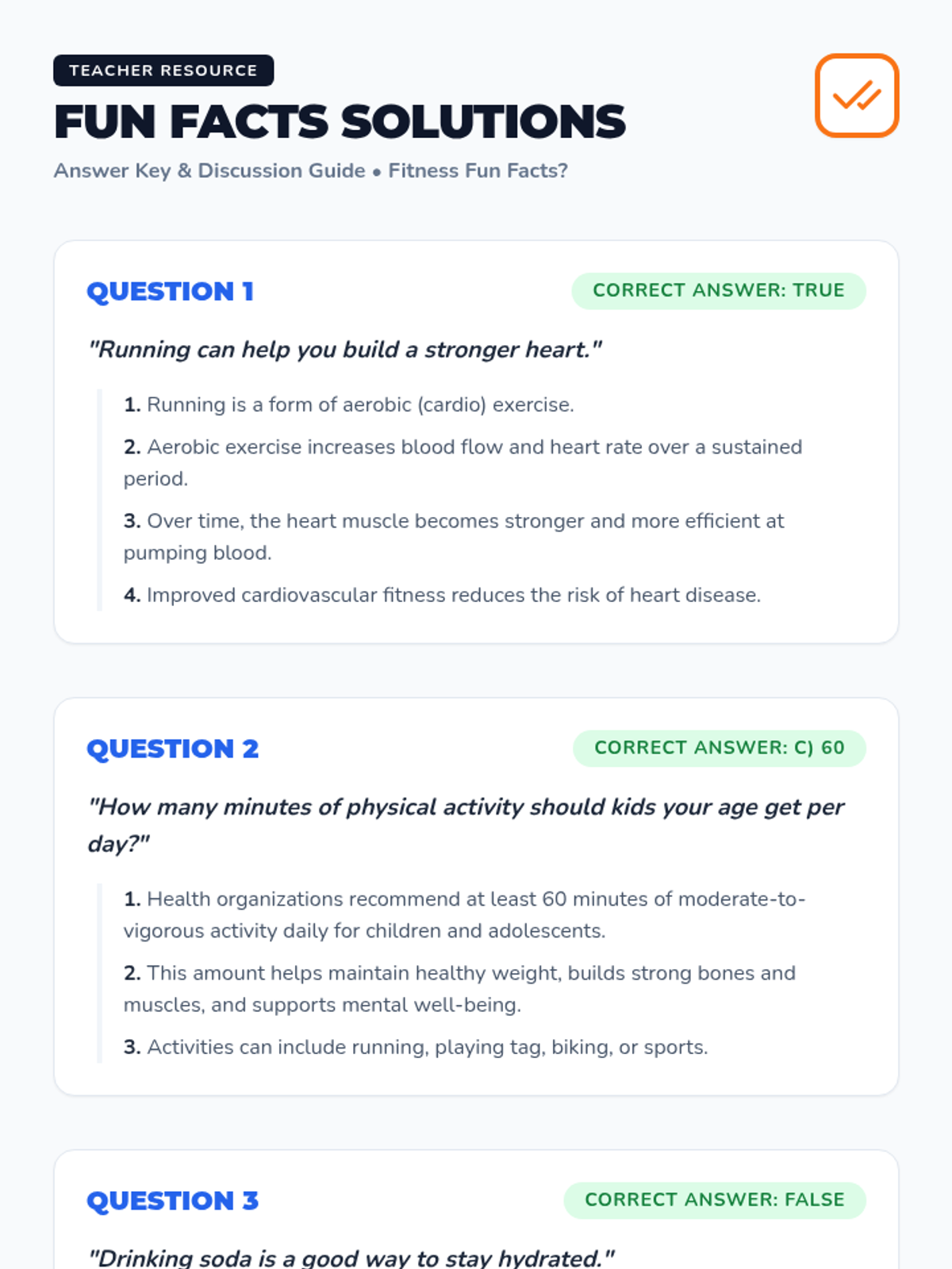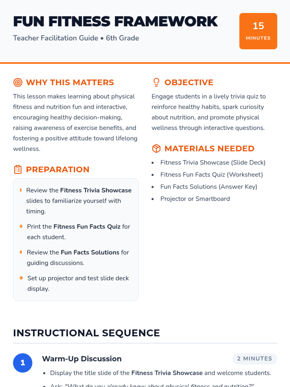 A lively 15-minute quiz-based lesson for 6th graders introducing healthy habits through fun fitness trivia. This Tier 1 classroom activity boosts engagement and reinforces physical activity benefits.