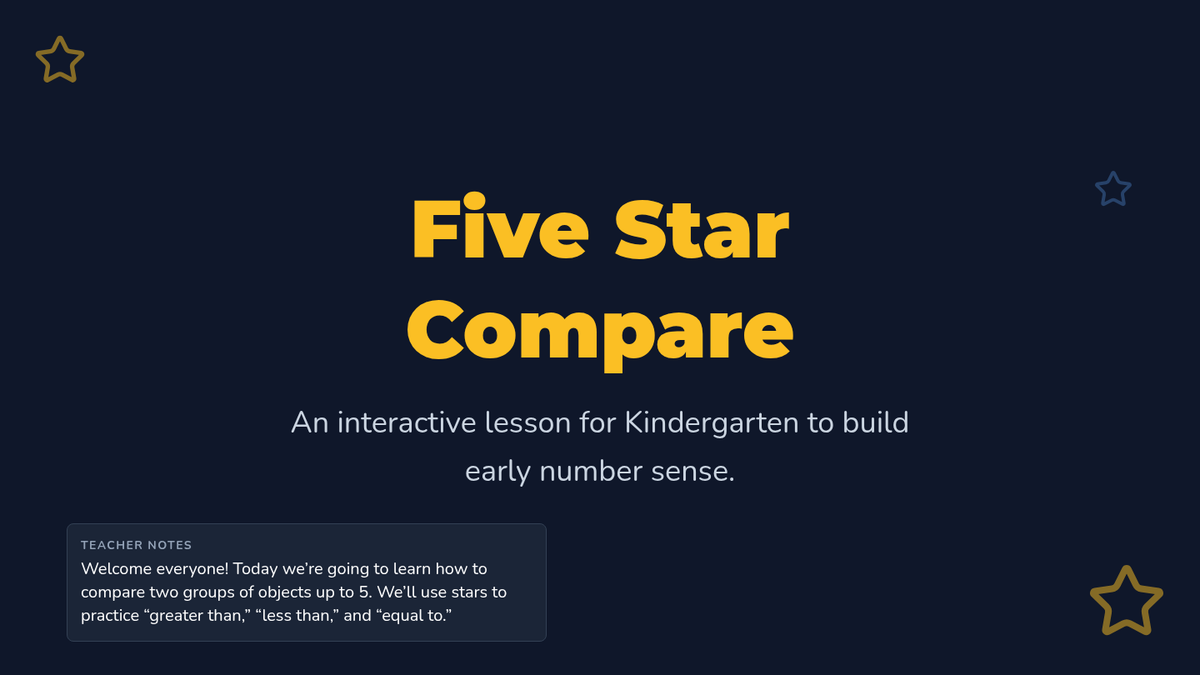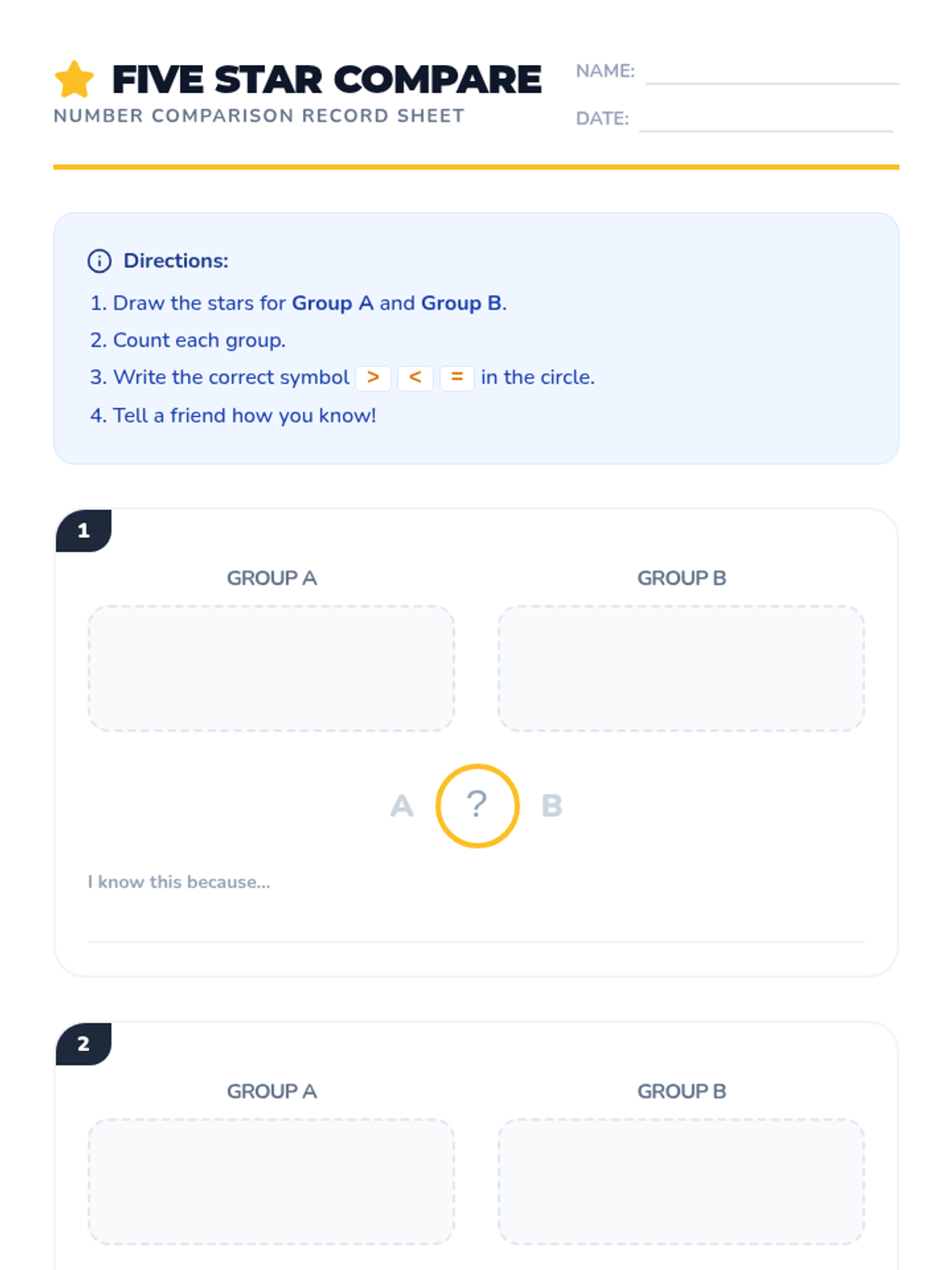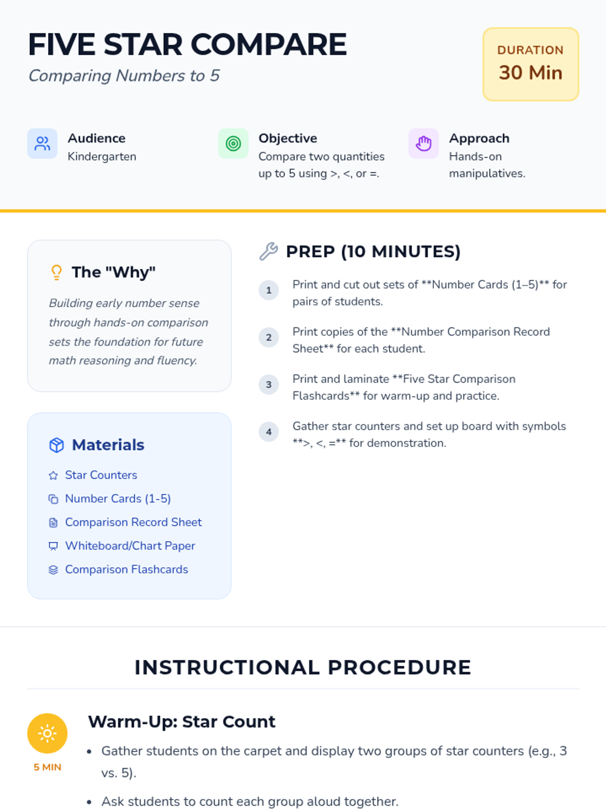 In this engaging kindergarten lesson, students will compare numbers up to 5 using hands-on activities and visual models. This lesson develops early number sense and lays the foundation for understanding quantity, which is essential for future math success.