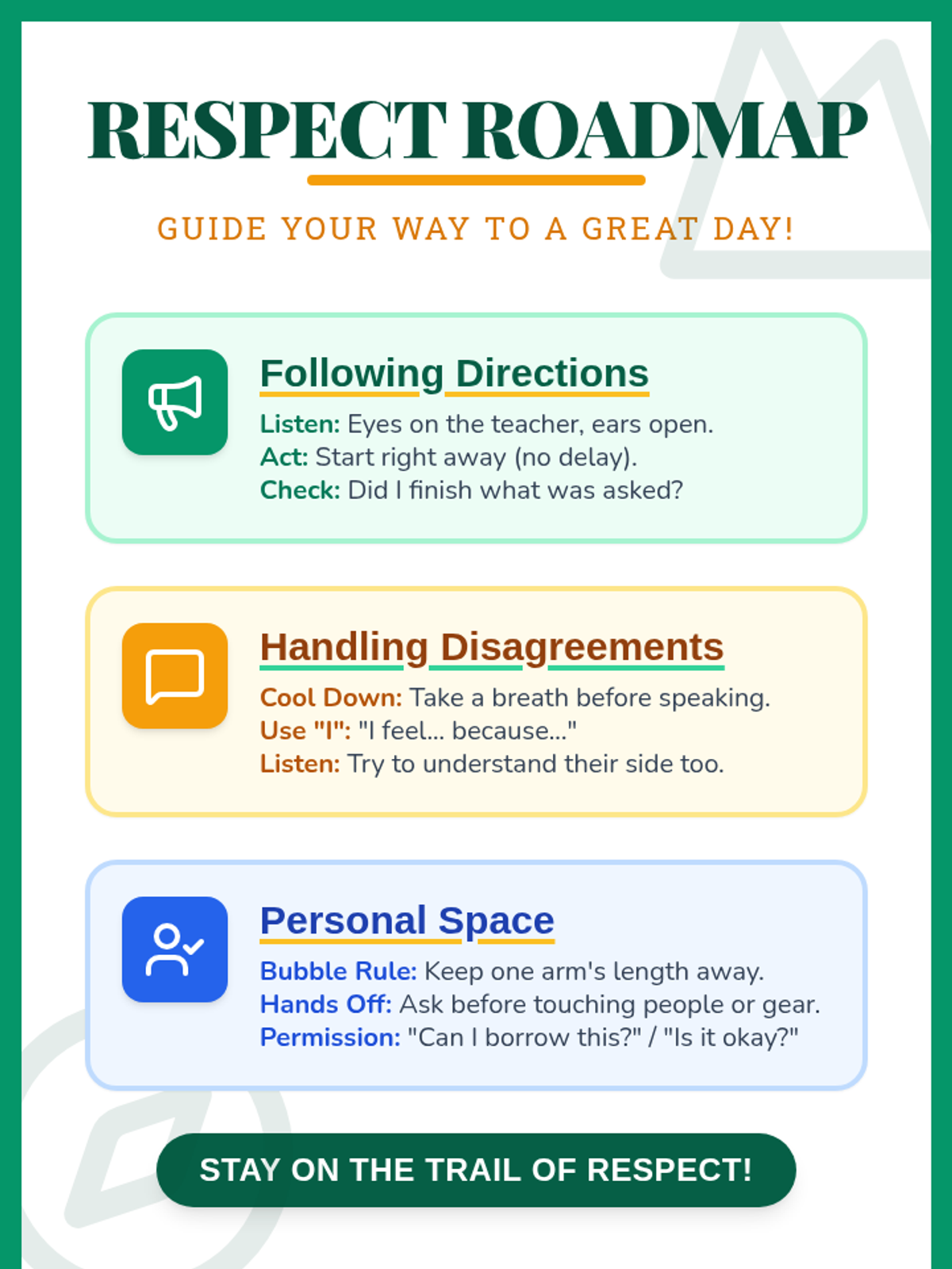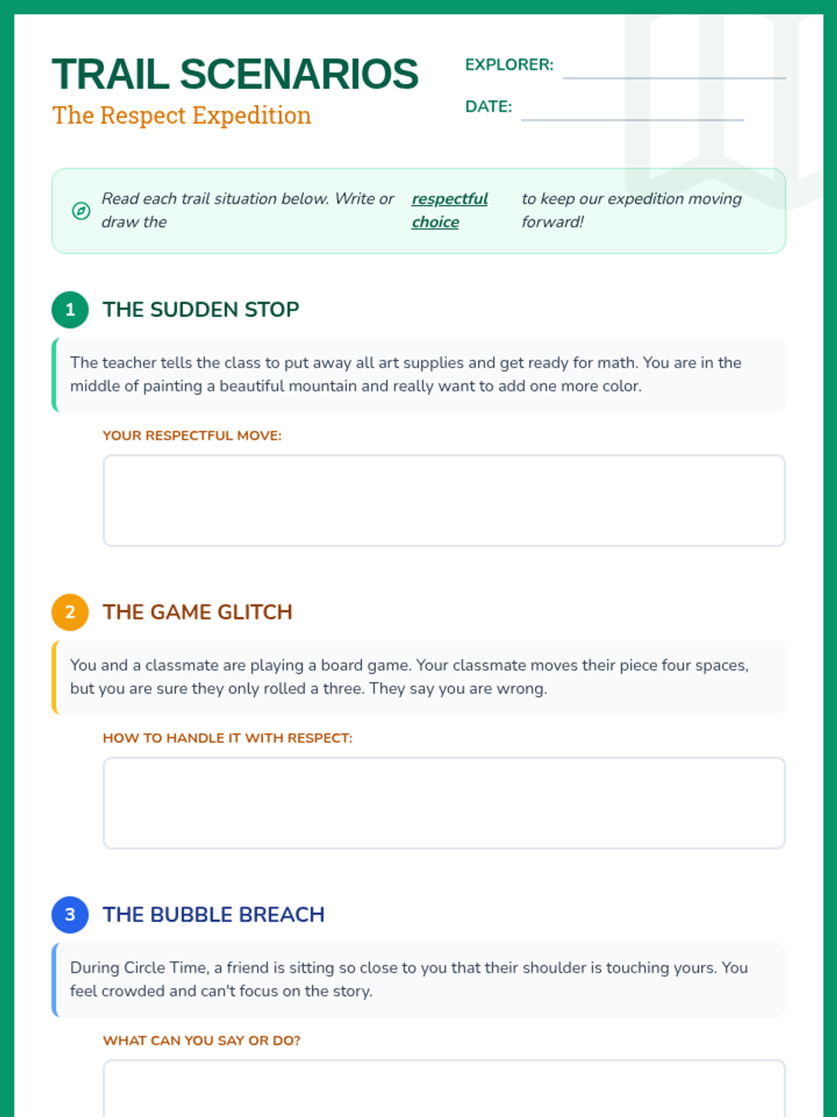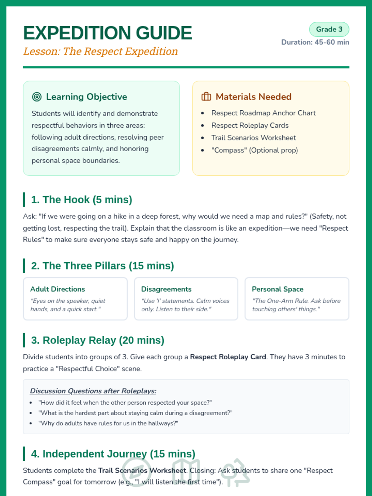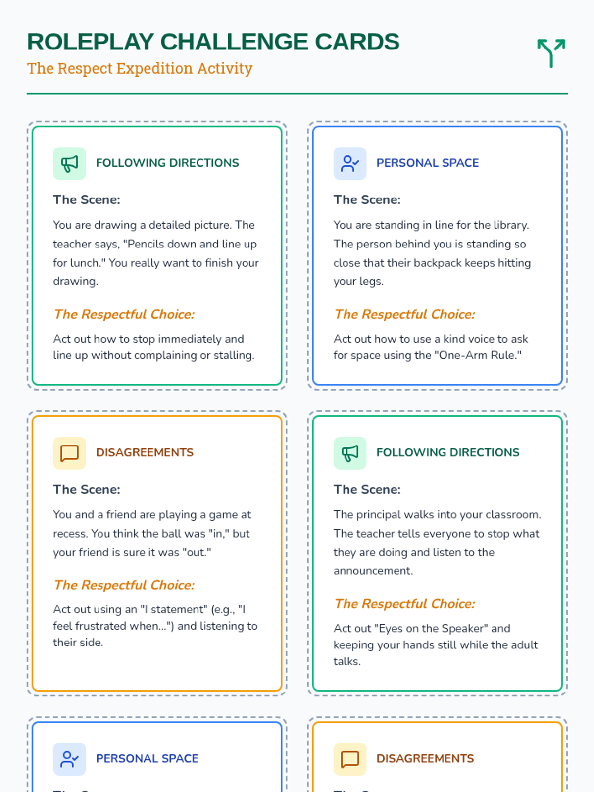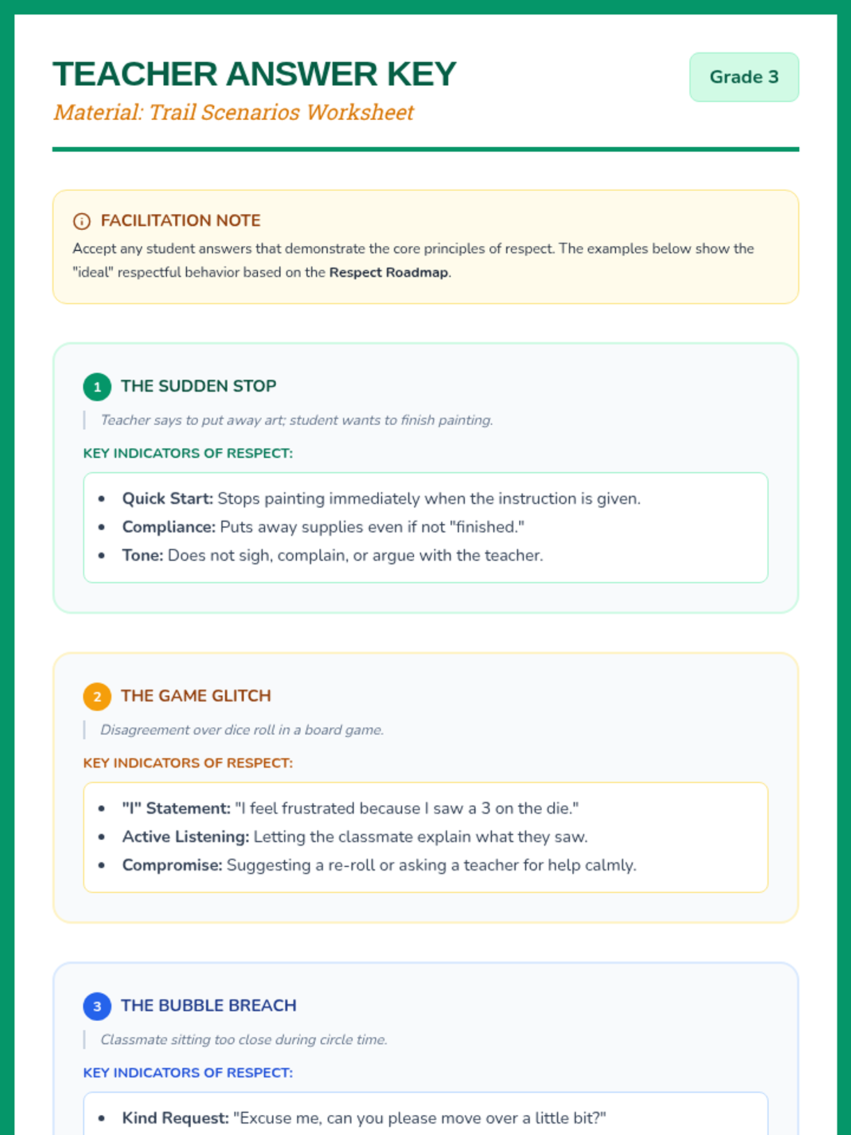 A comprehensive 3rd-grade lesson focusing on three pillars of respect: following directions, handling disagreements, and respecting personal space through interactive role-playing and scenario analysis.