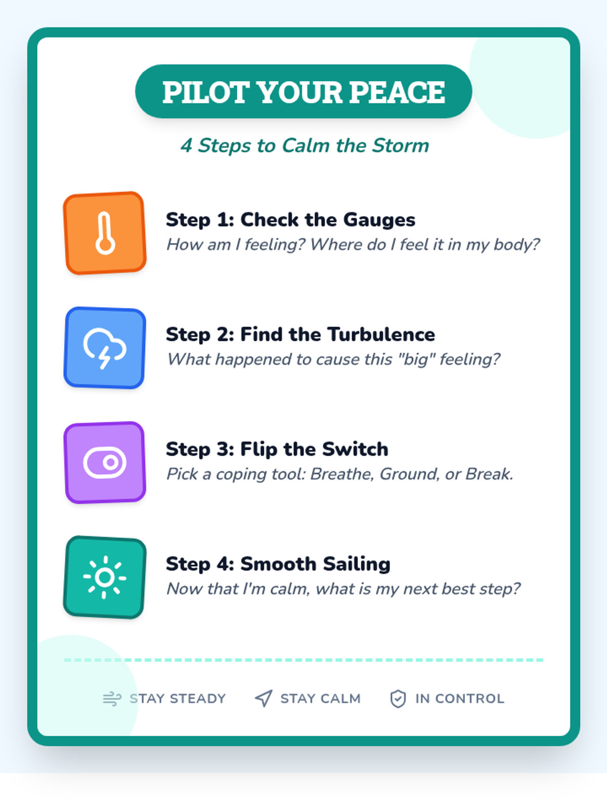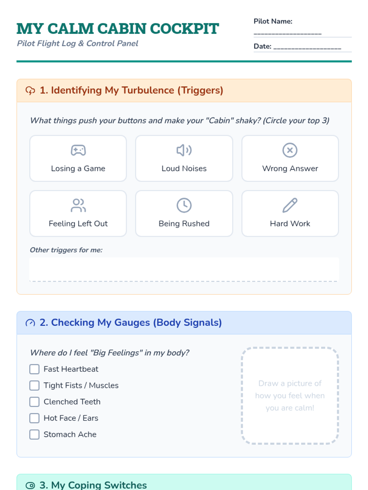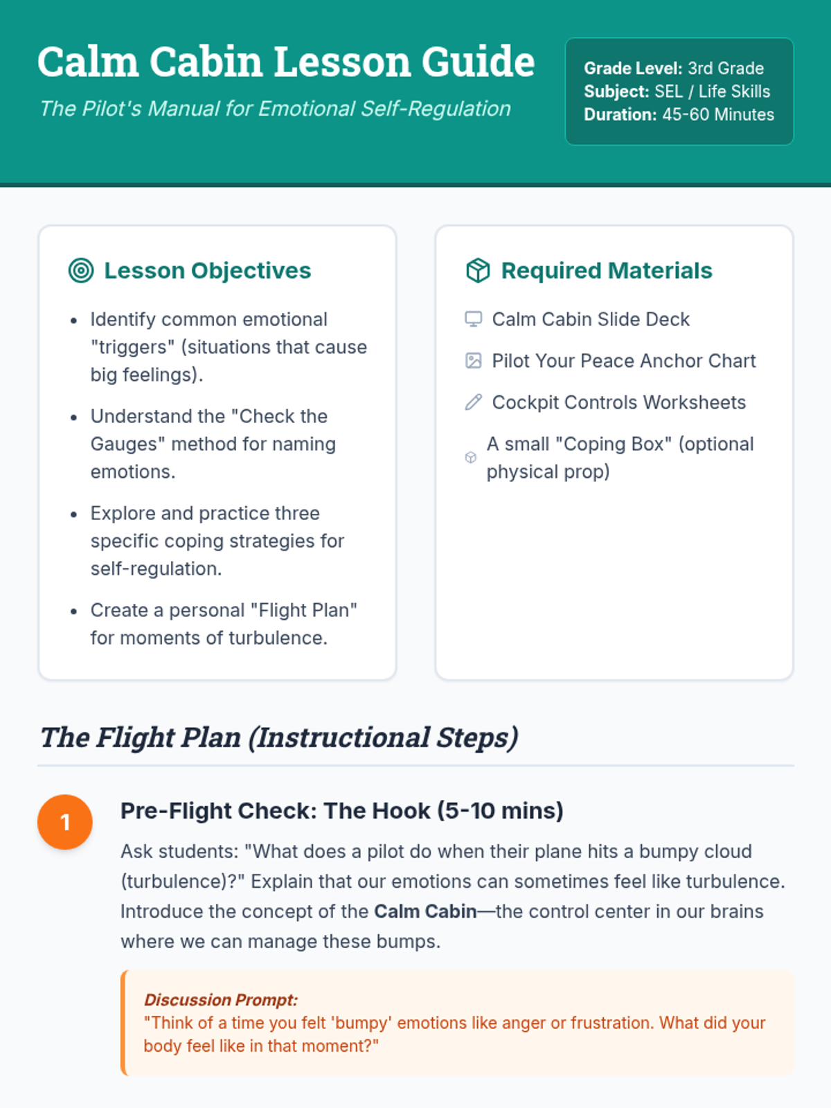 A comprehensive lesson on emotional self-regulation for 3rd graders, focusing on identifying triggers and building a personal toolkit of coping strategies through a pilot-themed 'Control Cabin' metaphor.