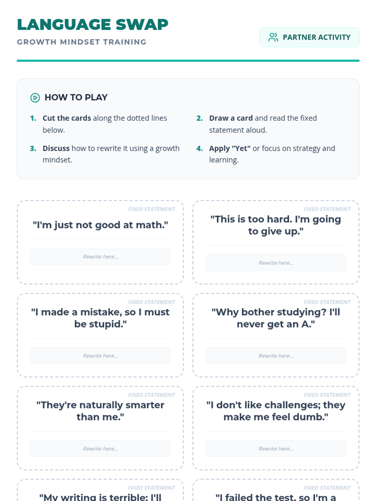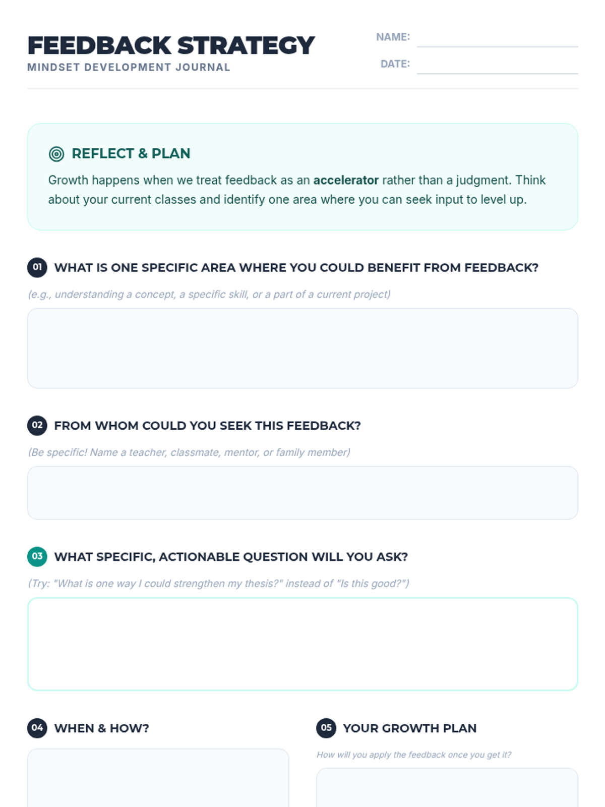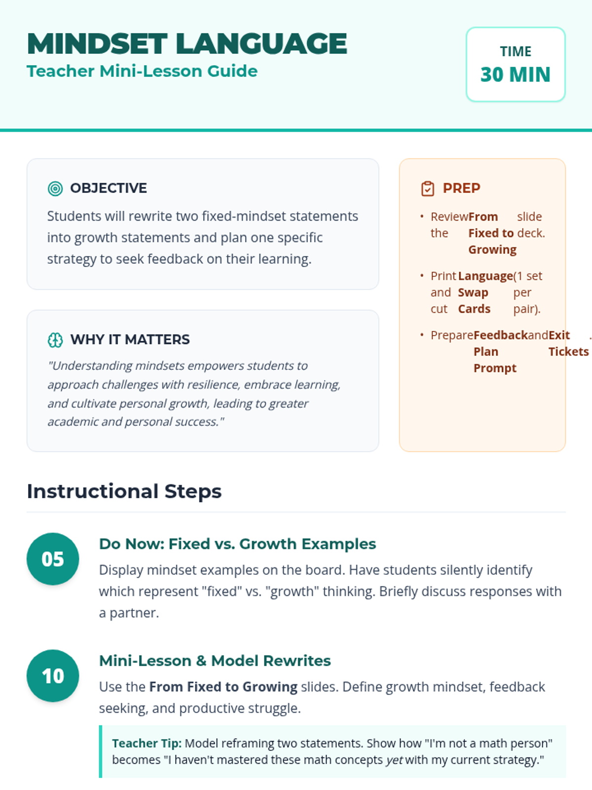 A 30-minute lesson for 10th graders to distinguish between fixed and growth mindsets, practice reframing challenges, and develop specific strategies for seeking feedback to accelerate learning.