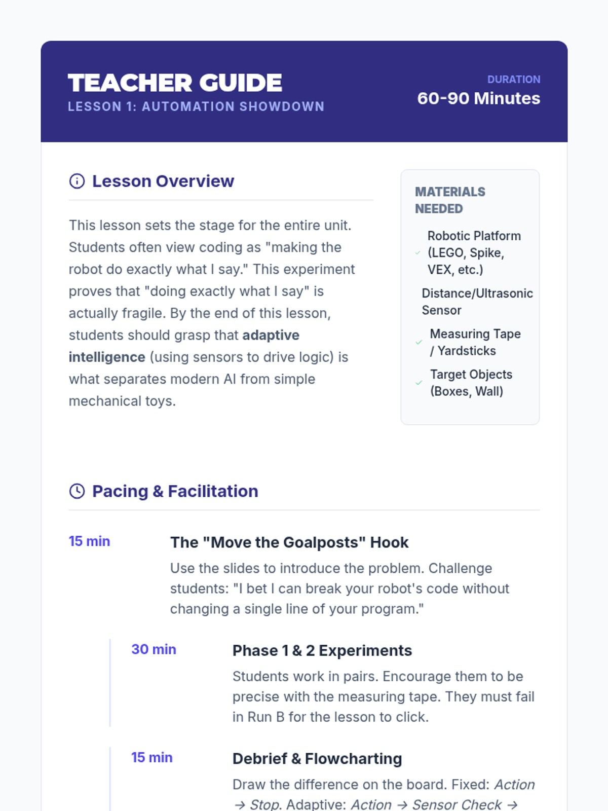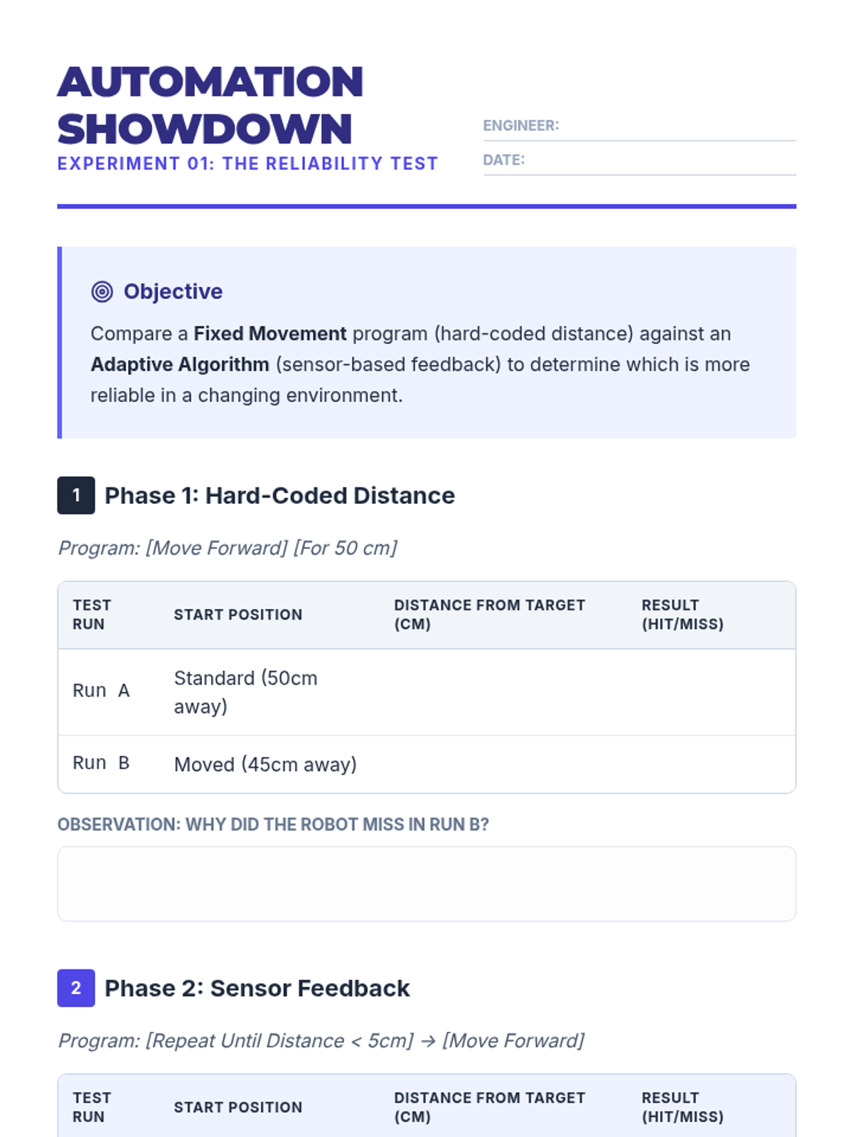 Students compare hard-coded movement versus sensor-based feedback to understand why adaptive algorithms are necessary for changing environments.