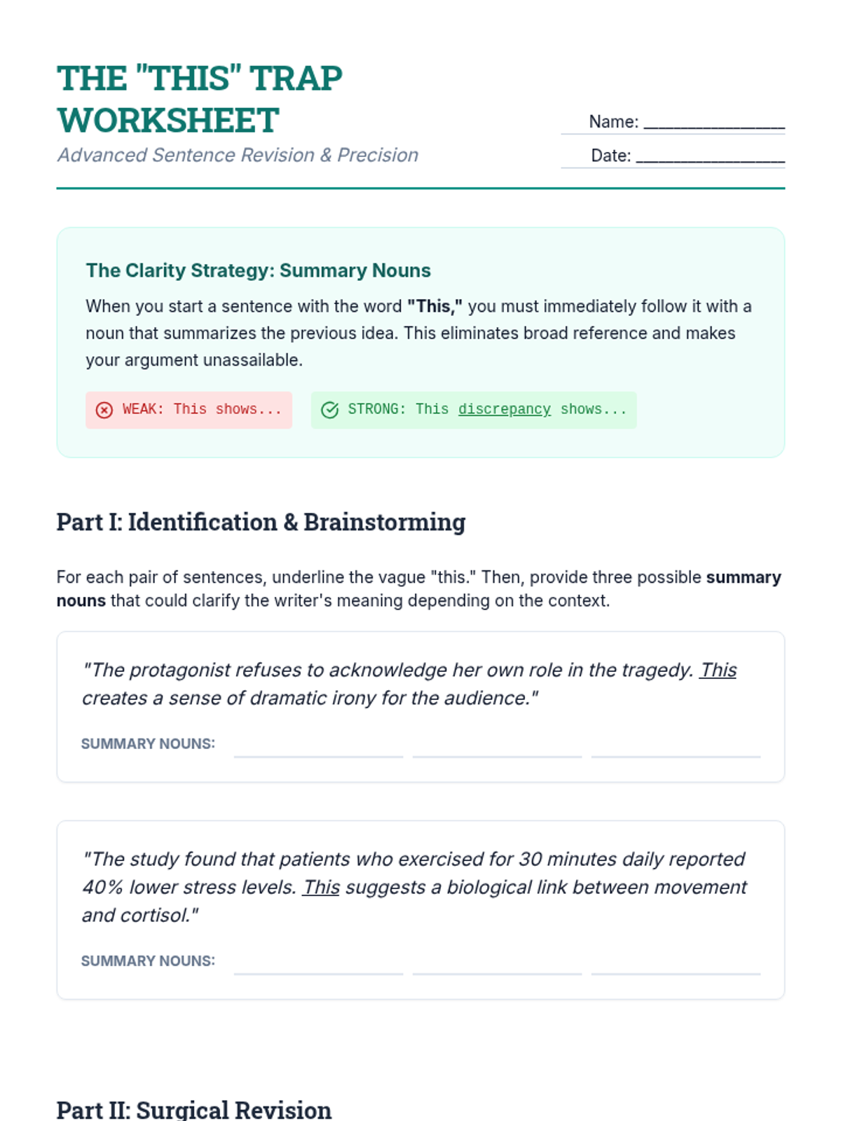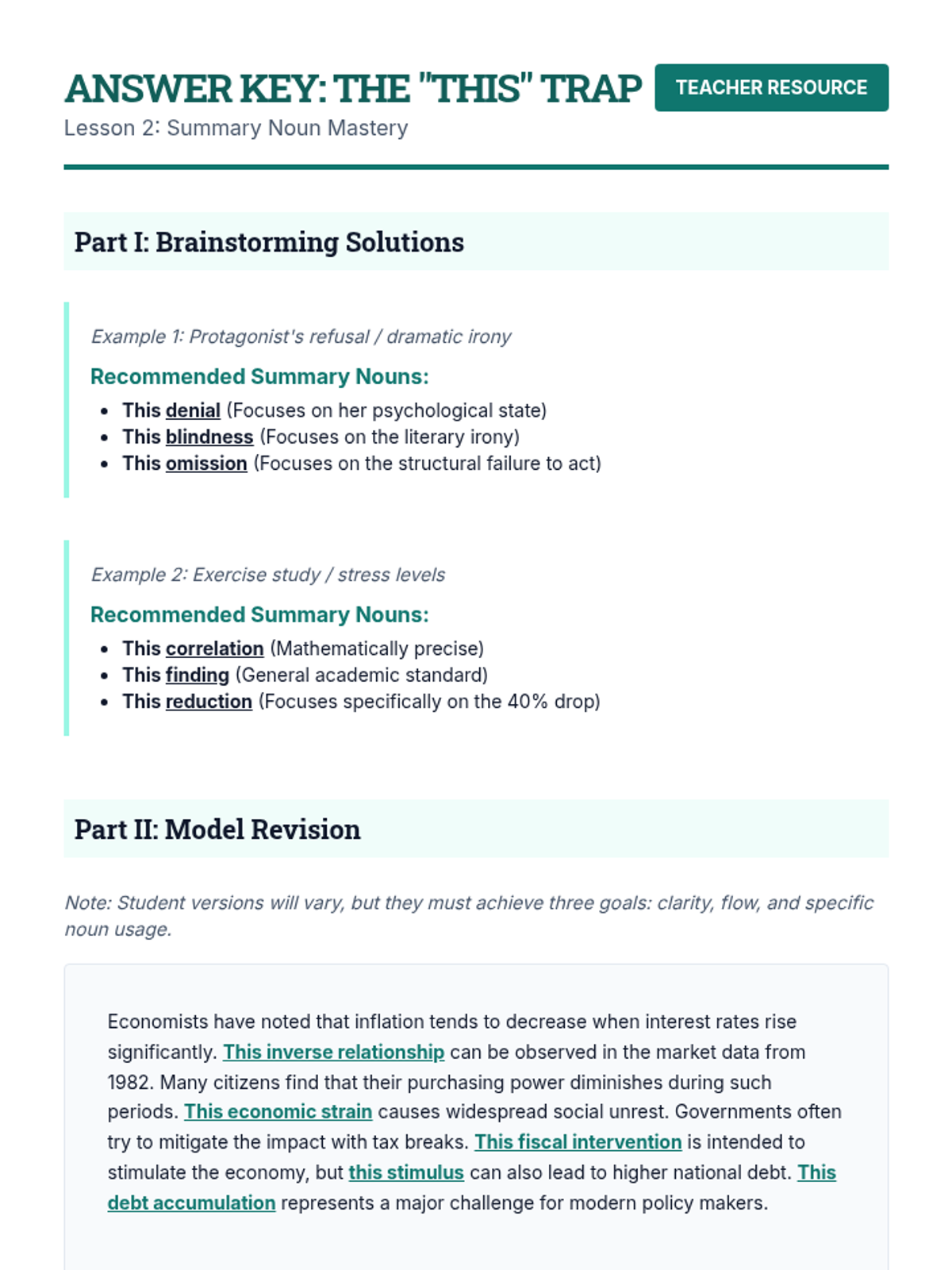 Students learn the 'summary noun' strategy to fix broad references, practicing the replacement of vague 'this' starts with specific noun phrases to improve sentence flow and precision.