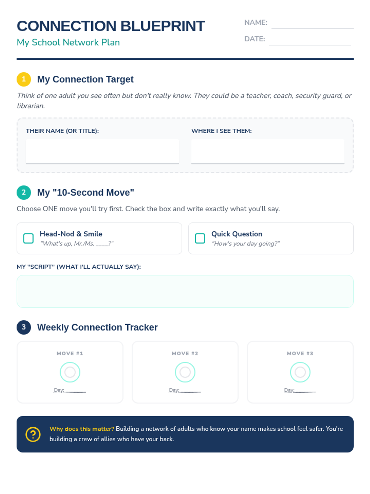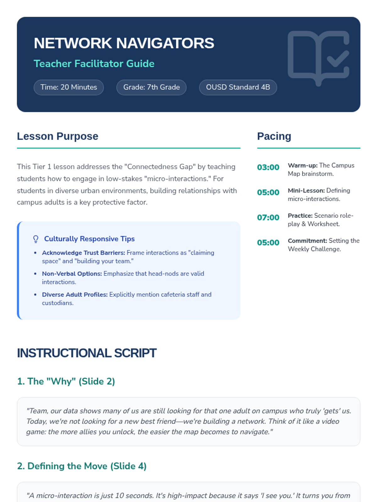 A 20-minute SEL lesson focused on building school connectedness through small, low-stakes interactions with campus adults, aligned with OUSD Standard 4B.