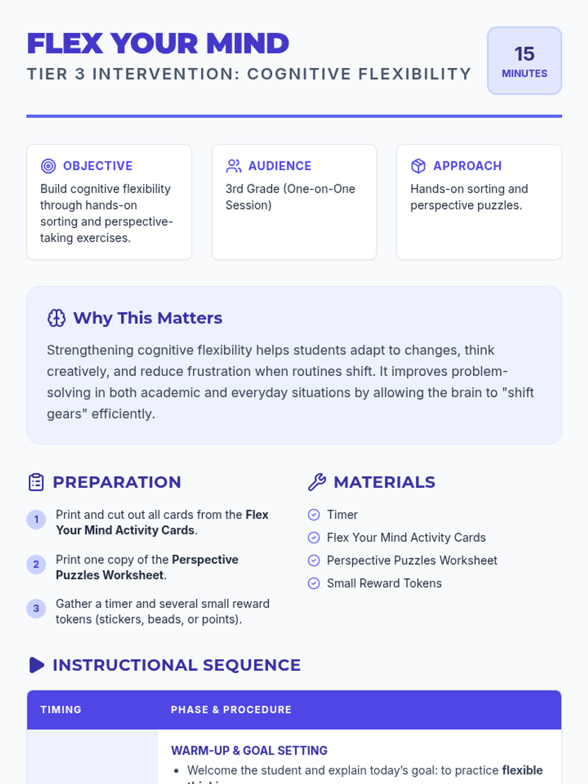 A short, high-intensity Tier 3 intervention for 3rd graders focusing on cognitive flexibility. Through hands-on sorting and perspective-taking exercises, students learn to adapt to change and see multiple solutions to problems.