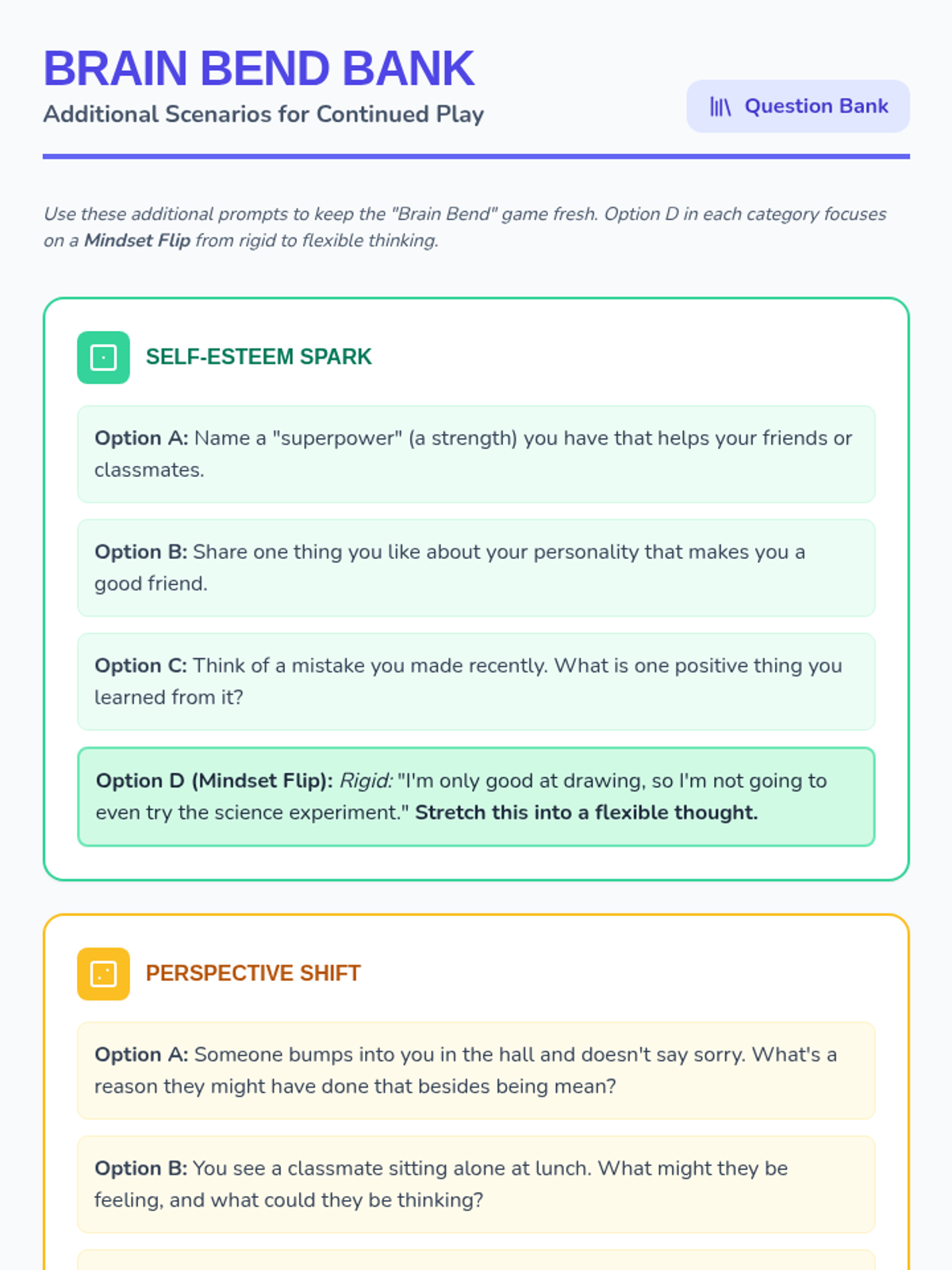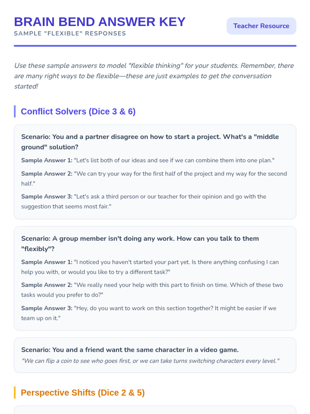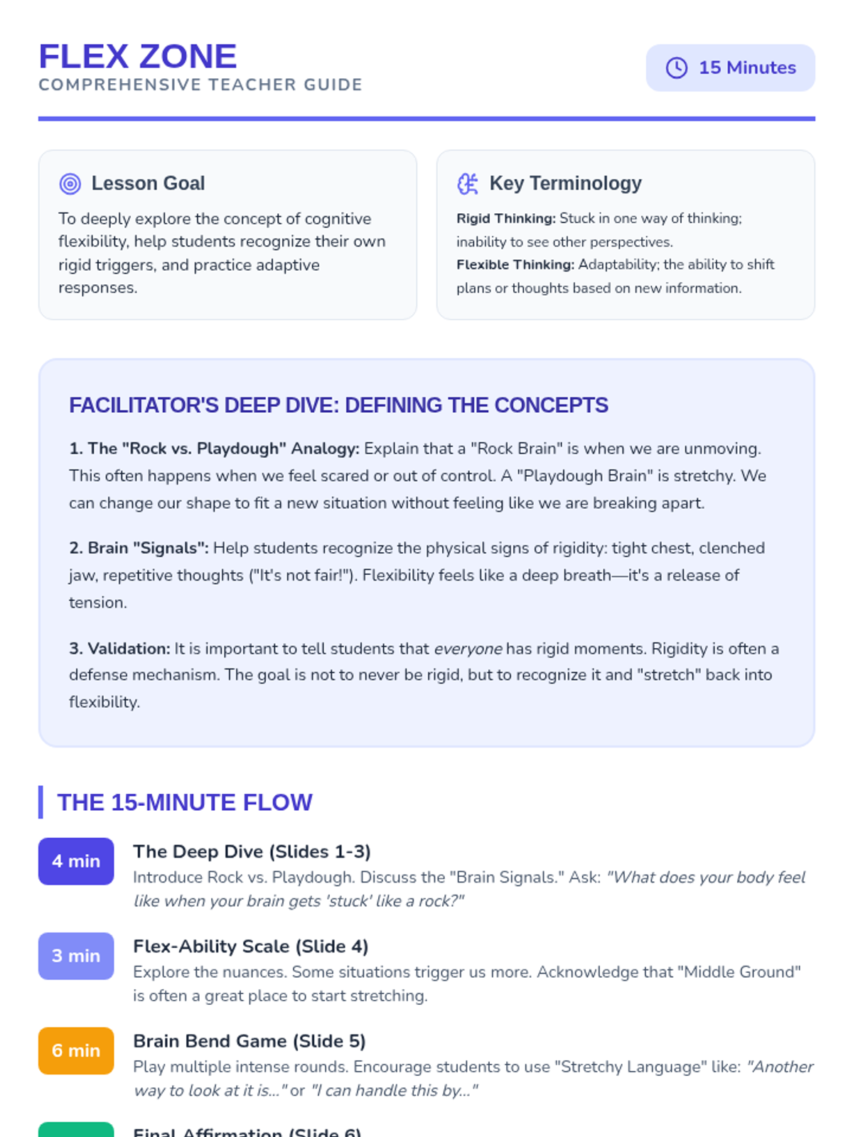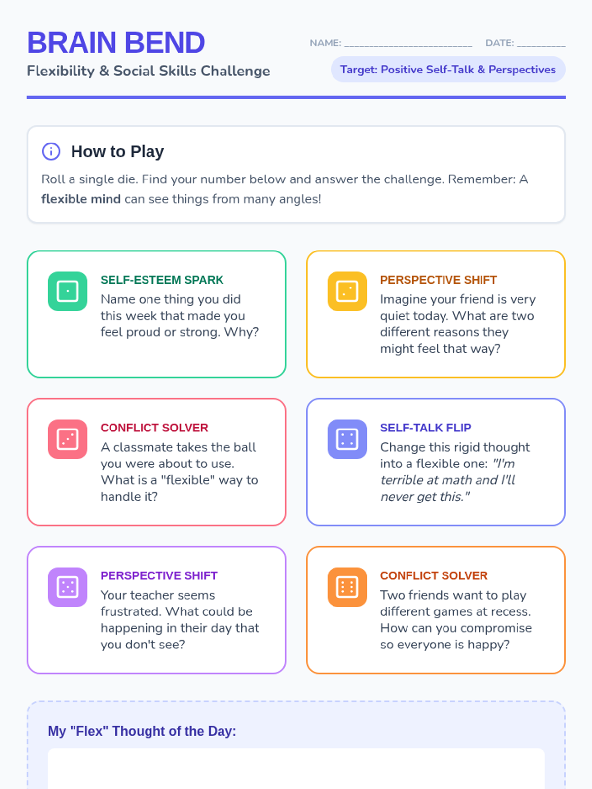 A 10-minute small group session focusing on the difference between rigid and flexible thinking, featuring multiple rounds of a dice-based social skills game and deeper reflection.