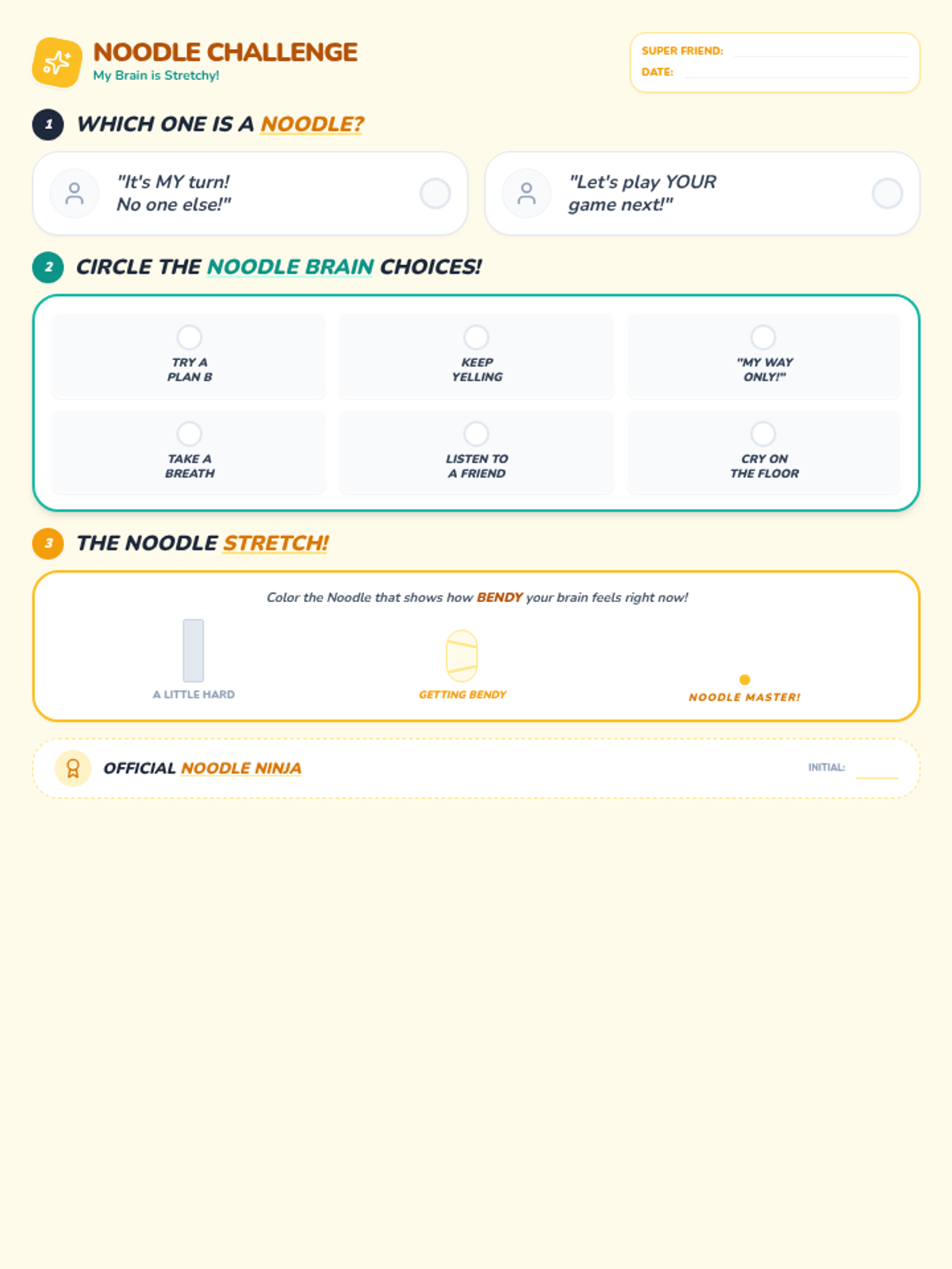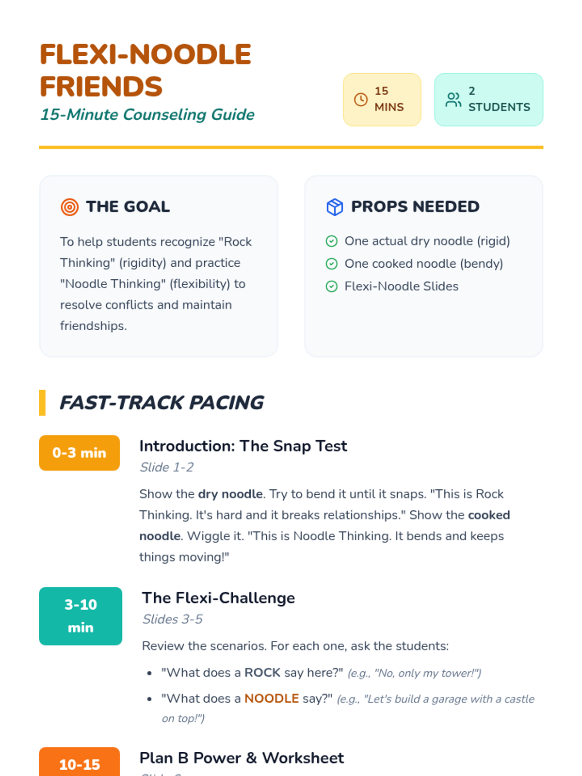 A short, high-energy 15-minute counseling session for 1st graders focused on transition from 'Rock Thinking' (rigid) to 'Noodle Thinking' (flexible) to improve peer interactions and problem-solving.