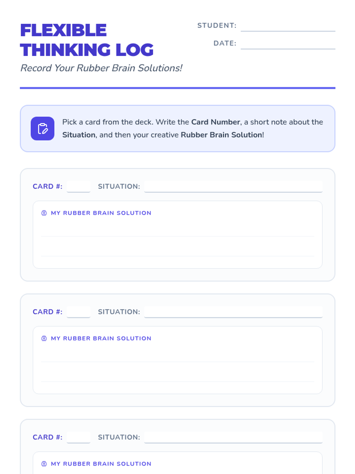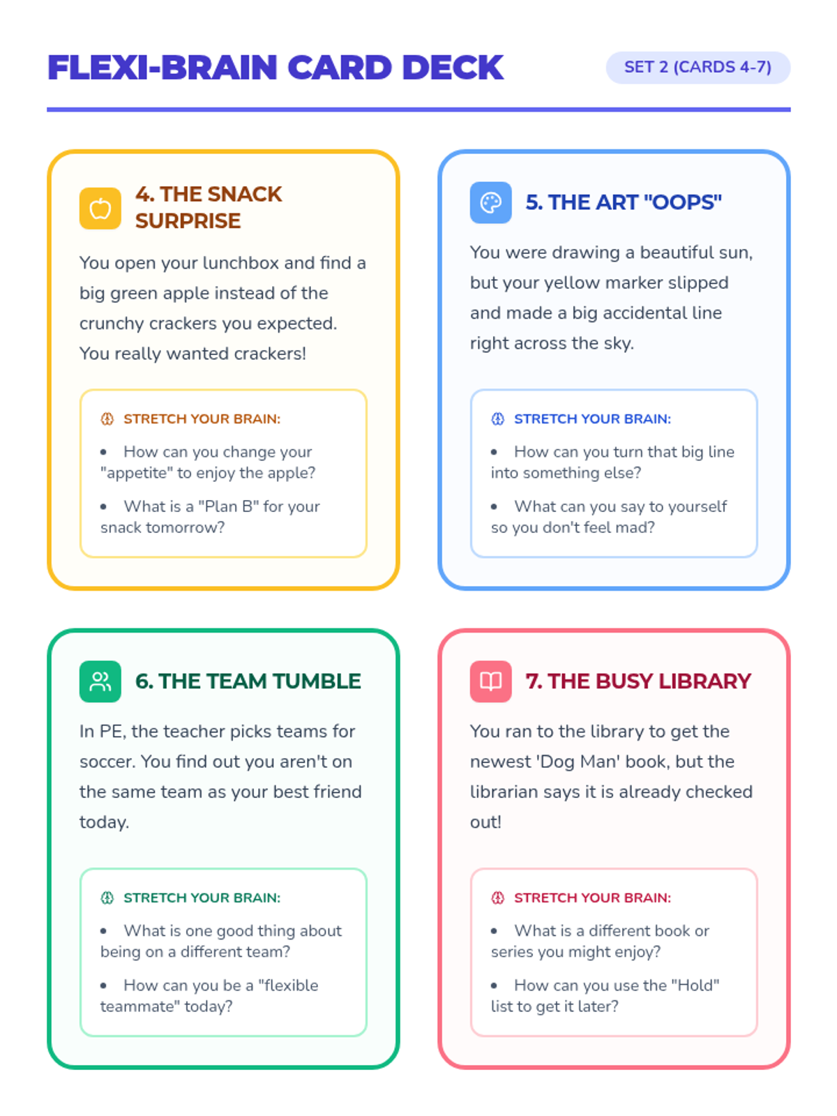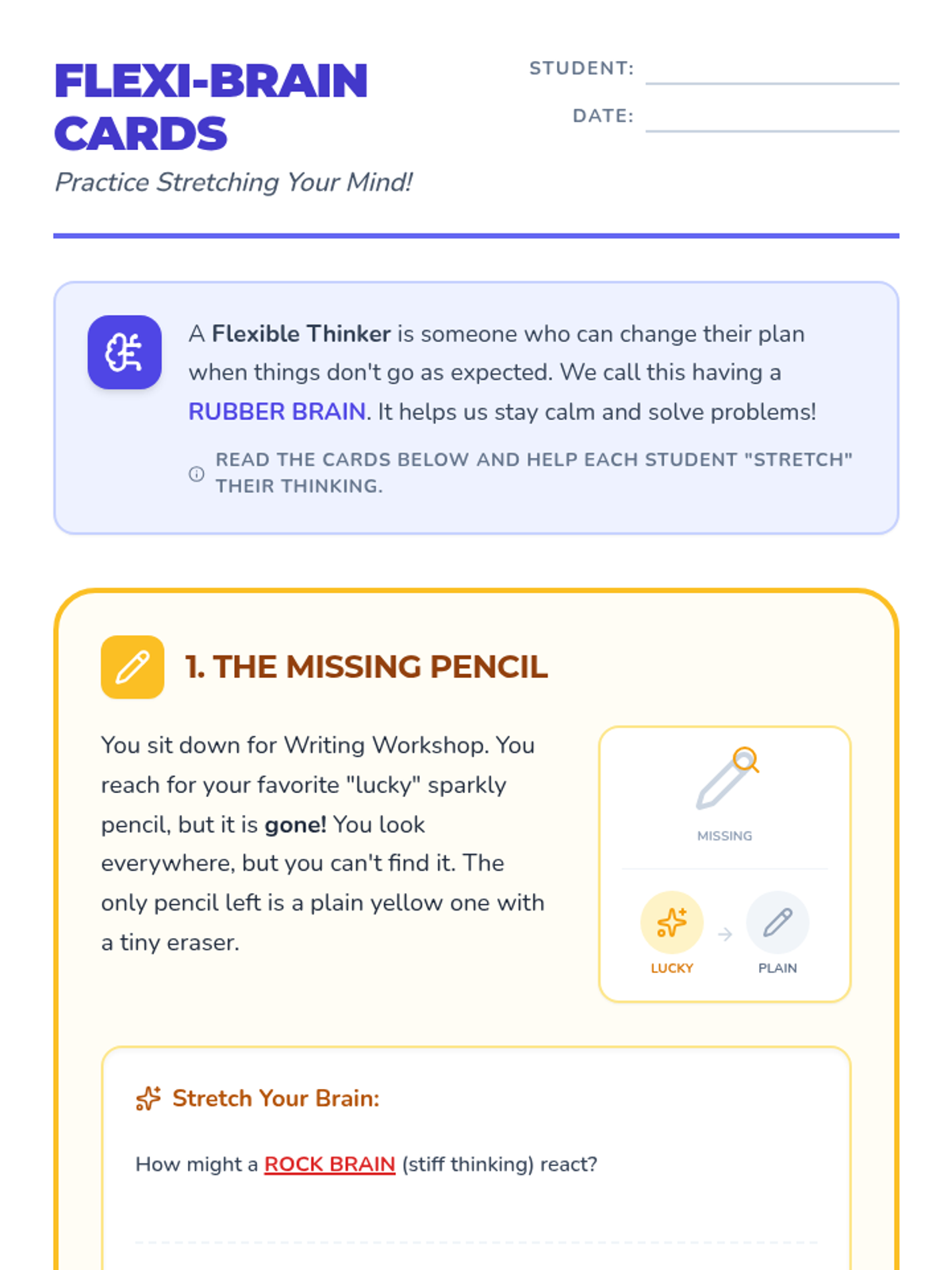 A lesson focused on teaching second graders the concept of flexible thinking (Rubber Brain vs. Rock Brain) through real-world school scenarios and problem-solving activities.