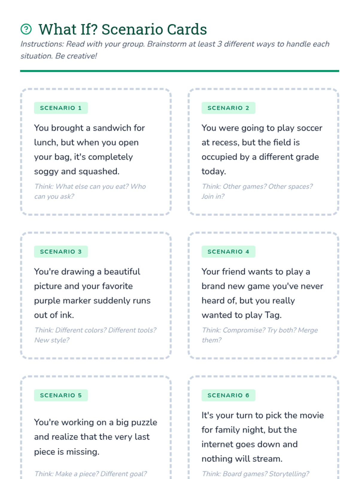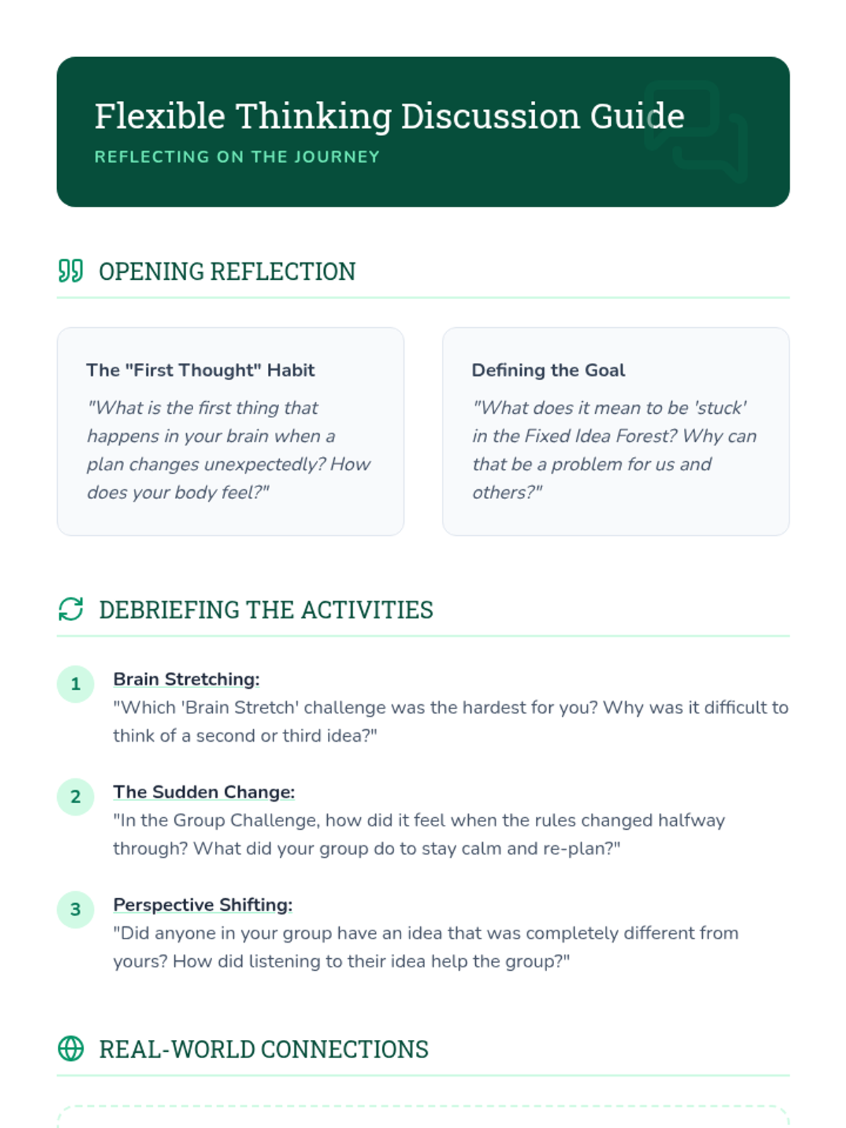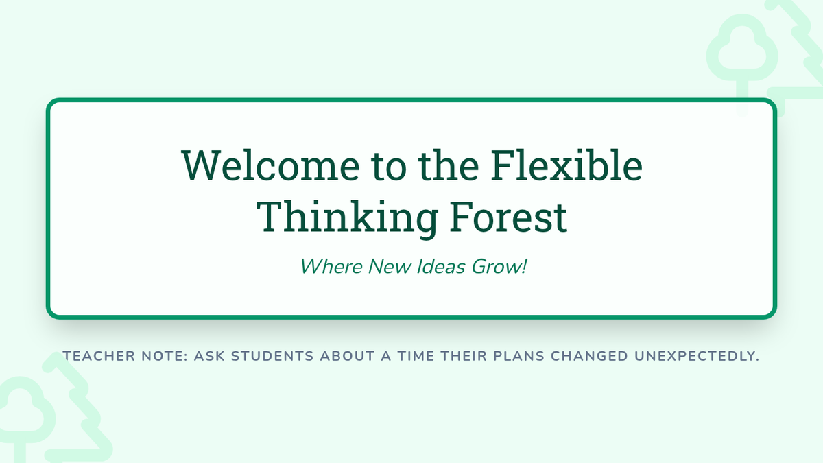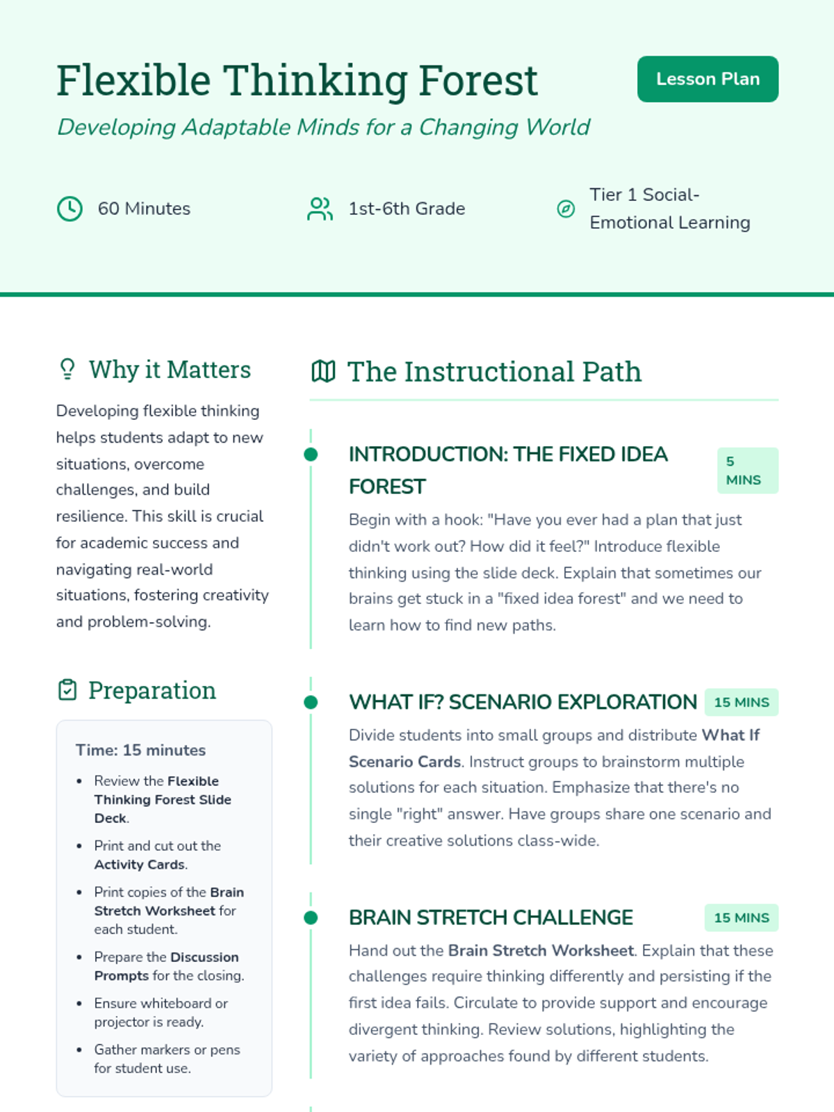 A 60-minute session for 1st-6th graders focused on developing adaptable thinking skills, perspective-shifting, and managing frustration through a forest-themed exploration.